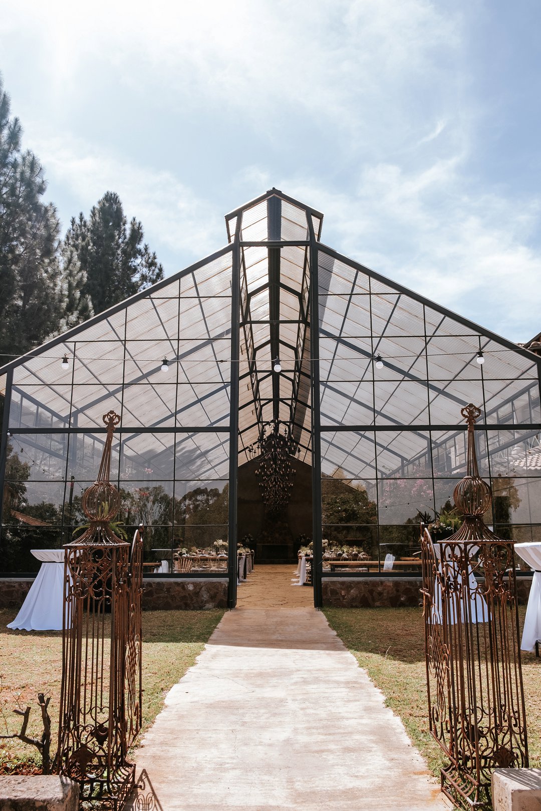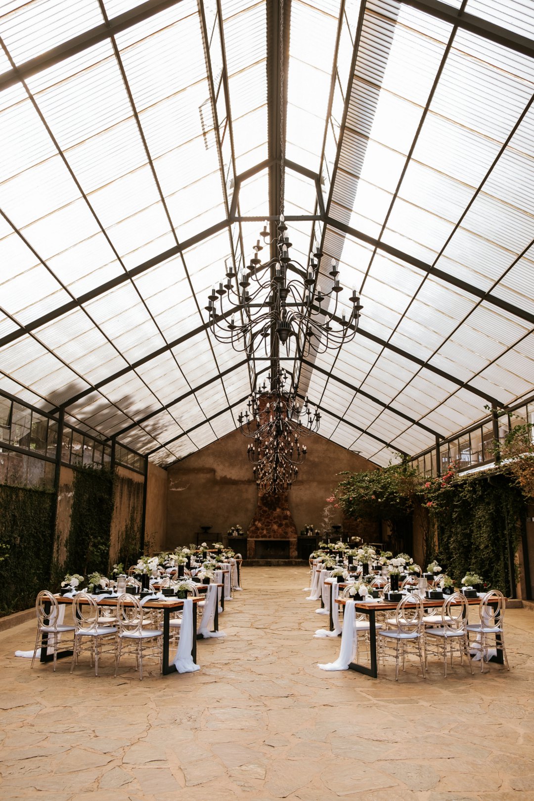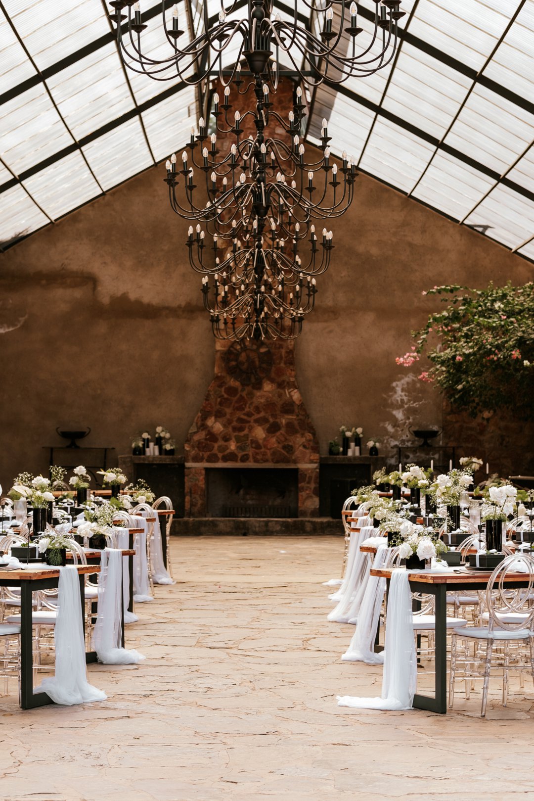 Die onthaal lokaal was in ʼn dubbel volume groot glaskas trou venue, met ʼn amper kweekhuis gevoel. Elaine en Ampie se trou gaste kon die omliggende natuurskoon uitsigte vanuit die onthaal lokaal geniet.