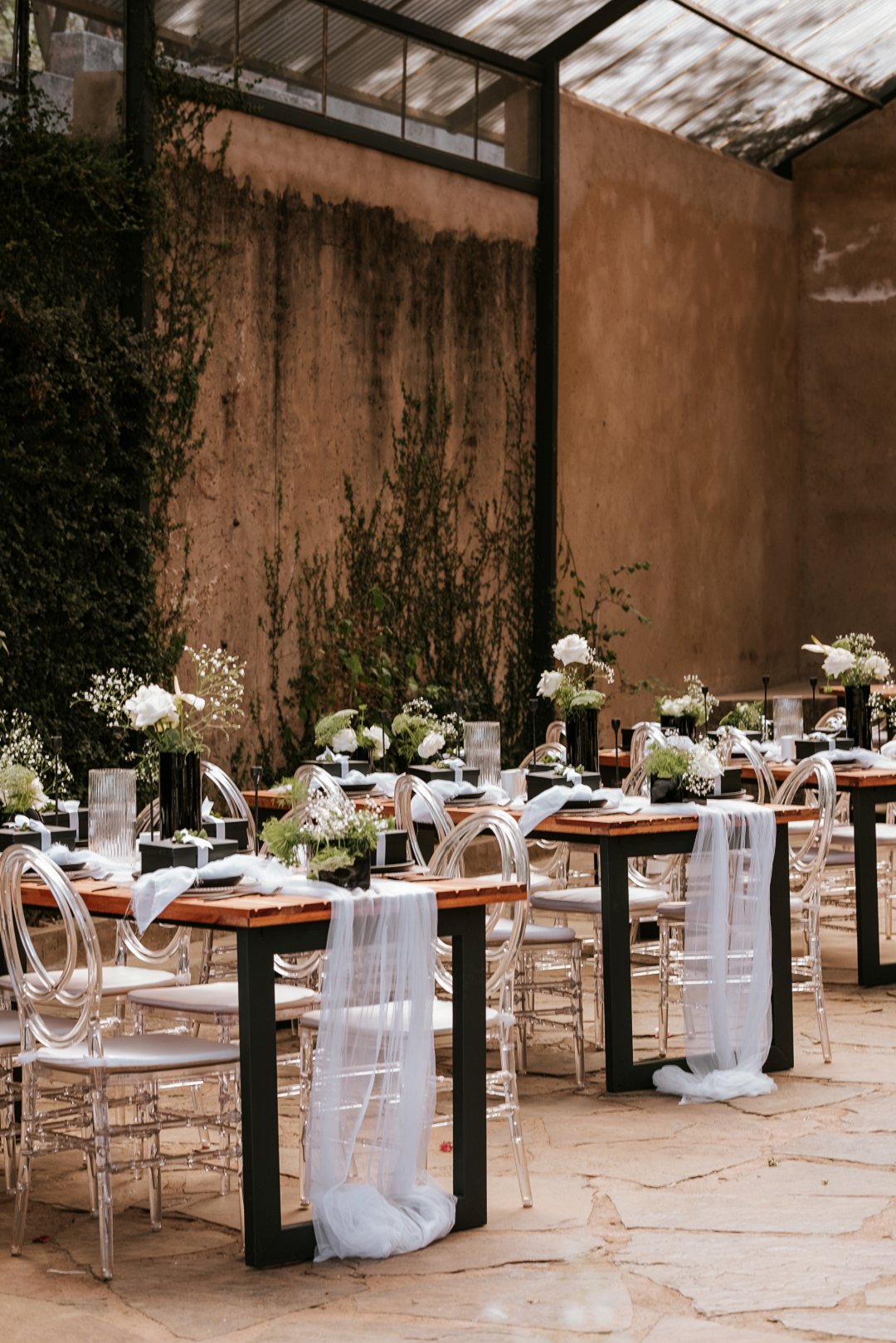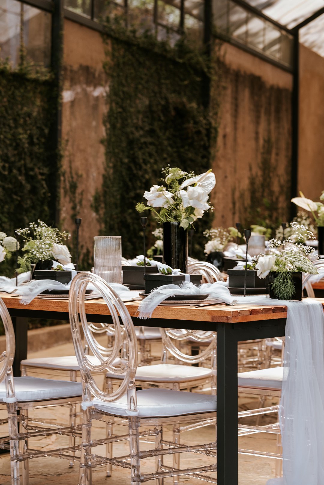 Die dekor en kleurskema het ons eenvoudig en stylvol gehou. Kleurskema was wit en swart. Dekor, elegant en stylvol. Hout, wit en swart, baie groenigheid en wit blomme. Kerse het die atmosfeer natuurlik romanties en elegant gehou.