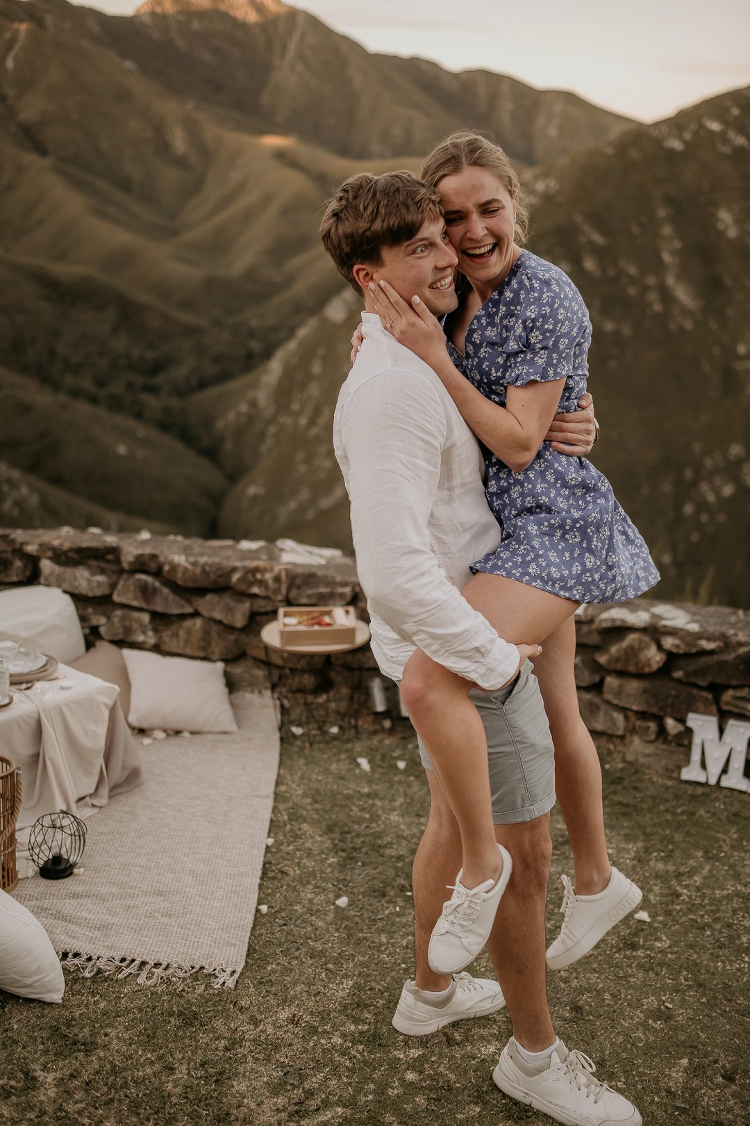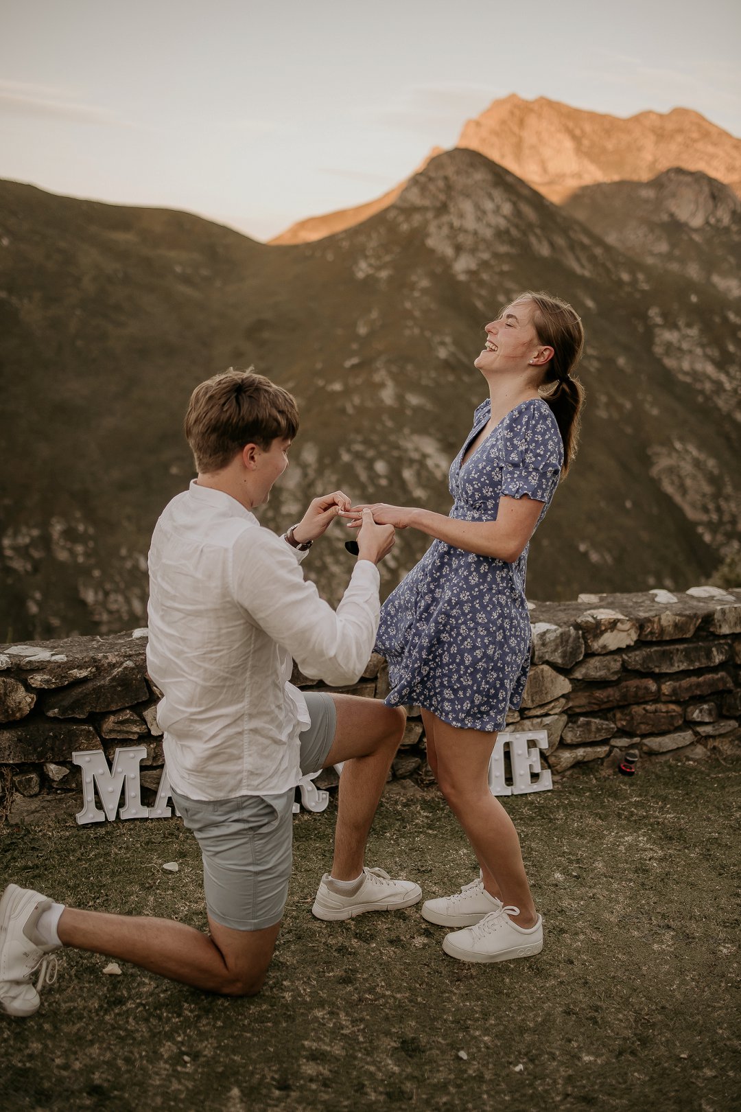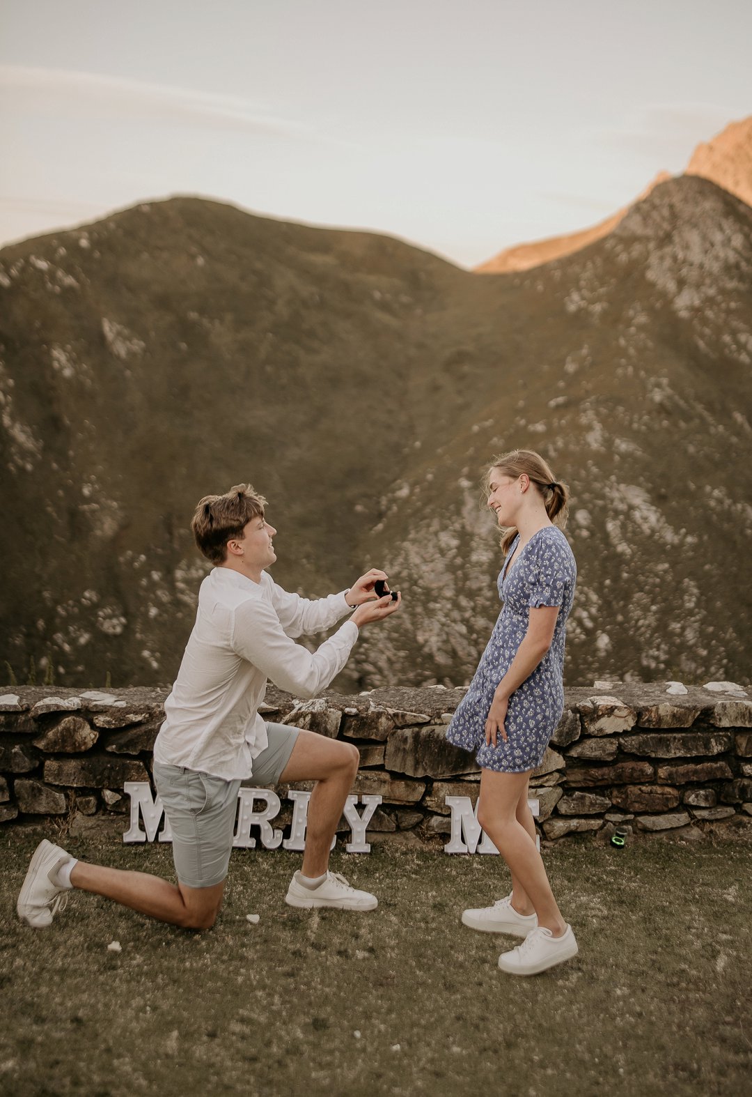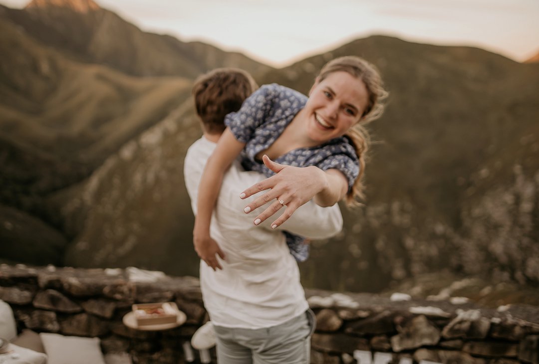 Hy het later begin lag en met trane in sy oë vir my gesê dat oor 4 minute gaan ons arriveer by die plek en dat ek agter my sitplek moet kyk … Daar was klere en grimmering om myself gou in 4 minute reg te kry. Ek het oor geklim na die agterste sitplek en vinnig probeer red wat te redde was. Ons het op die mooiste plek gekom en hy het op een knie gegaan en met die mooiste ring my hand gevra.