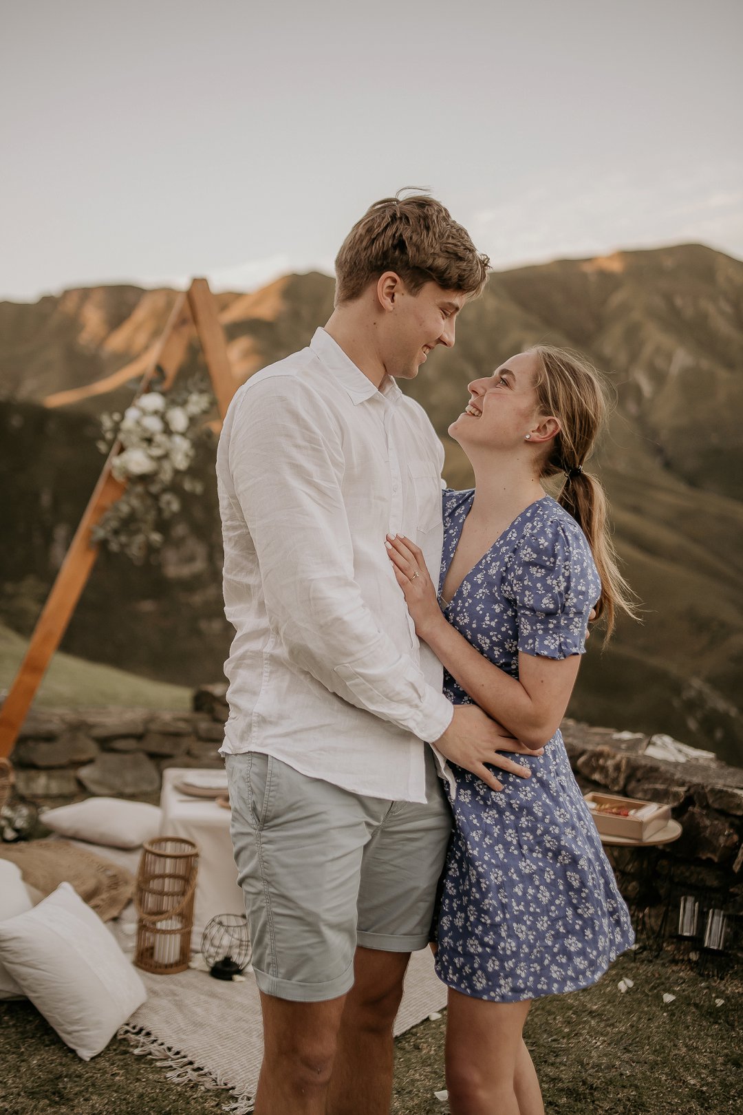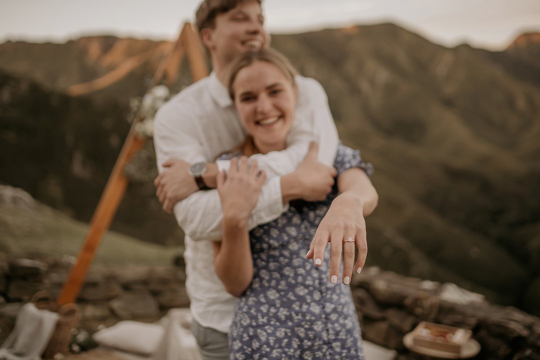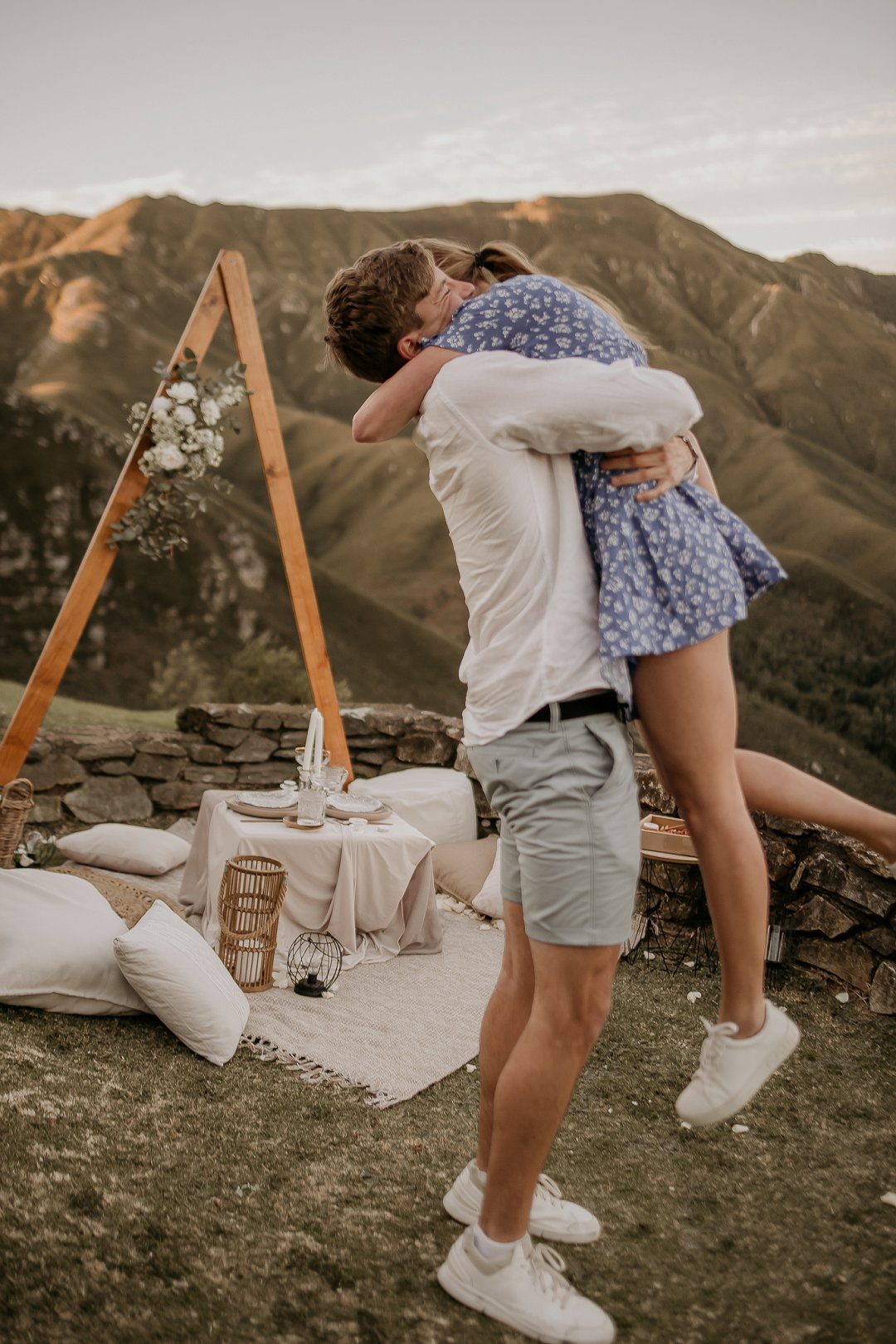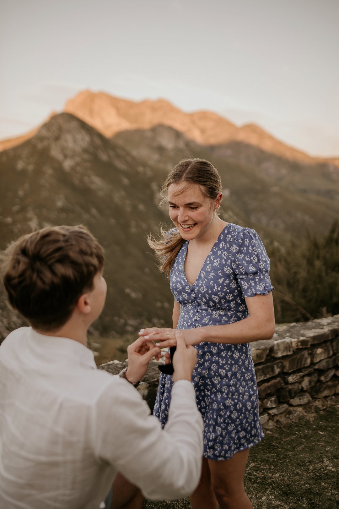 Hy het later begin lag en met trane in sy oë vir my gesê dat oor 4 minute gaan ons arriveer by die plek en dat ek agter my sitplek moet kyk … Daar was klere en grimmering om myself gou in 4 minute reg te kry. Ek het oor geklim na die agterste sitplek en vinnig probeer red wat te redde was. Ons het op die mooiste plek gekom en hy het op een knie gegaan en met die mooiste ring my hand gevra.