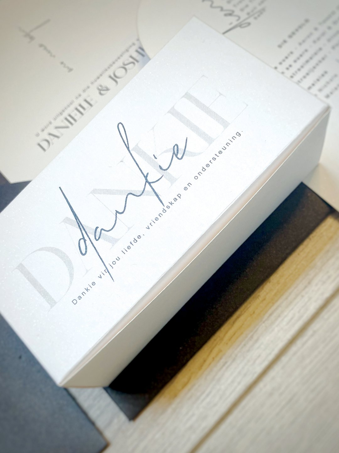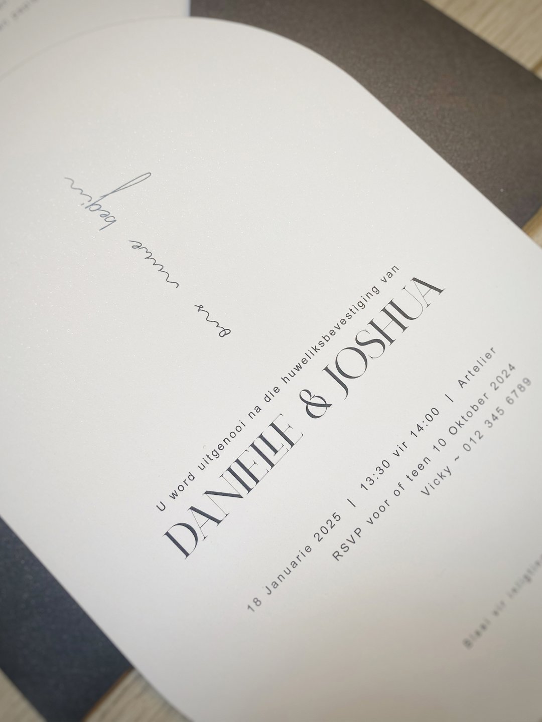 Die kern van hierdie betowerende samestelling, is die uitnodiging, die eerste smaak oor die styl en atmosfeer van dié viering. Gemaak op ʼn ivoor, glinsterende papier, spog die uitnodiging met ʼn boog ontwerp en ʼn baie eenvoudige, skoon, tog elegante ontwerp in swart, wat sorg vir drama en elegansie. Die romantiese, sagte lettertipe bring ʼn poëtiese aanslag by die stel. Vir ʼn gesofistikeerde afronding, word daar gebruik gemaak van ʼn swart glans koevert.