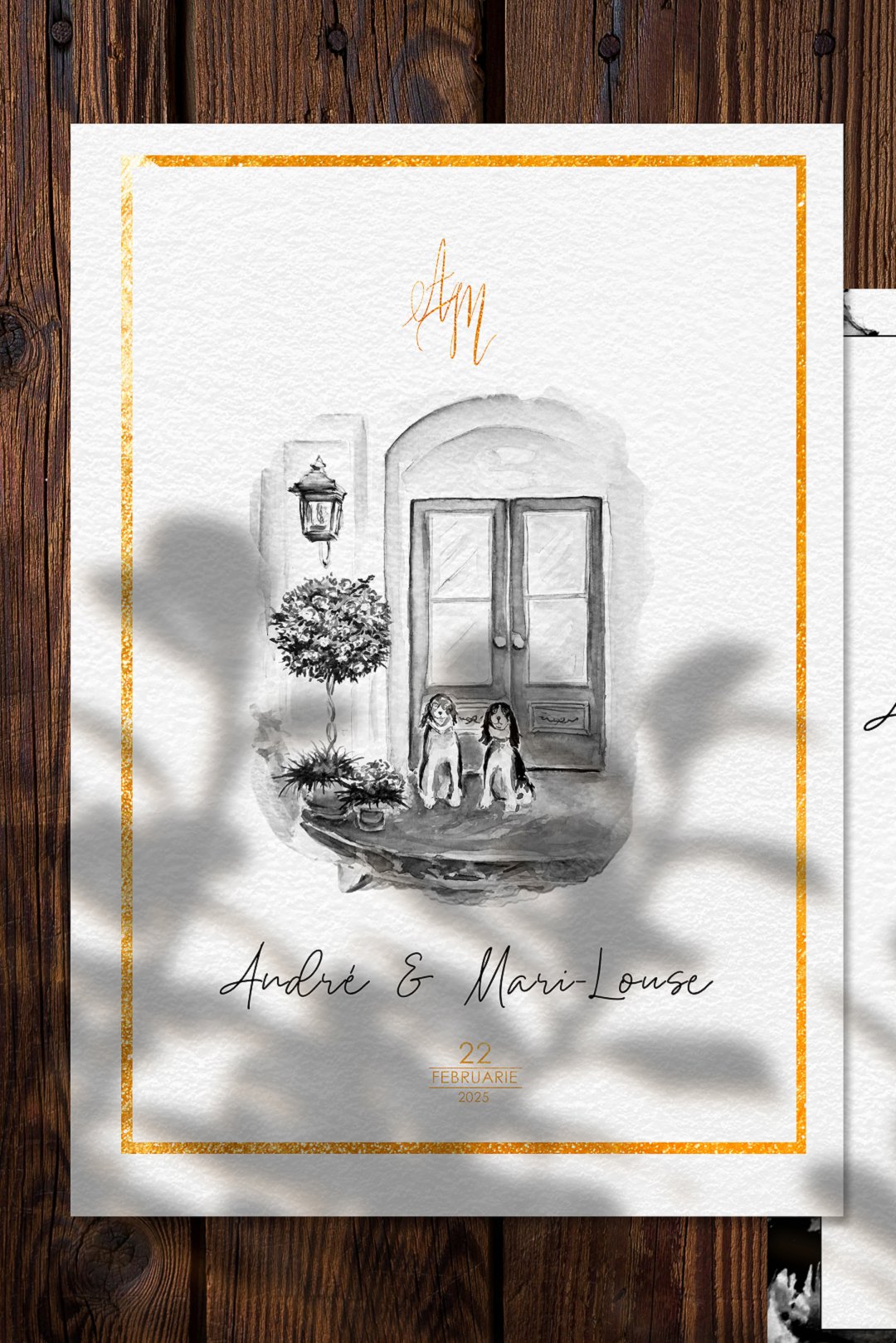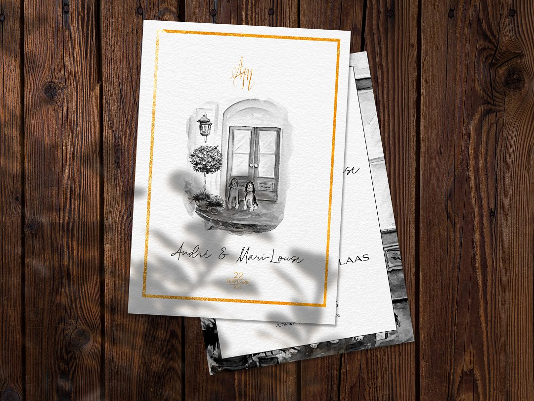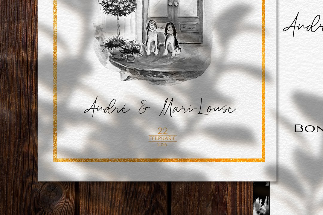 Die ontwerp is ʼn illustrasie van jul troeteldiere en kan so geïnkorporeer word by jul troue se skryfbehoeftes. ʼn Oulike idee sal wees om ʼn foto van al die troeteldiere en julle as paartjie saam te kry. Dan neem julle dit na ʼn kunstenaar wat dit vir julle kan oorsit in ʼn pragtige illustrasie. Baie trou skryfbehoefte ontwerpers kan ook illustrasies doen en sal dit graag wil inkorporeer by jul trou uitnodiging.