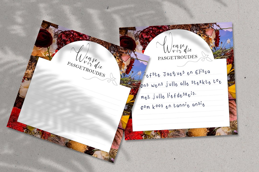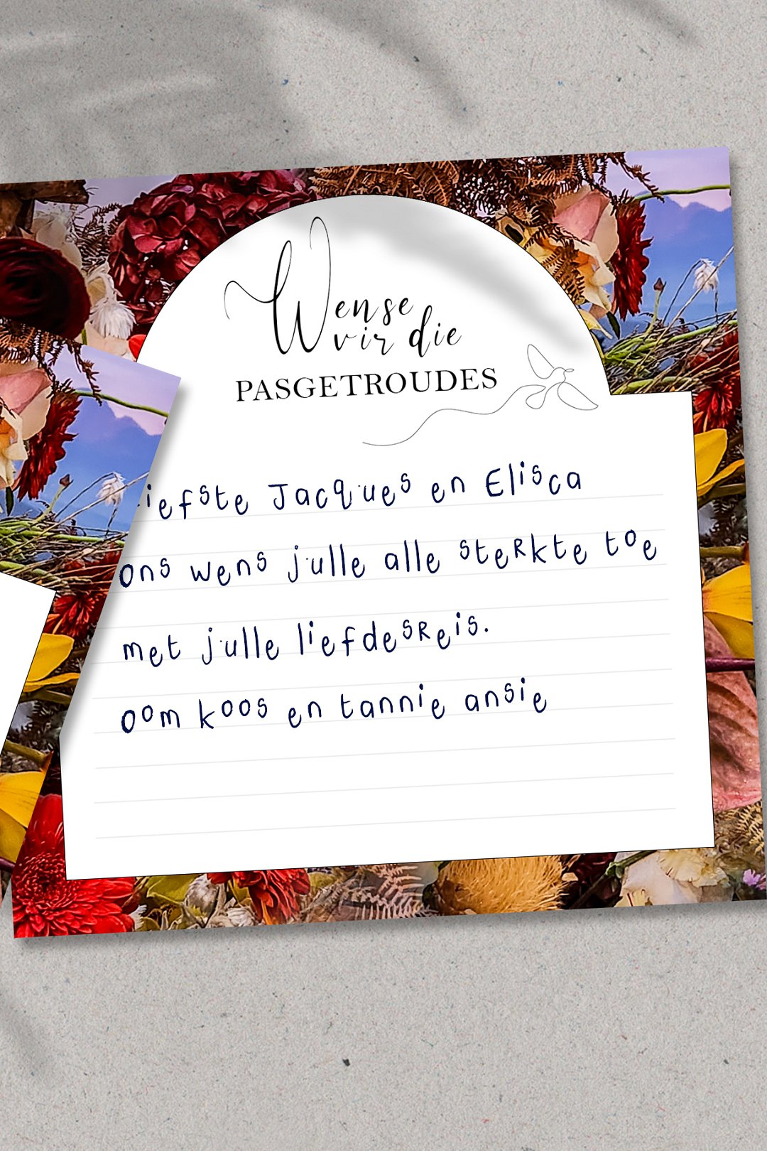 Die Gratis Wense vir die Pasgetroudes Kaartjie is ideaal om spesiale boodskappe van julle trou gaste te onthou. Meeste paartjies het ʼn gasteboek waar hul trou gaste boodskappe kan inskryf. Hierdie is amper dieselfde as ʼn gaste boek, maar net in die vorm van kleiner kaartjies. Trou gaste kan hul boodskap aan die pasgetroudes skryf en die paartjie kan al die boodskappe in ʼn klein boksie sit en na die troue lees.