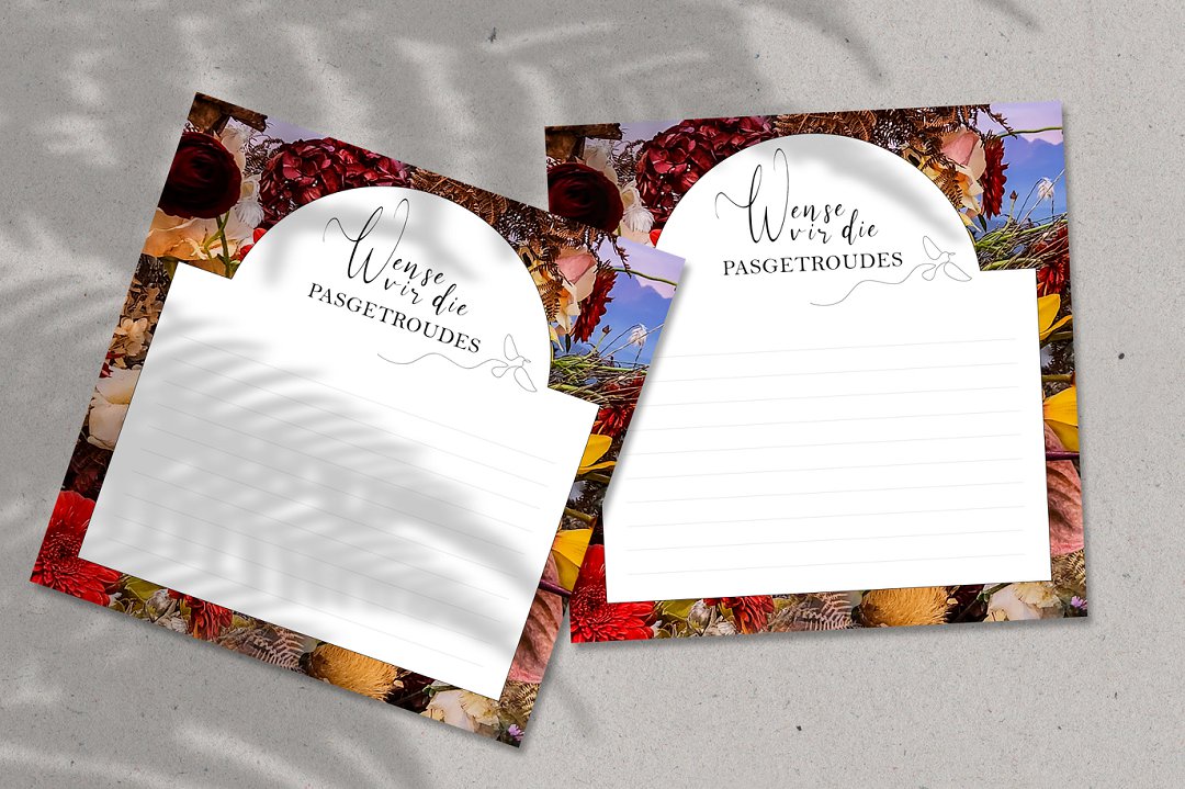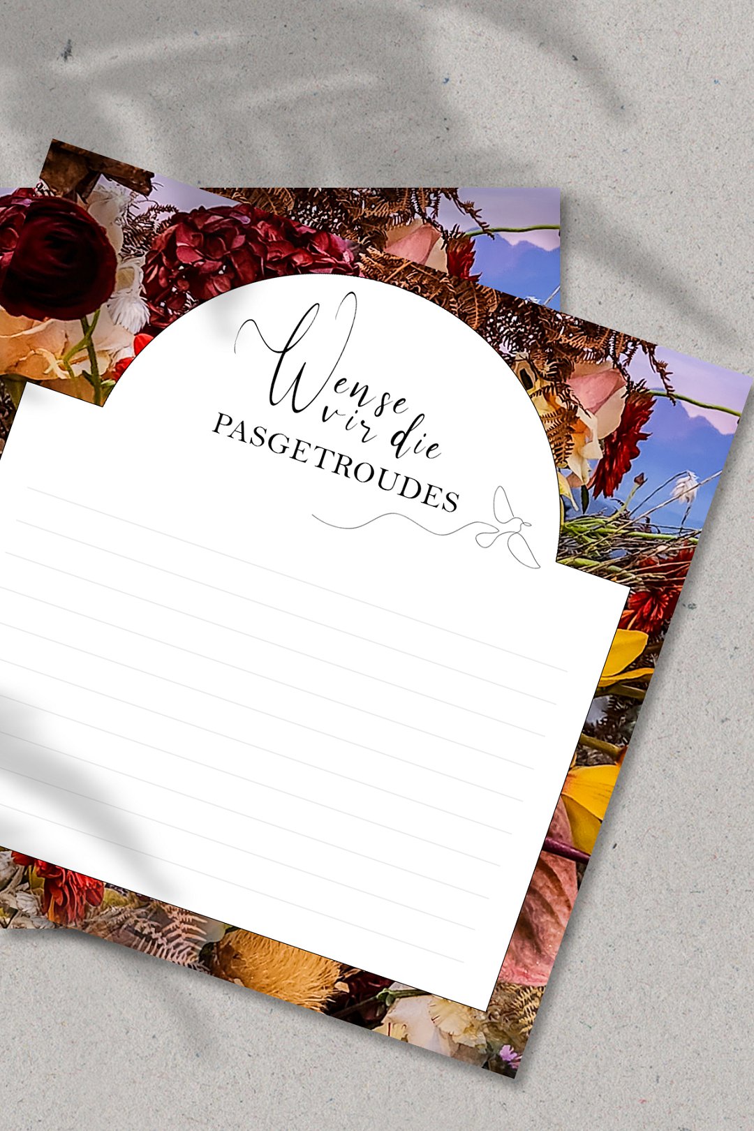 Ons het ook ʼn groot verskeidenheid gratis aflaaibare trou skryfbehoeftes beskikbaar. Jy kan gratis vanaf Mooi Troues aflaai, laat druk en vir jou troudag gebruik. Klik hier om te kyk na ons gratis skryfbehoeftes.