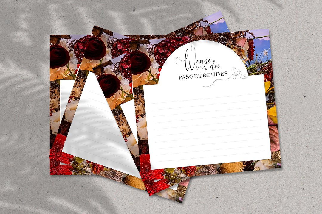 Jy kan kies en keur tussen honderde verskillende trou uitnodigings, spyskaarte, naam kaartjies en vele ander items. Indien jy opsoek is na skryfbehoefte ontwerpers wat Mooi Troues aanbeveel, klik hier om ons Trougids te besoek.