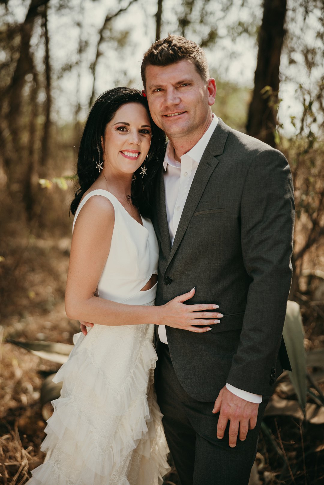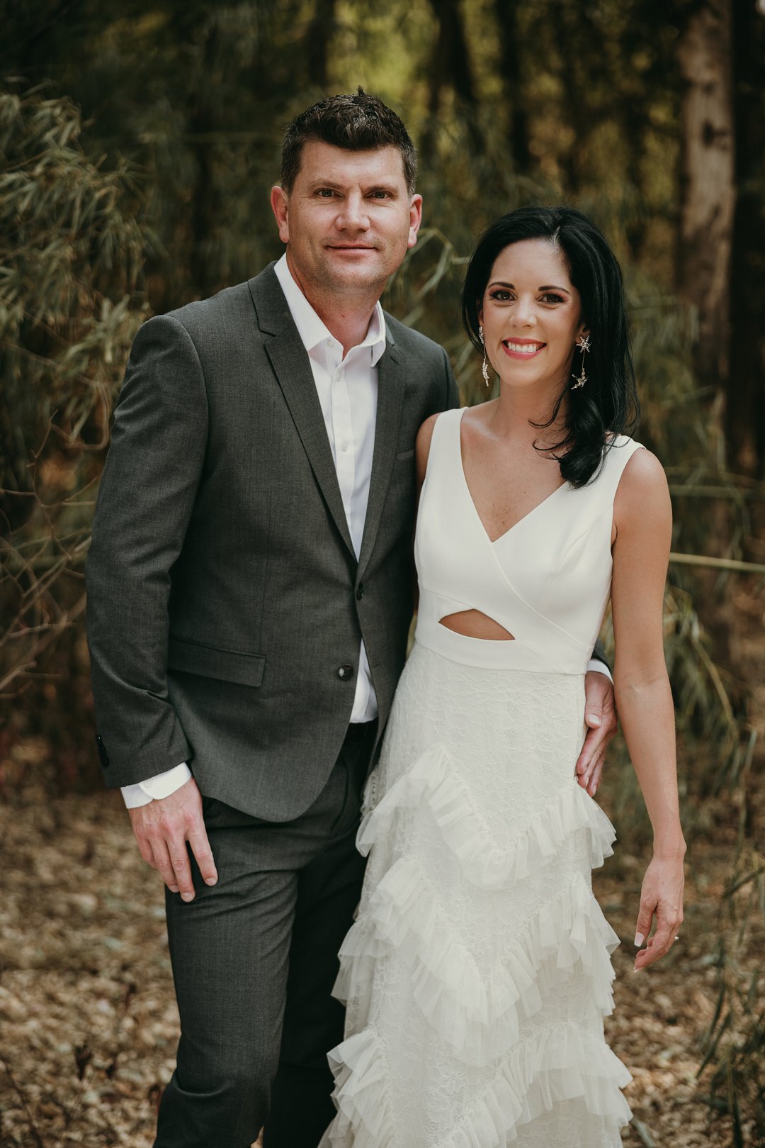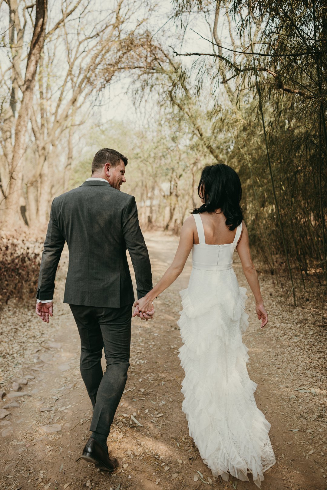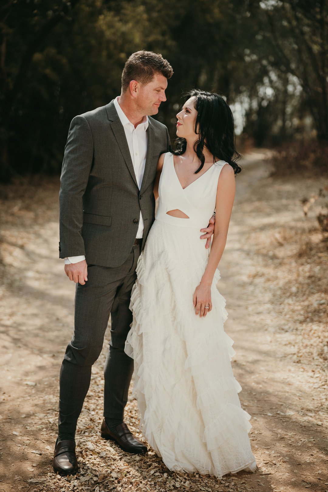 Ons is totaal en al verlief op Leanie se pragtige trourok wat sy gekoop het in Dubai. Die trourok het ʼn simplistiese styl bo en die room kleurige riffels aan die rok gee dit ʼn deftige en interessante voorkoms. Leanie se helder lipstiffie het net daai ekstra tikseltjie elegansie gegee. JJ het ʼn ontspanne, maar nogsteeds deftige voorkoms gehad met sy donker grys pak, en knopies wit hemp sonder ʼn das.