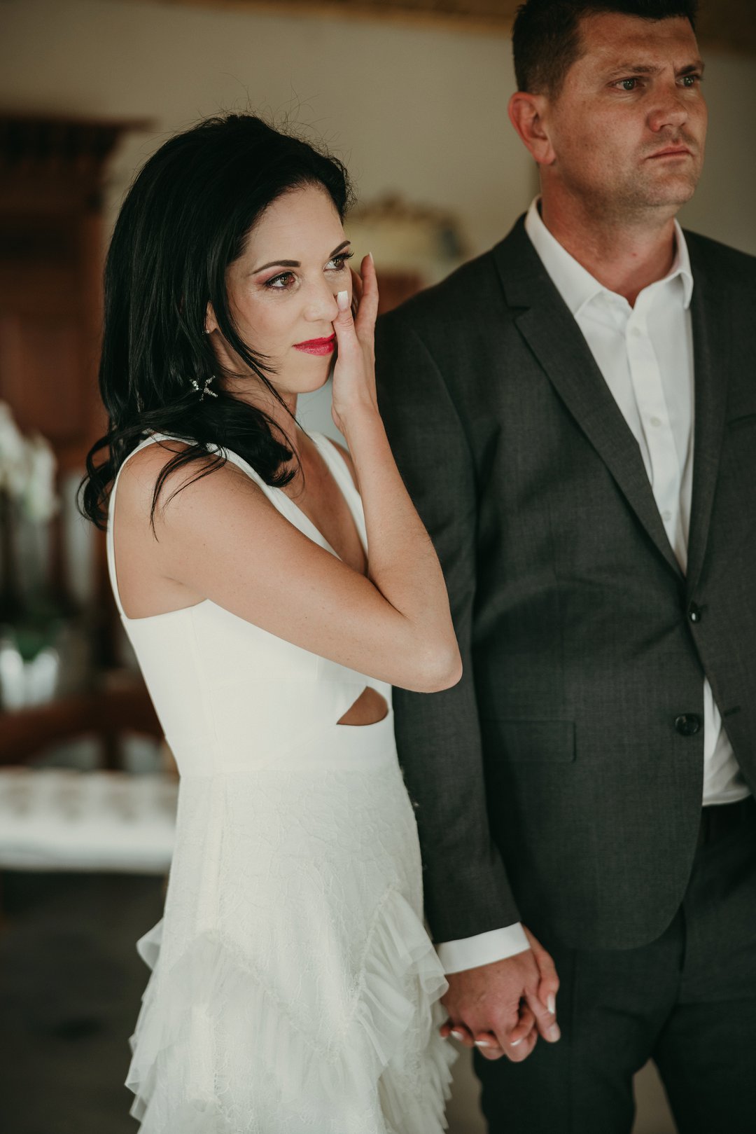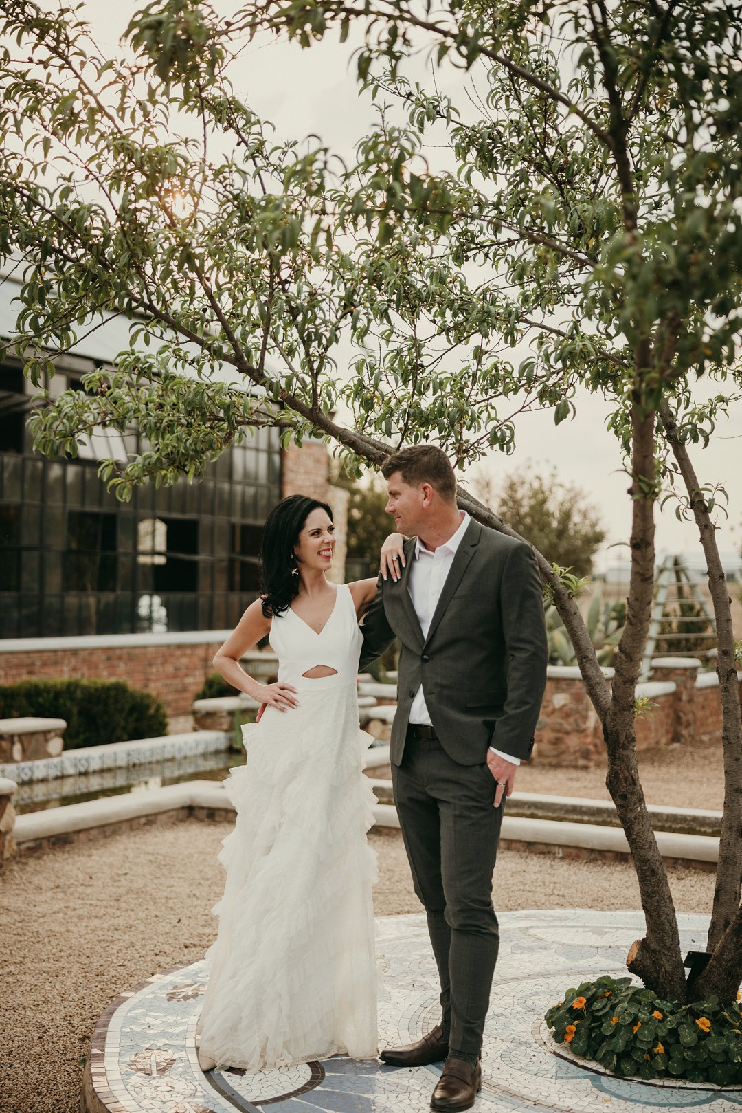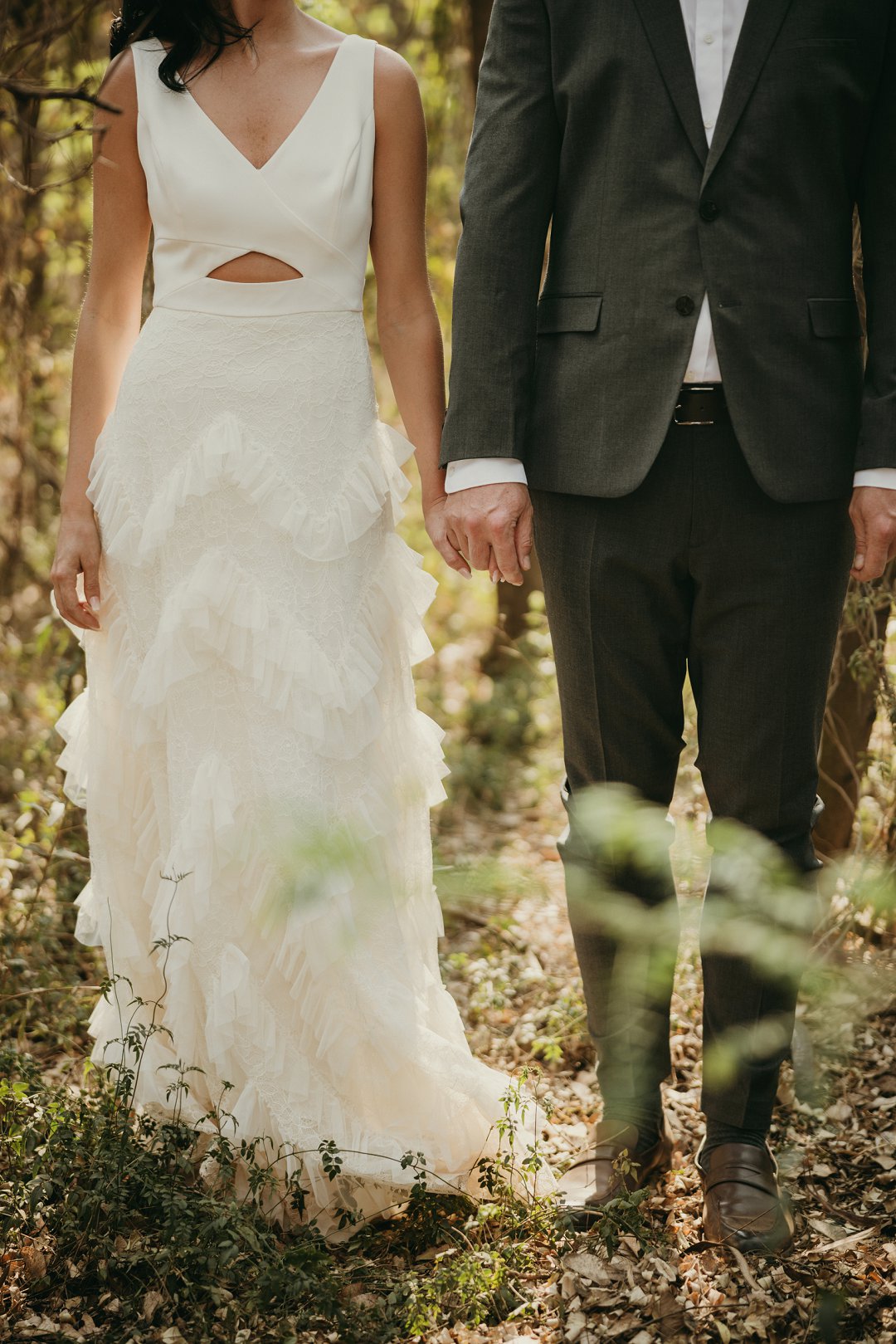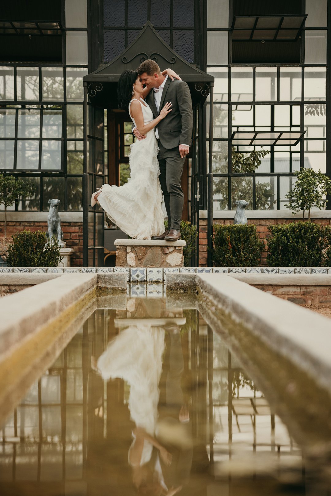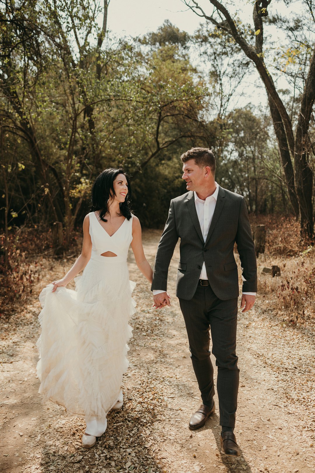 Ons is totaal en al verlief op Leanie se pragtige trourok wat sy gekoop het in Dubai. Die trourok het ʼn simplistiese styl bo en die room kleurige riffels aan die rok gee dit ʼn deftige en interessante voorkoms. Leanie se helder lipstiffie het net daai ekstra tikseltjie elegansie gegee. JJ het ʼn ontspanne, maar nogsteeds deftige voorkoms gehad met sy donker grys pak, en knopies wit hemp sonder ʼn das.