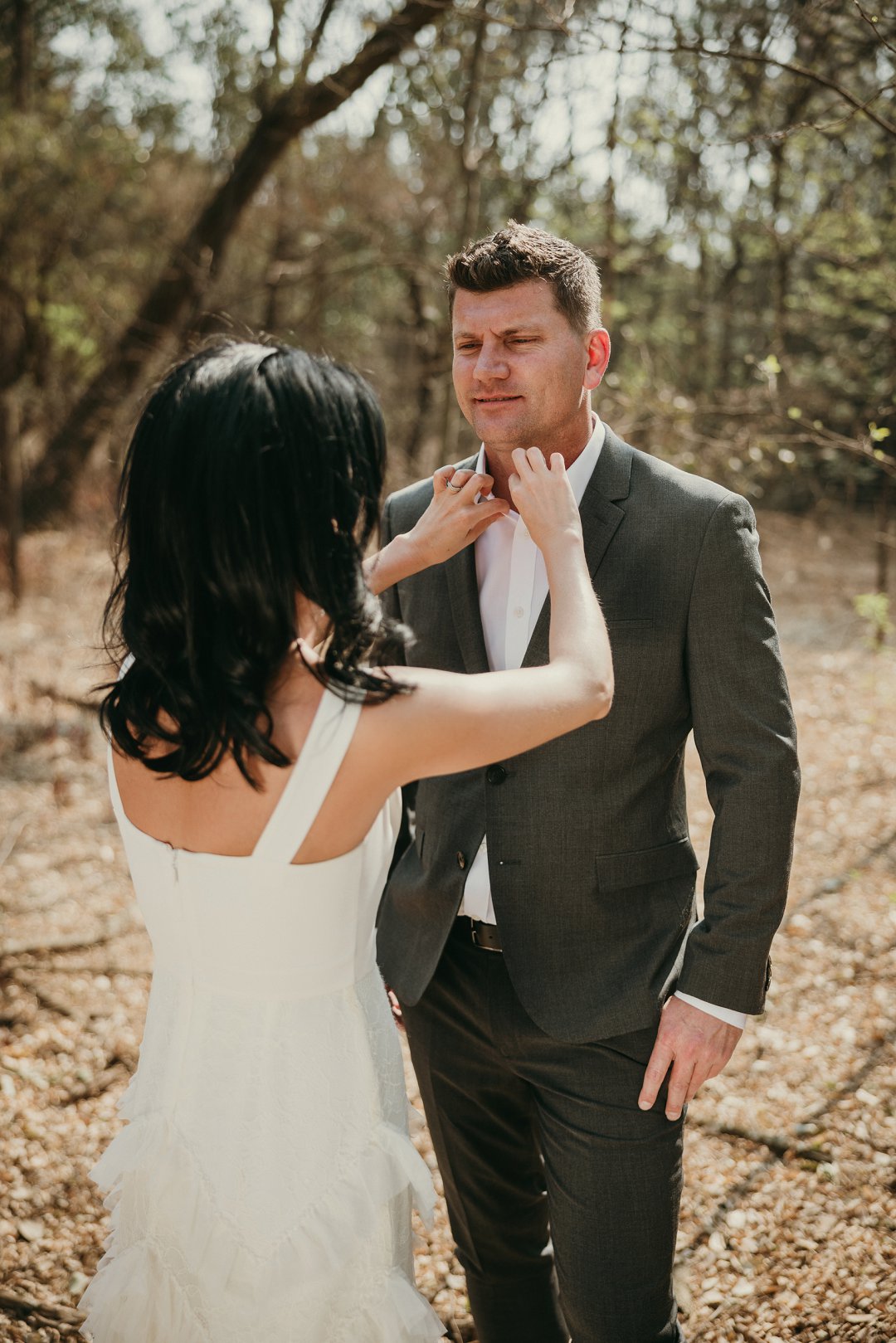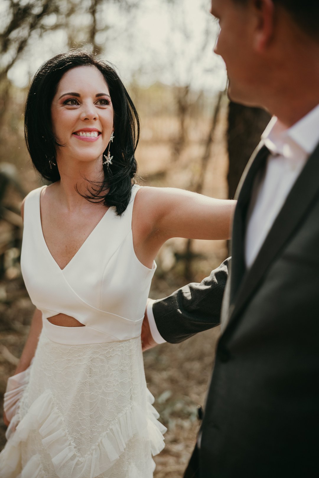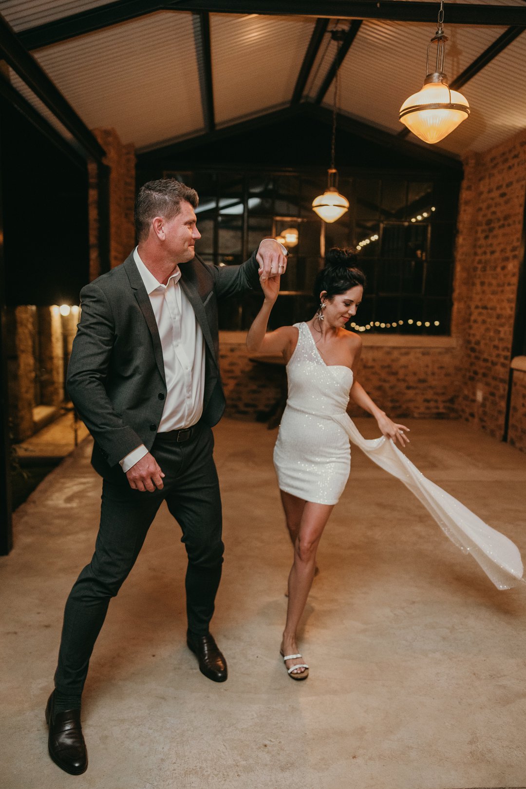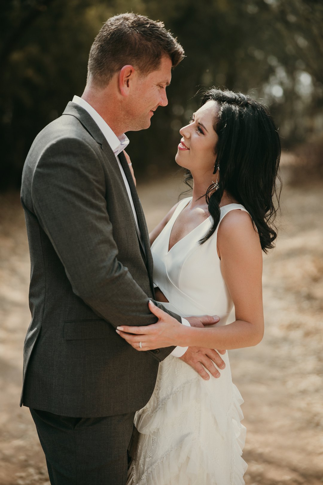 Ons is totaal en al verlief op Leanie se pragtige trourok wat sy gekoop het in Dubai. Die trourok het ʼn simplistiese styl bo en die room kleurige riffels aan die rok gee dit ʼn deftige en interessante voorkoms. Leanie se helder lipstiffie het net daai ekstra tikseltjie elegansie gegee. JJ het ʼn ontspanne, maar nogsteeds deftige voorkoms gehad met sy donker grys pak, en knopies wit hemp sonder ʼn das.