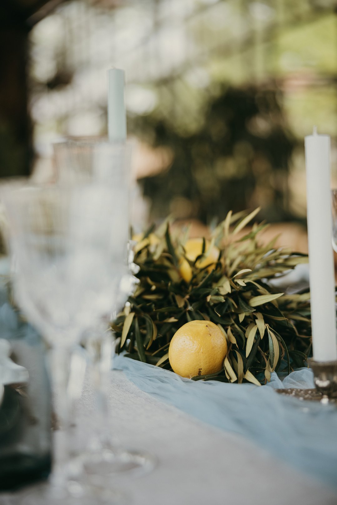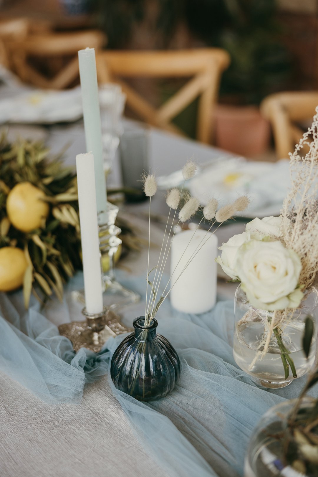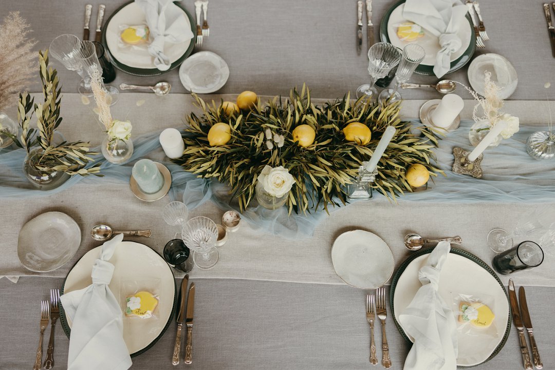 Ons trou kleure was stowwerige blou, wit, room en goud. Ons het tikseltjies geel bygevoeg deur suurlemoene op die tafels te plaas en het baie groen as deel van ons dekor gehad. Die algehele styl van ons troue was romanties met ʼn plattelandse gevoel.