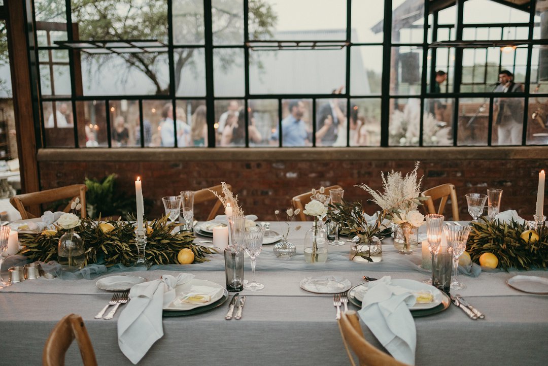 Leanie en JJ se trou dekor is ʼn kombinasie van sagte kleure soos lig blou, wit, room, goud en hier en daar tikseltjies geel suurlemoene. Groen was ook een van die hoofkleure by die trou dekor en ons dink dit pas perfek in by die onthaal lokaal se gevoel. Die lang tafel bedek met ʼn tafeldoek gee ʼn deftige voorkoms en die bruin stoele skep die perfekte kontras. ʼn Lang ligter skakering tafelloper het die dekor elemente soos die blom ontwerpe en kerse die fokuspunt gemaak.