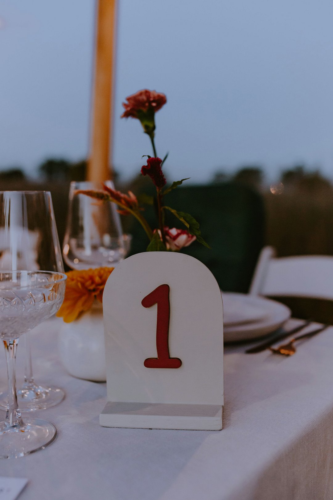 Die tafel was bedek met kleurvolle eenvoudige gestileerde blom ontwerpe. Al die ander dekor elemente op die tafel was wit gewees wat die perfekte kontras teenoor die agtergrond geskep het. Elke trou gas het ook ʼn illustrasie prentjie van hulself gehad wat gedien het as hul sitplek aanwyser.