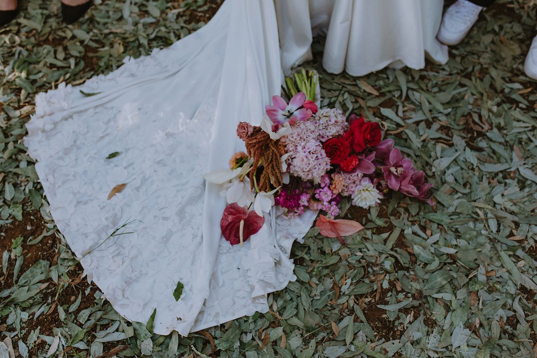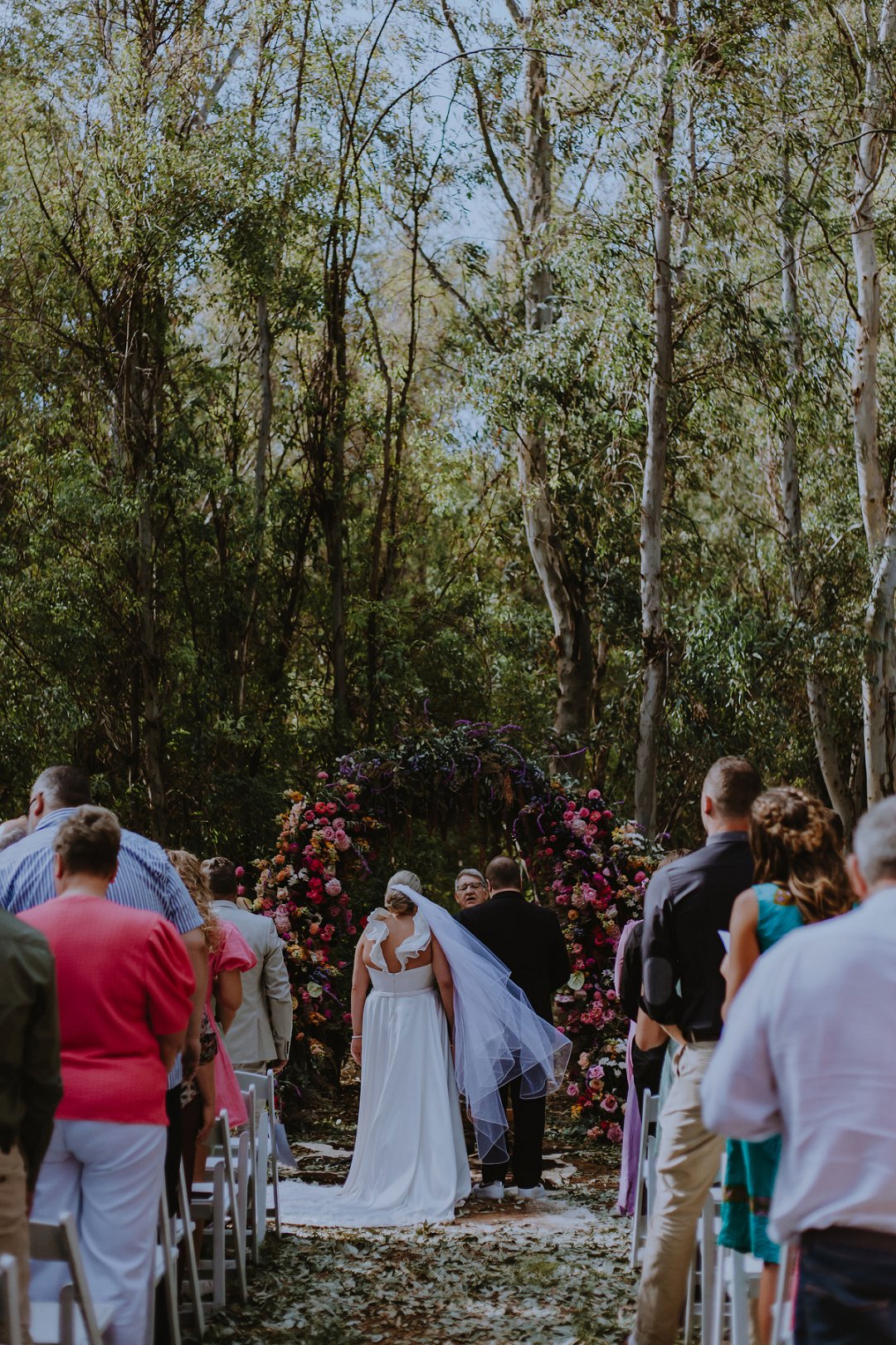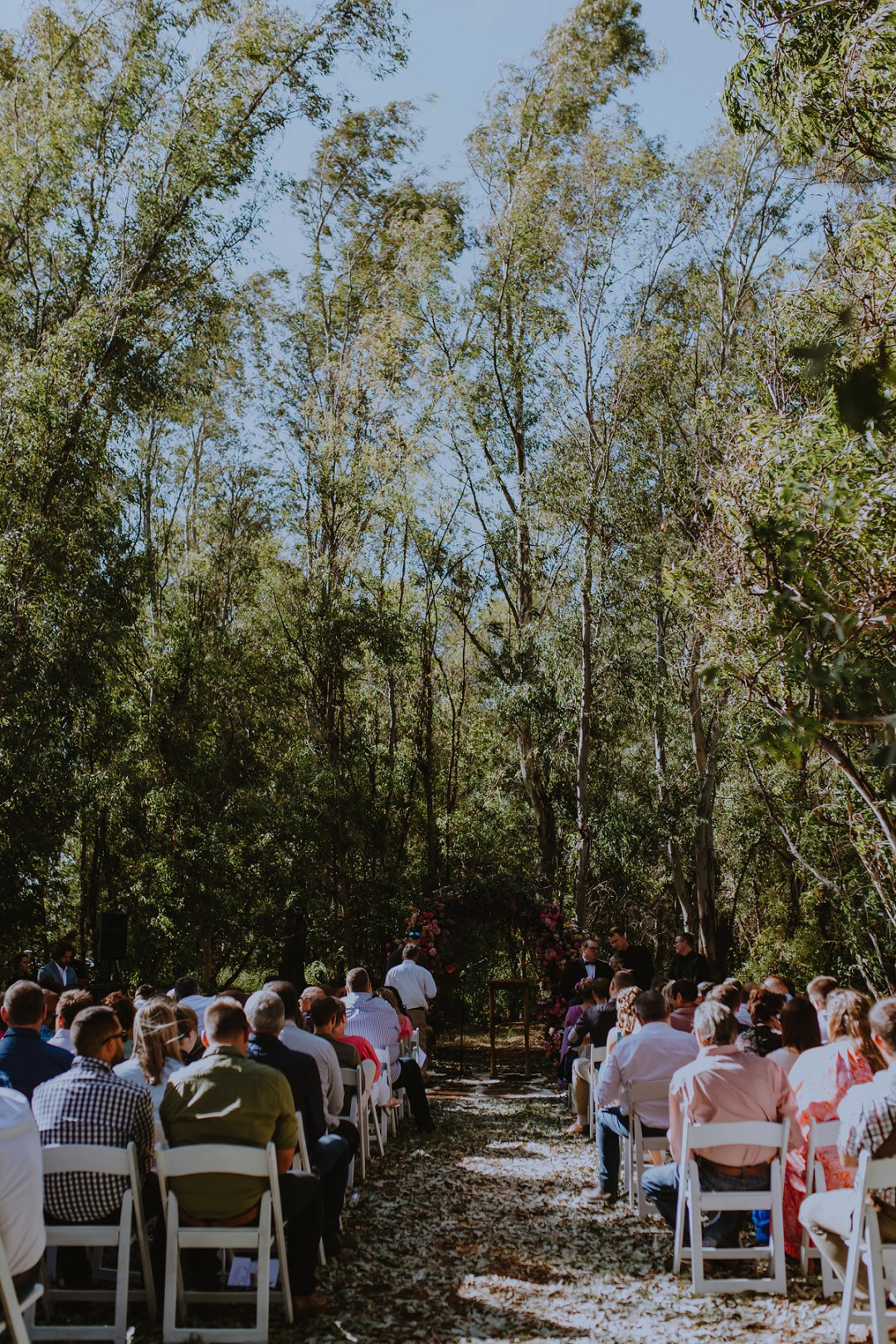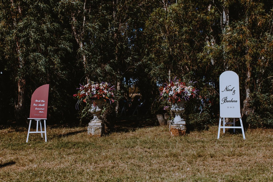 Hulle seremonie was tussen die bloekombos laning wat die perfekte ligging was vir hul seremonie. Omring deur die beboste natuurskoon met die helder kleurige blomme boog wat die perfekte aansig maak vir die paartjie se seremonie.