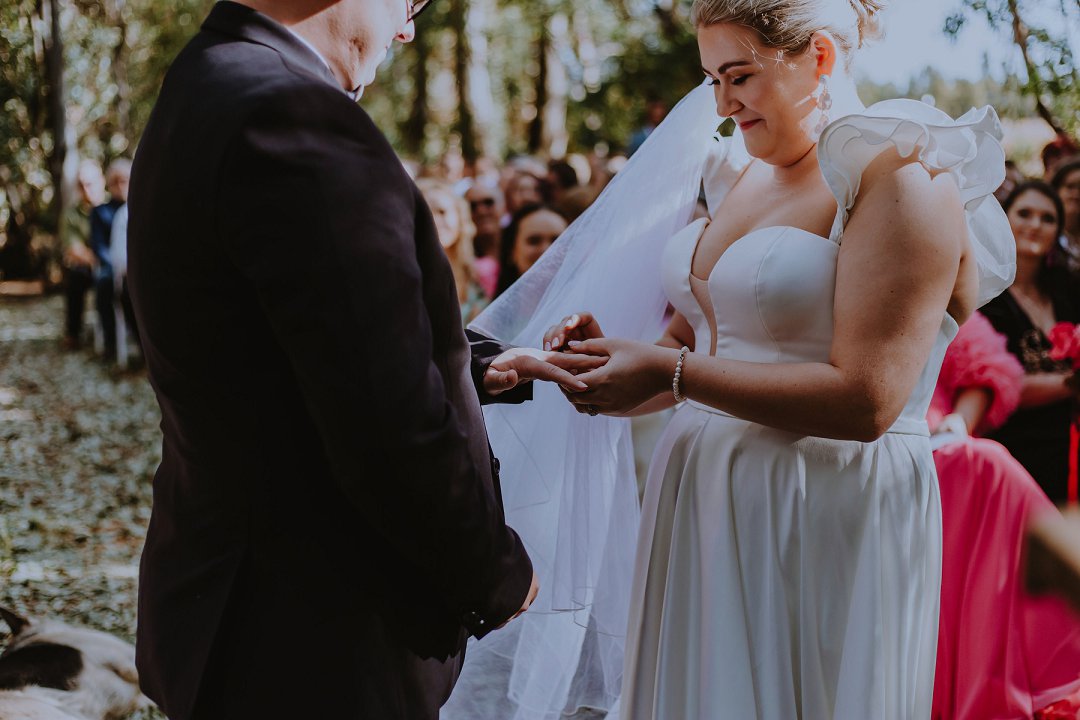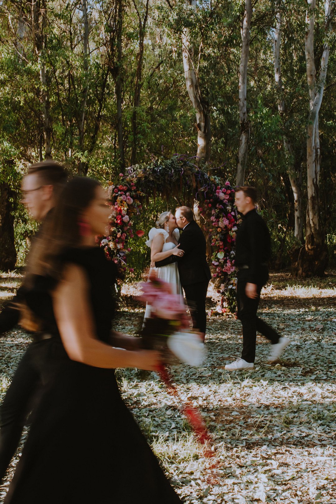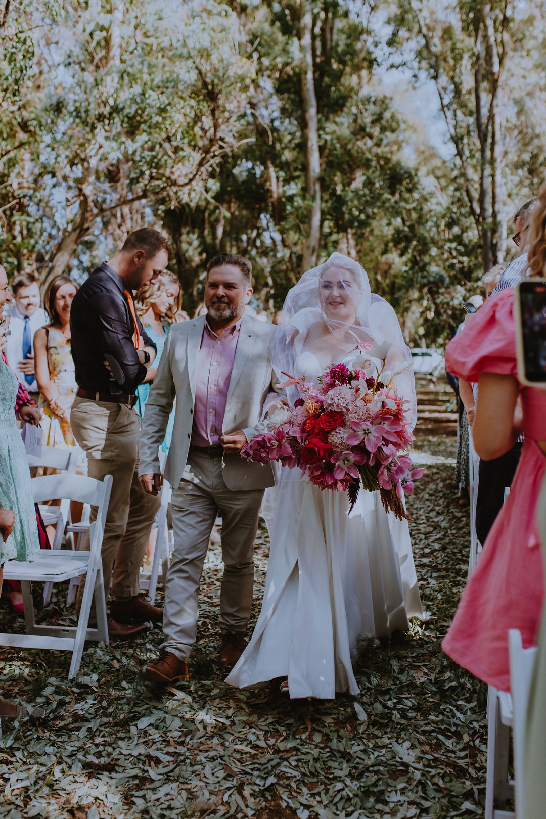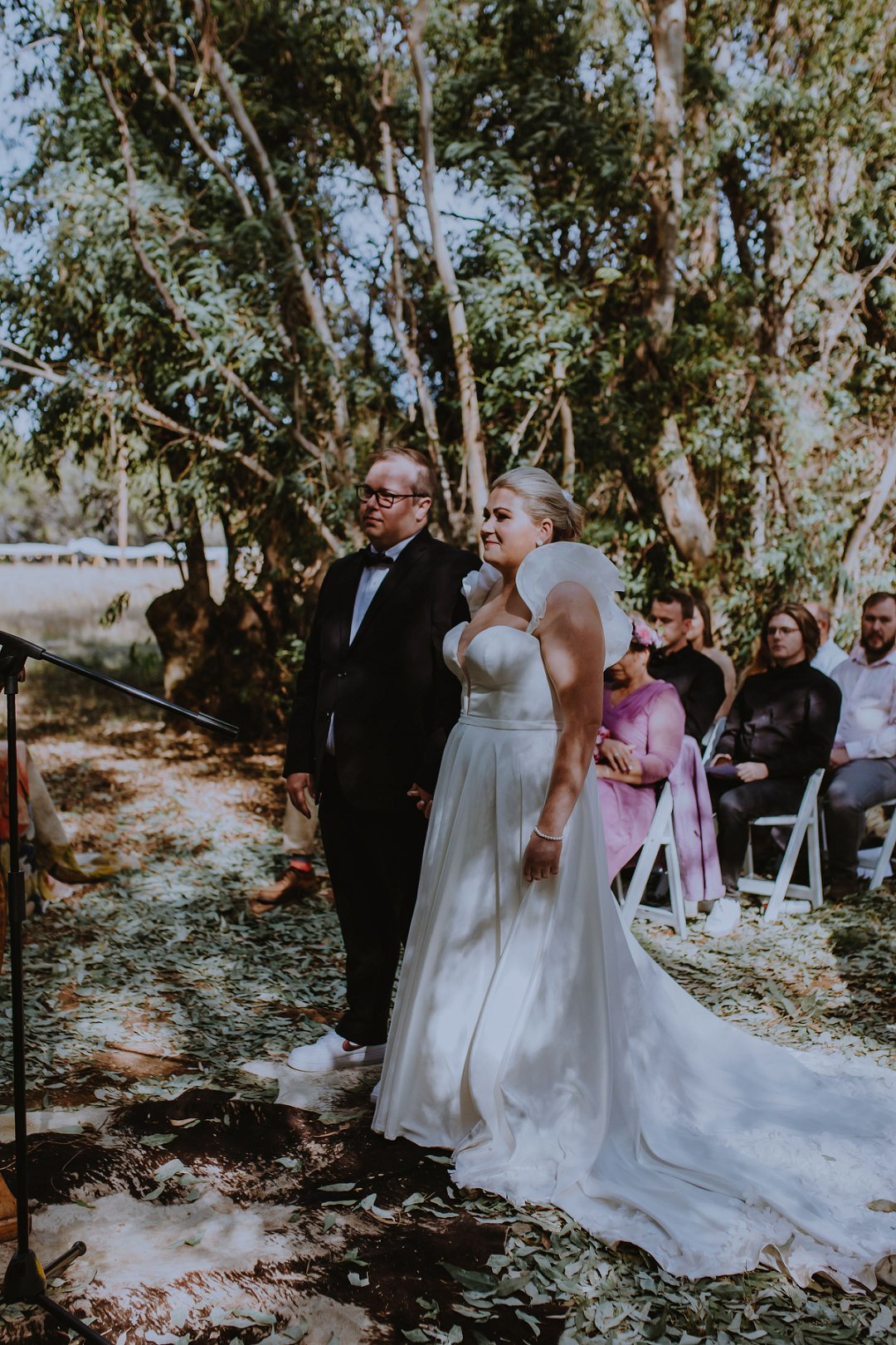 Hulle seremonie was tussen die bloekombos laning wat die perfekte ligging was vir hul seremonie. Omring deur die beboste natuurskoon met die helder kleurige blomme boog wat die perfekte aansig maak vir die paartjie se seremonie.