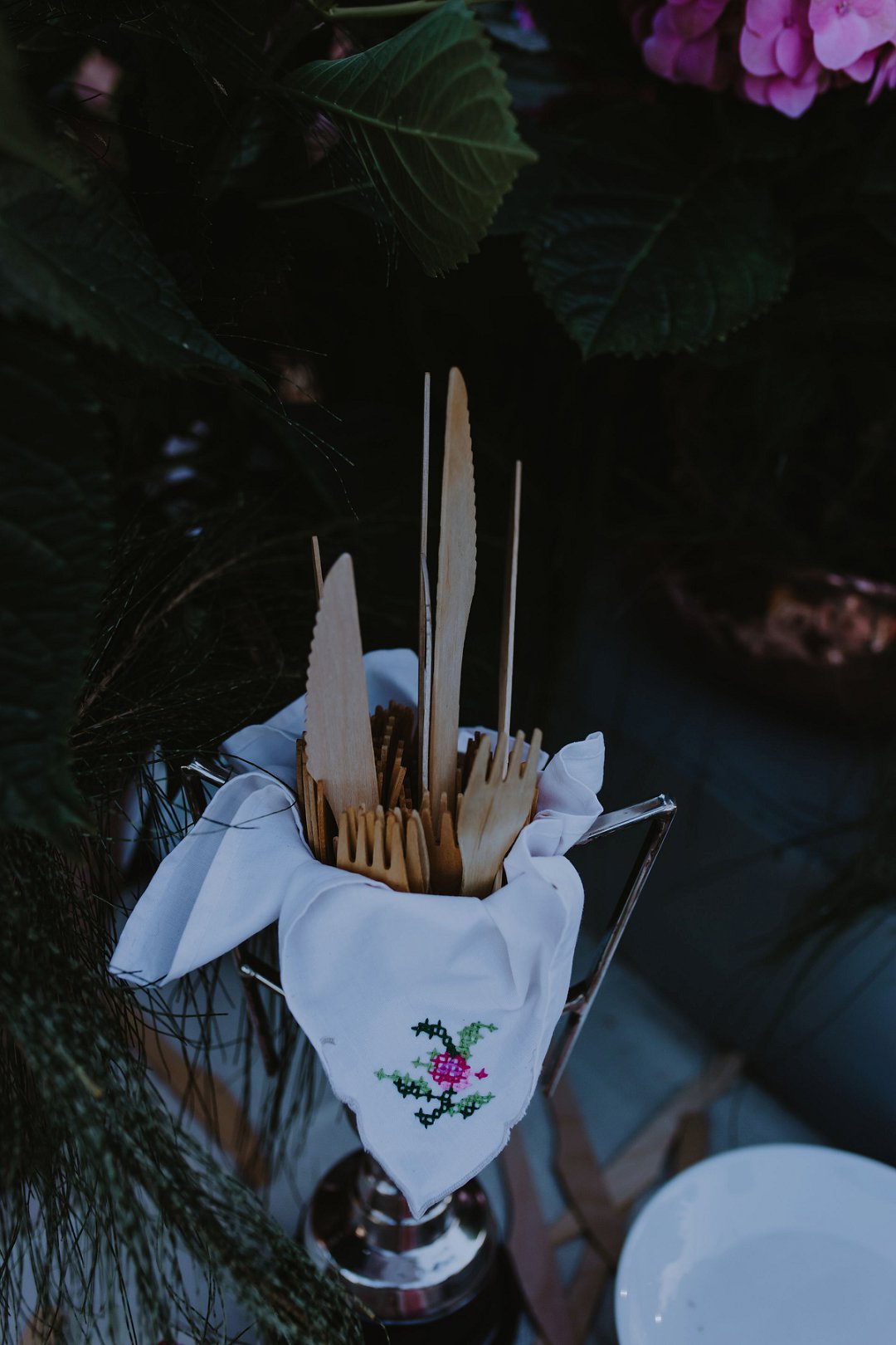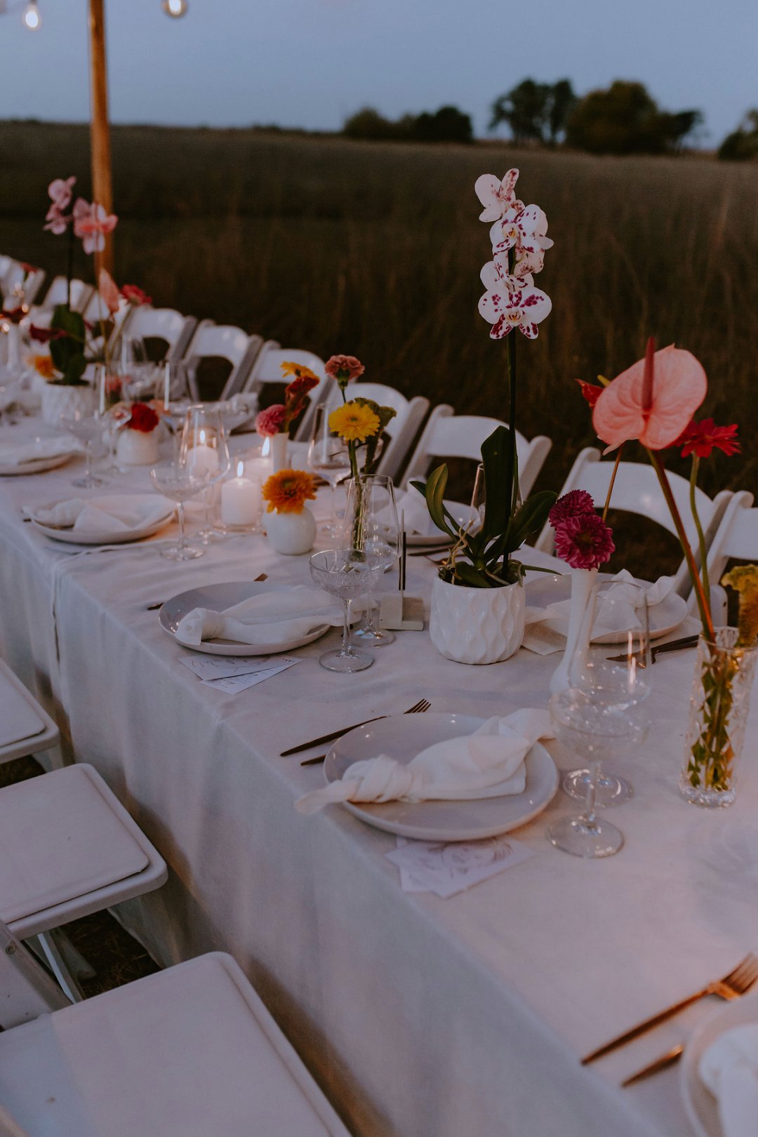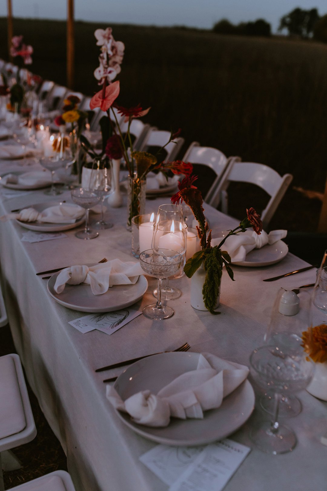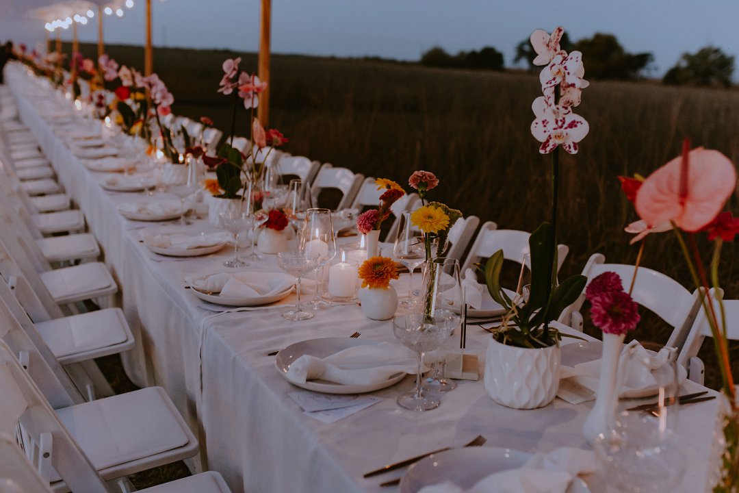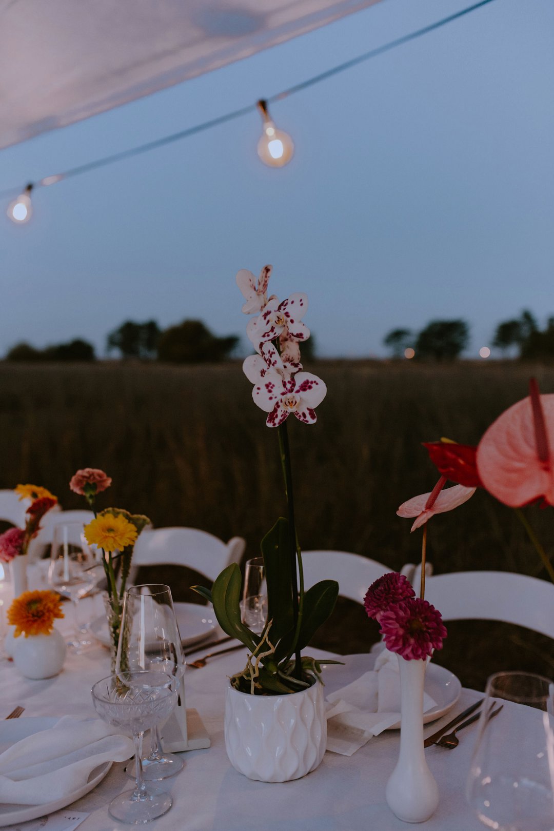 Minimalisties, baie blomme in verskillende kleure. Nguni velle in die paadjie tydens die seremonie (om die plaas element in te bring). Tydens die onthaal het ons slegs een lang tafel gehad. Dit het vir my spesiale betekenis omdat ʼn etenstafel altyd die plek is waar diep gesprekke tussen familie/vriende plaasvind.