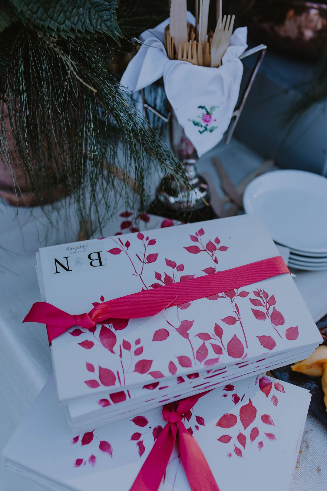 Die tafel was bedek met kleurvolle eenvoudige gestileerde blom ontwerpe. Al die ander dekor elemente op die tafel was wit gewees wat die perfekte kontras teenoor die agtergrond geskep het. Elke trou gas het ook ʼn illustrasie prentjie van hulself gehad wat gedien het as hul sitplek aanwyser.