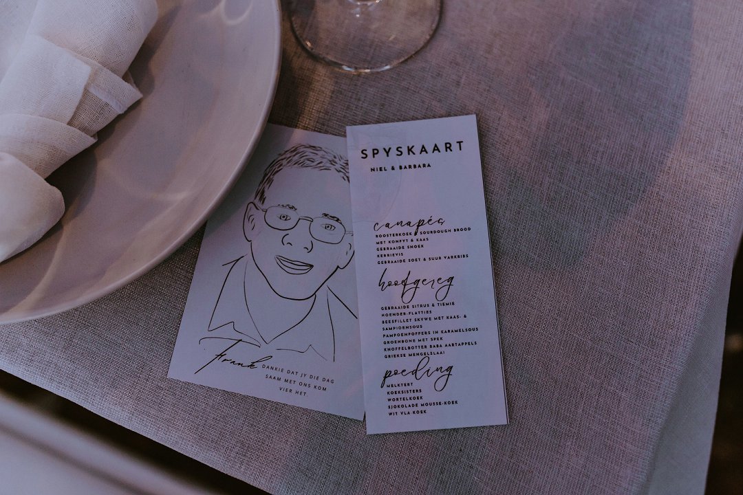 Barbara en Niel se onthaal was definitief iets buiten die gewone trou onthaal. Een lang tafel in die buitelug omring deur die landskappe van die plaas. Die lang tafel was bedek met ʼn wit tafeldoek en het ʼn hout raam met ʼn gedrapeerde wit doek oorgehad om die hele voorkoms af te eindig. Ligte het vanaf die houtraam oor die tafel gehang wat ʼn baie romantiese voorkoms aan die buitelug tafel gegee het.