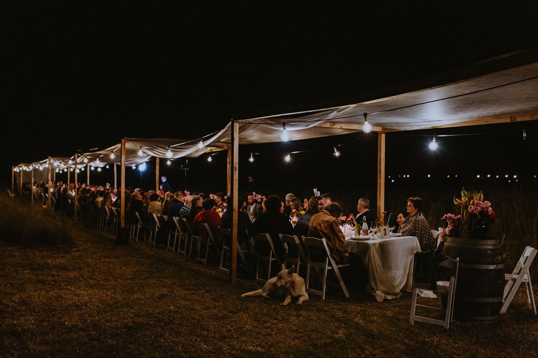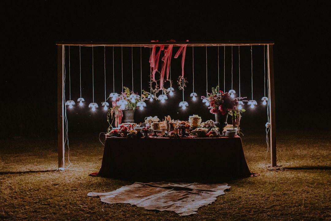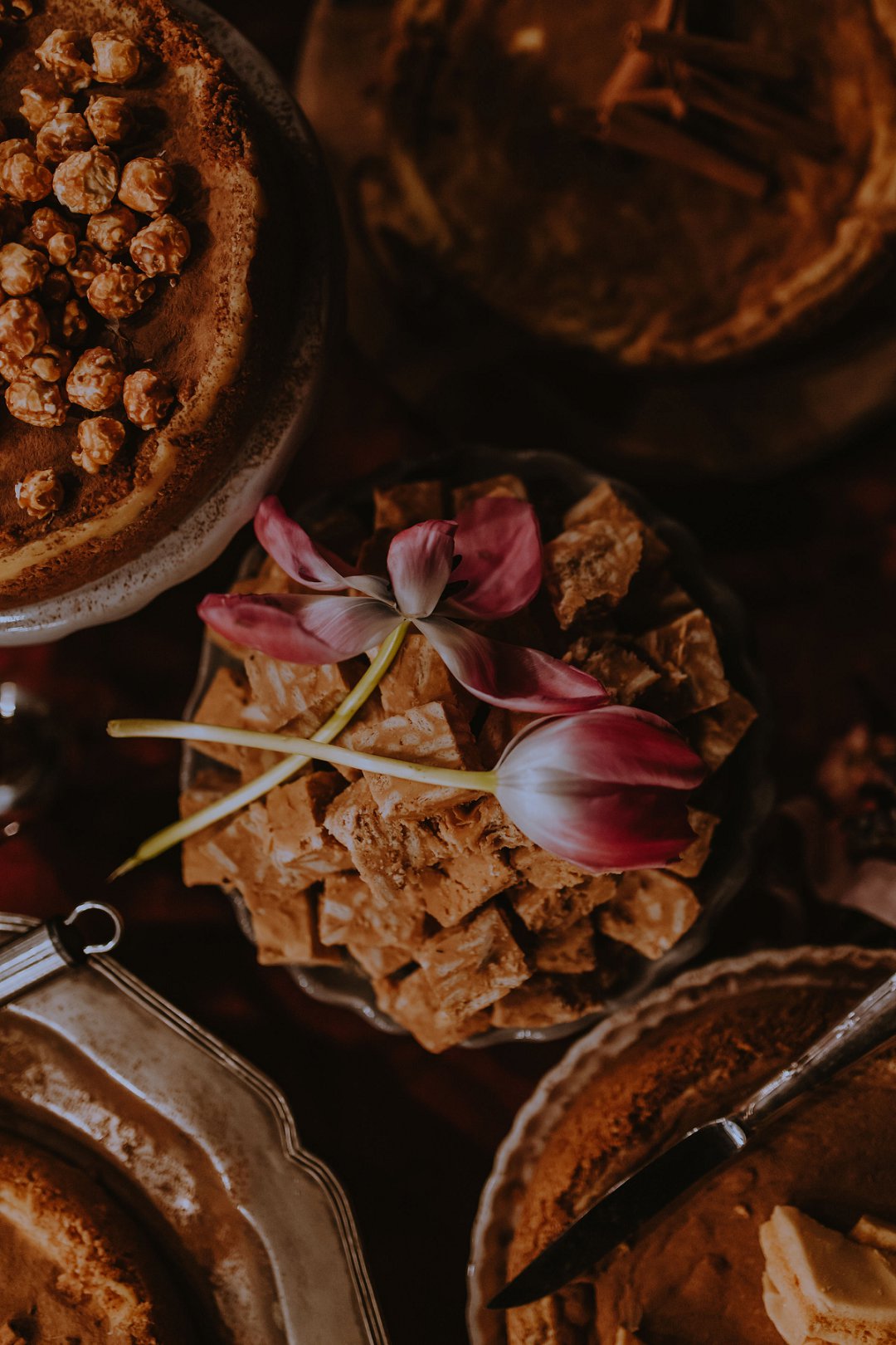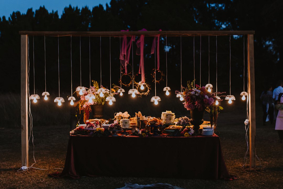 Die gaste was in ekstase oor die fantastiese kos. “Dit is iets om oor huis toe te skryf” het van die gaste gesê. Voorgereg was ʼn harvest table met vars brode, roosterkoek met botter en konfyt, kerrievis, gebraaide snoek en lekker sweet & sticky ribs. Al ons gunstelinge. Hofgereg is basseer op oudtydse kookkos met ʼn moderne twist. Skaapskenkels, gebraaide beesfillet en hoender stukke in ʼn kerrie sous. Bykosse sluit natuurlik in: pampoenkoekies, geroosterde groente, Griekse slaai en rys. Laaste, maar nie die minste nie, nagereg tafel gevul met die lekkerste koeke en soetgoed. Die nagereg tafel was ook ʼn fokuspunt by die onthaal gedeelte met mooi blomme tafeldoek en versameling liggies wat bo-oor die tafel hang in verskillende hoogtes.