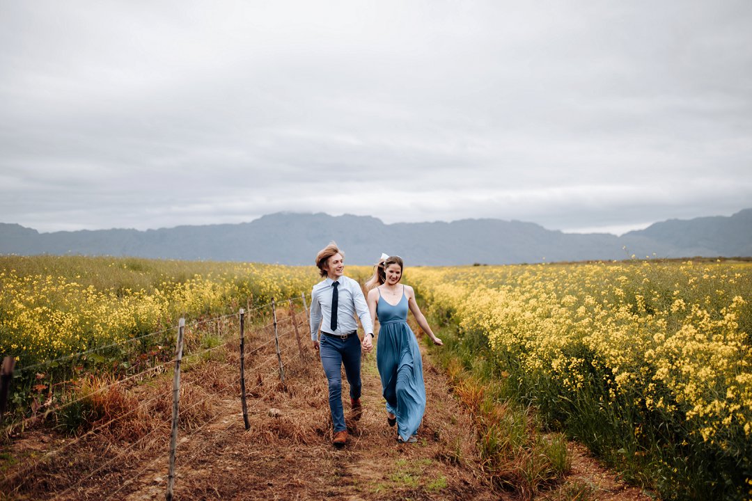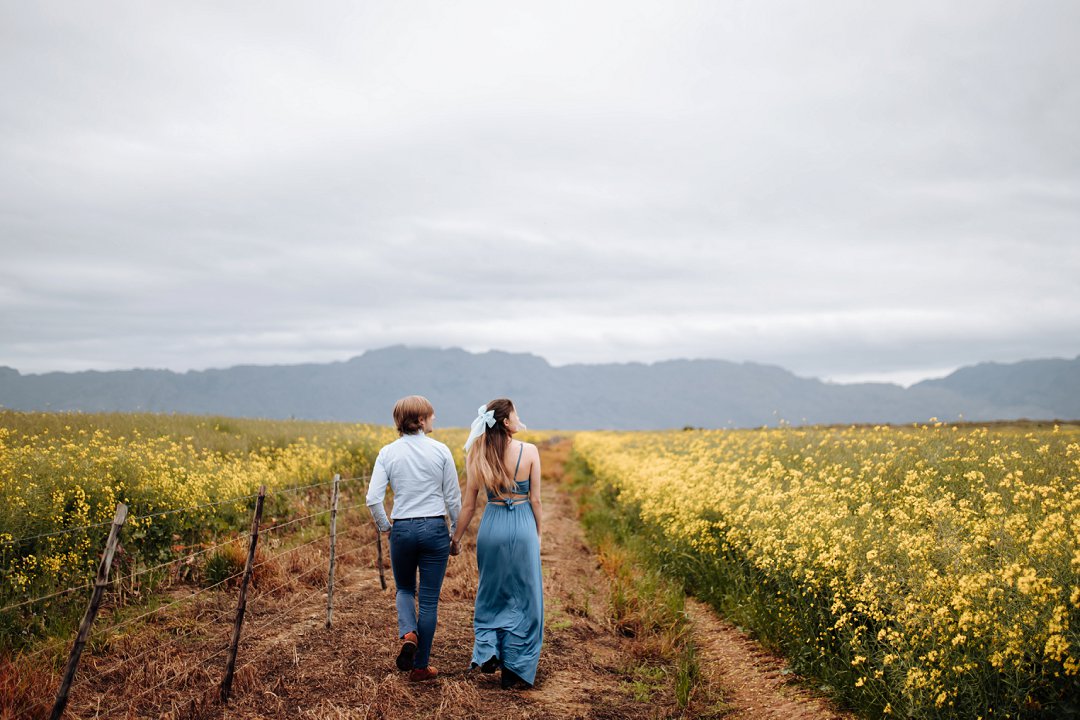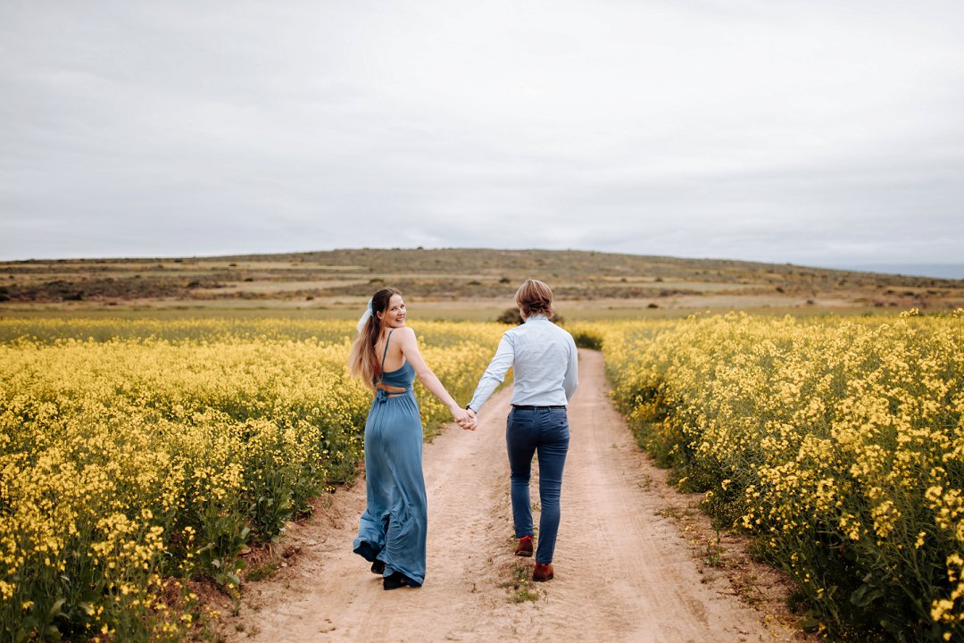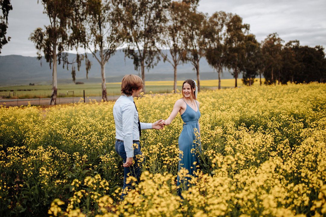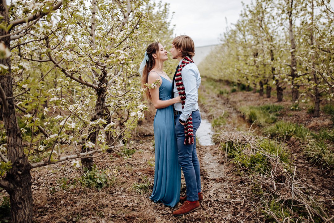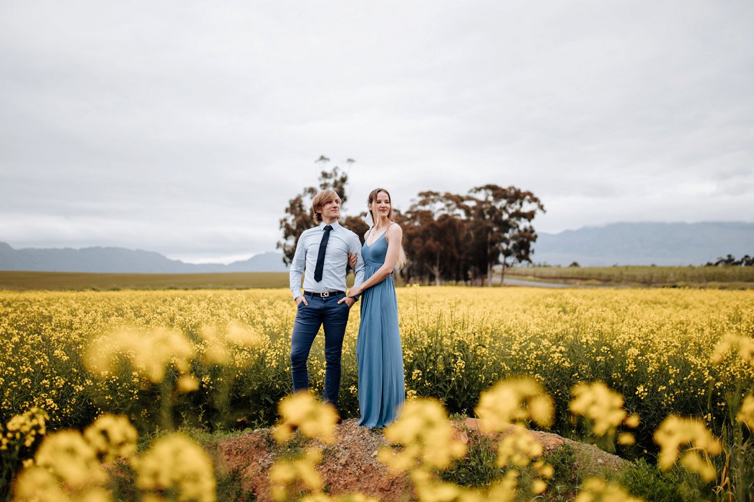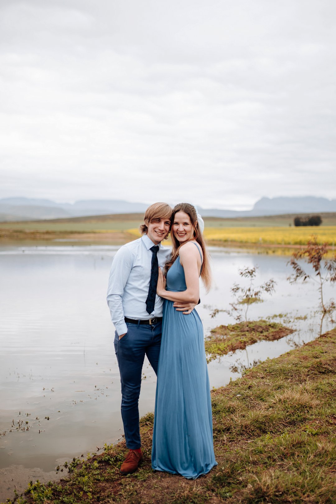 Die bewolkte weer laat die kleure só mooi uitstaan en gee die foto’s ʼn dramatiese en amper kinematiese gevoel. Verskillende landskappe was die agtergrond van die paartjie se fotosessie. Van die geel bloeisels, ʼn dam tot die wit bloeisels van die appel bome.