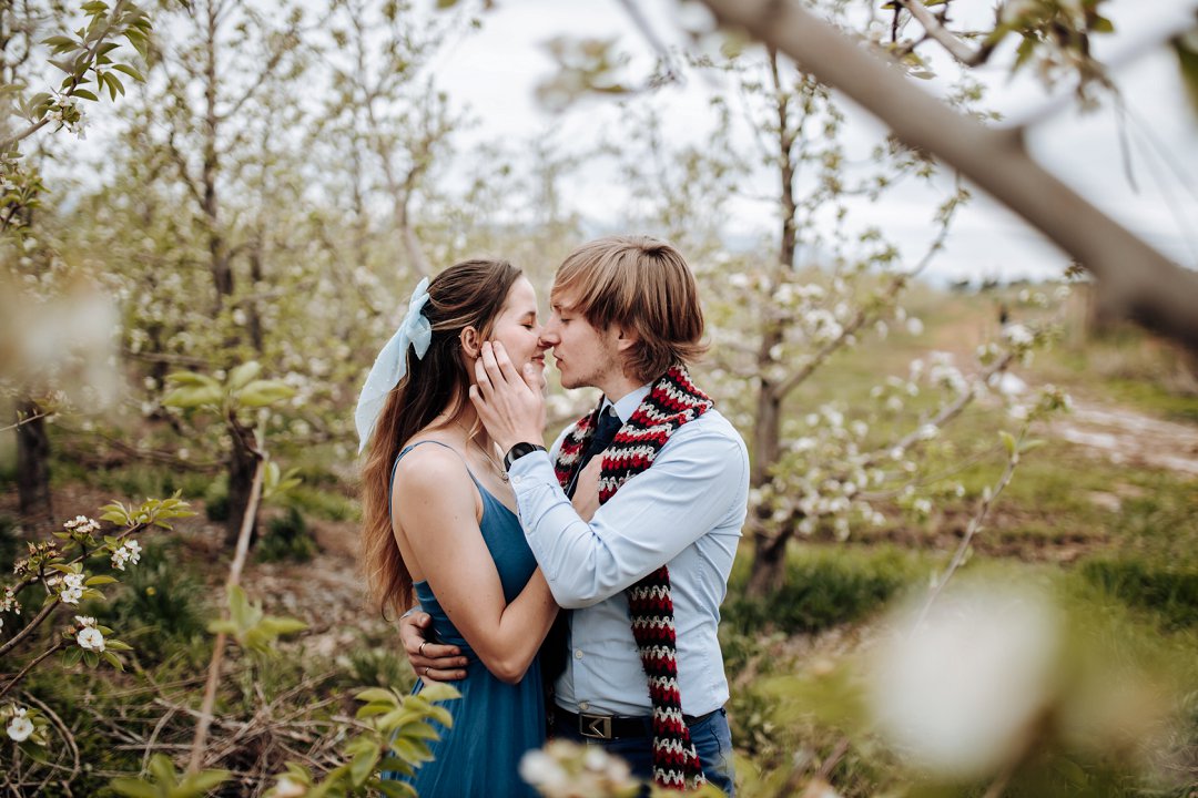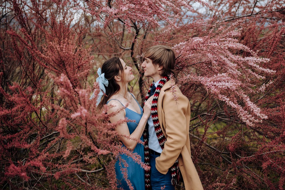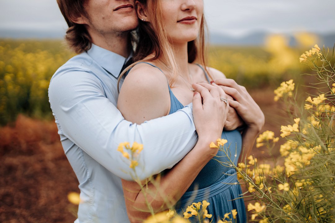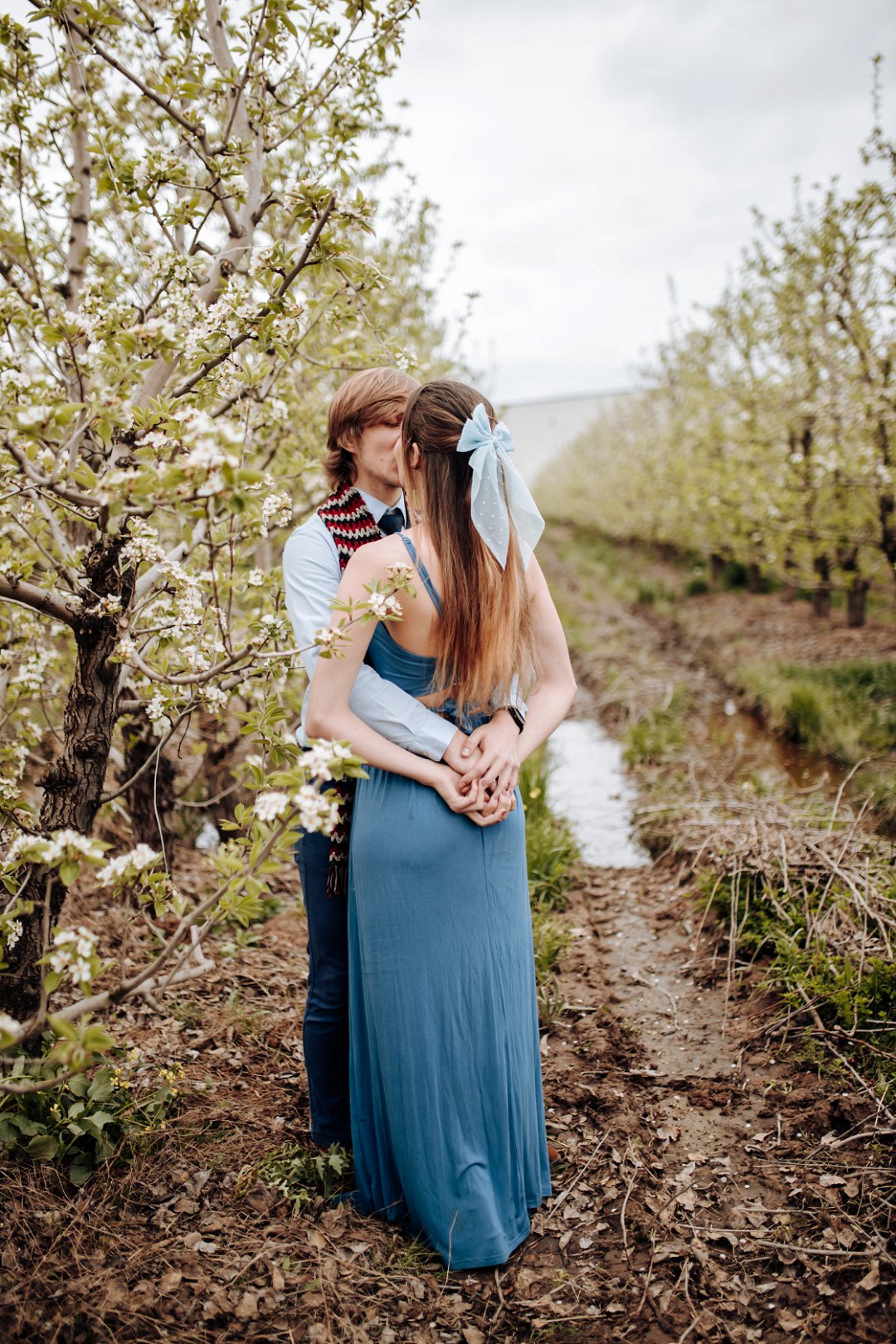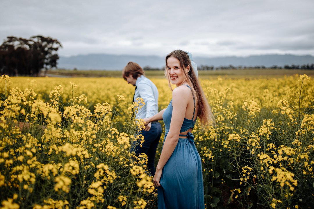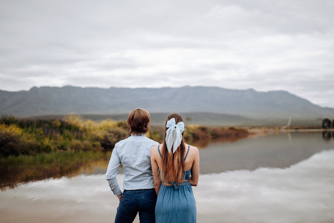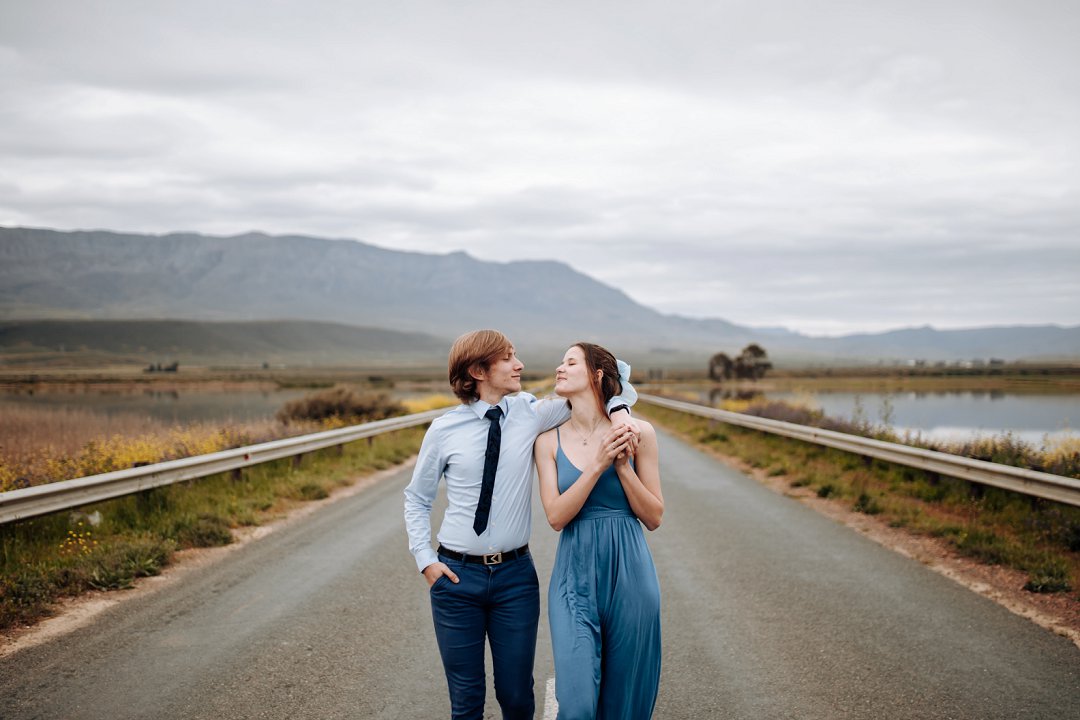 Die bewolkte weer laat die kleure só mooi uitstaan en gee die foto’s ʼn dramatiese en amper kinematiese gevoel. Verskillende landskappe was die agtergrond van die paartjie se fotosessie. Van die geel bloeisels, ʼn dam tot die wit bloeisels van die appel bome.