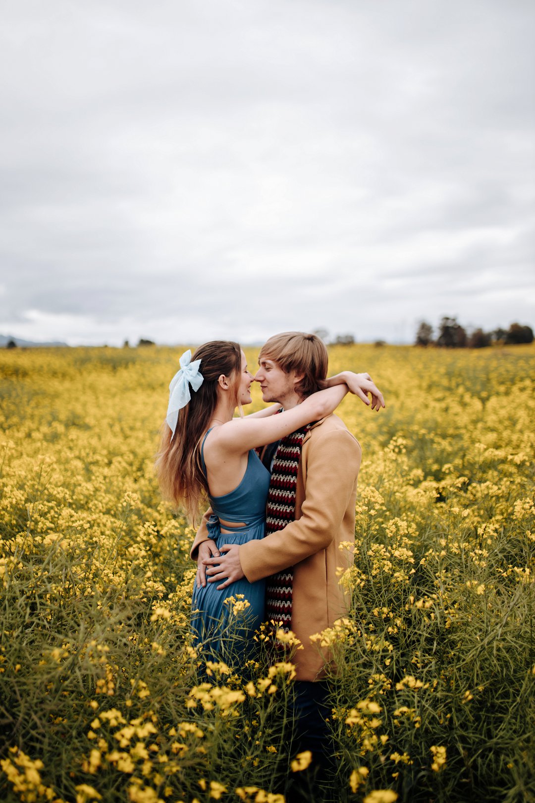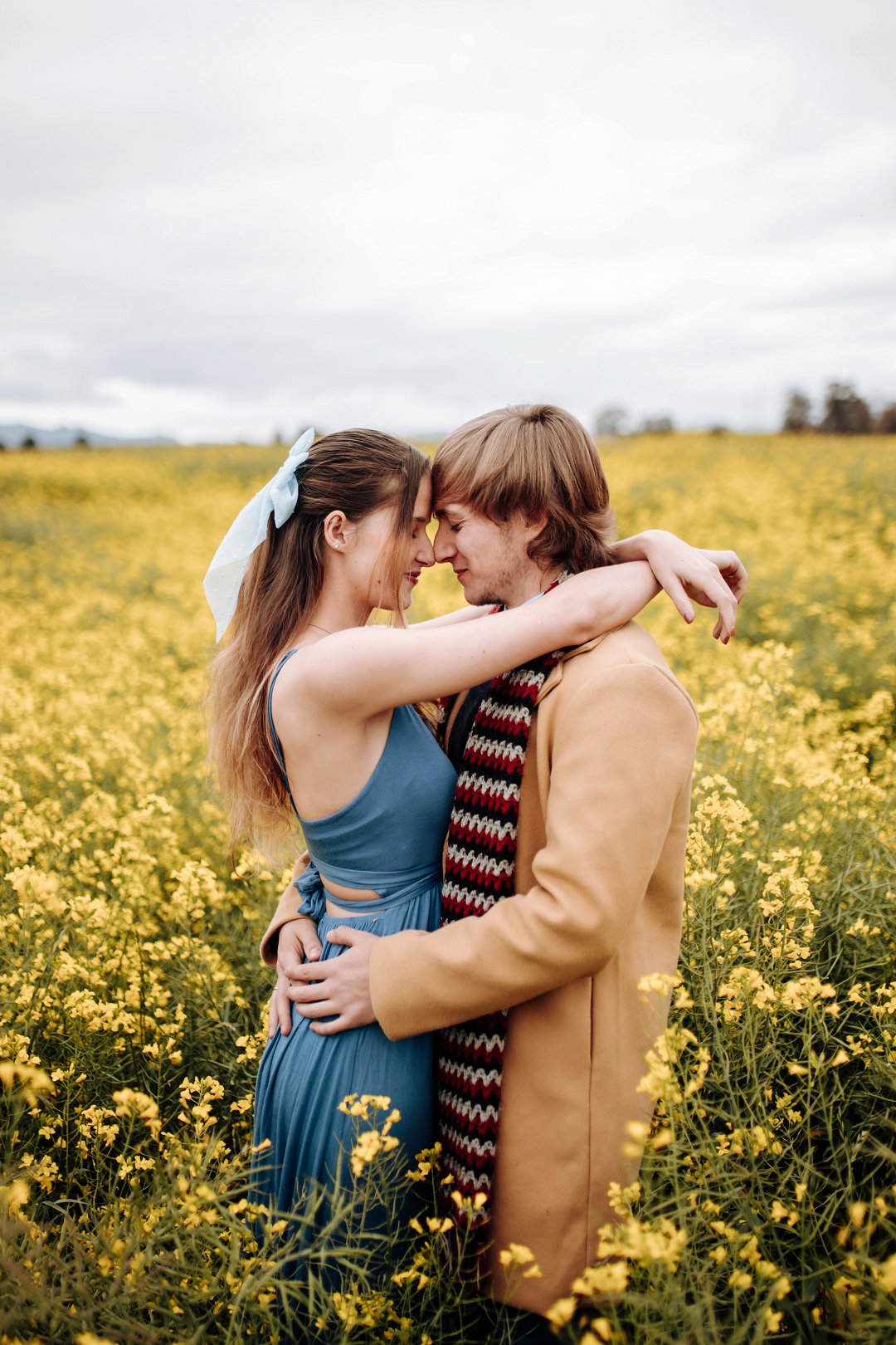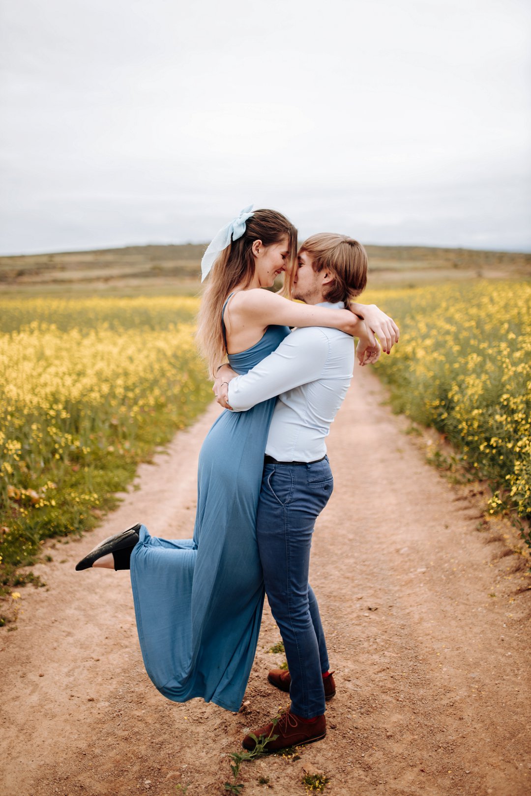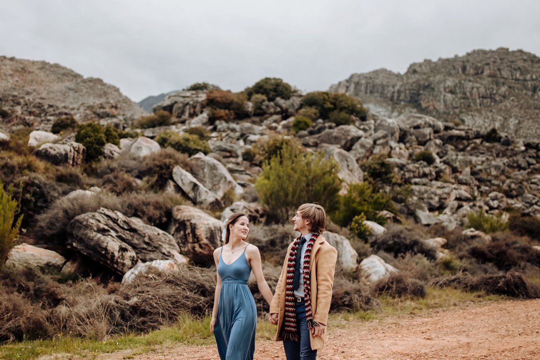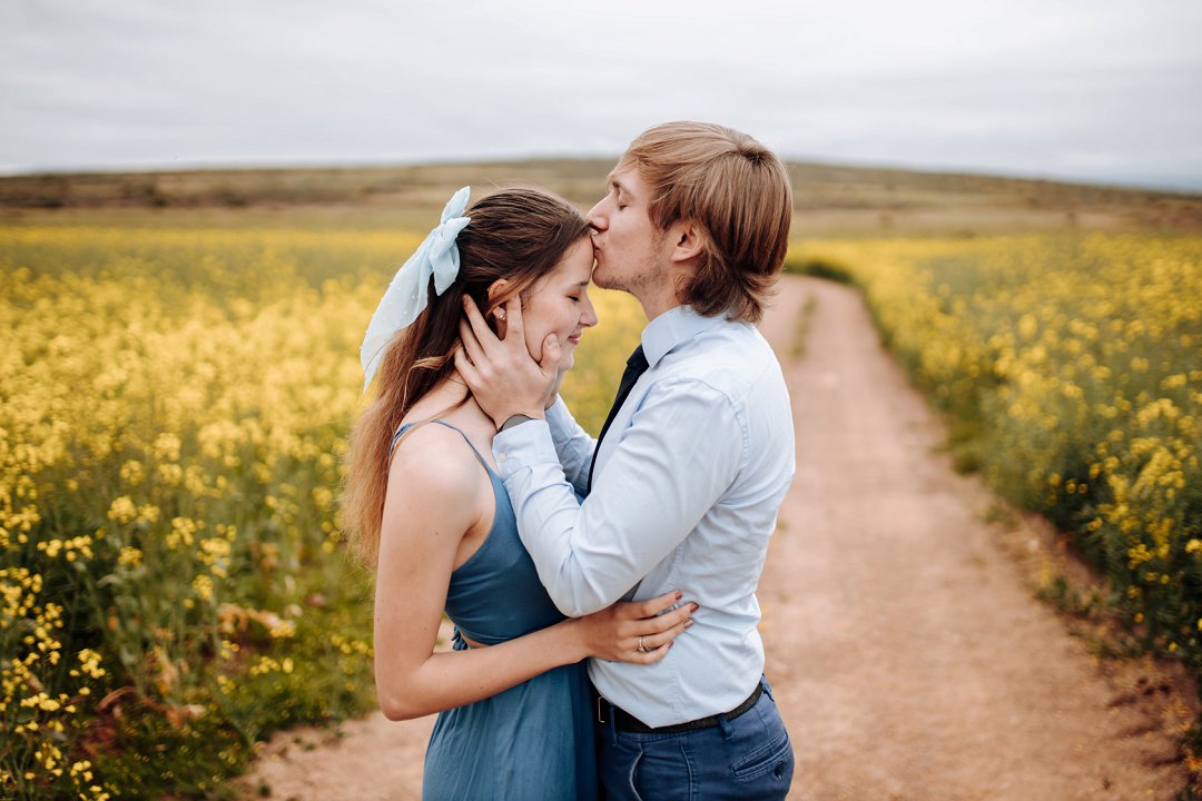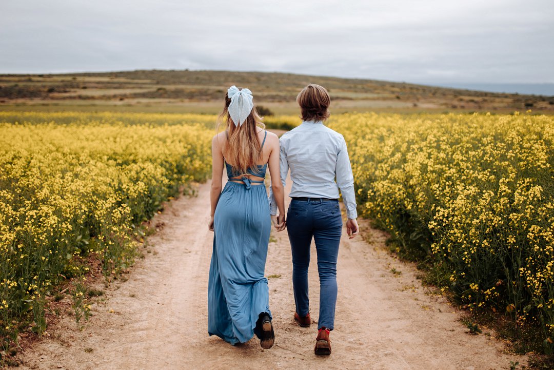 Die bewolkte weer laat die kleure só mooi uitstaan en gee die foto’s ʼn dramatiese en amper kinematiese gevoel. Verskillende landskappe was die agtergrond van die paartjie se fotosessie. Van die geel bloeisels, ʼn dam tot die wit bloeisels van die appel bome.