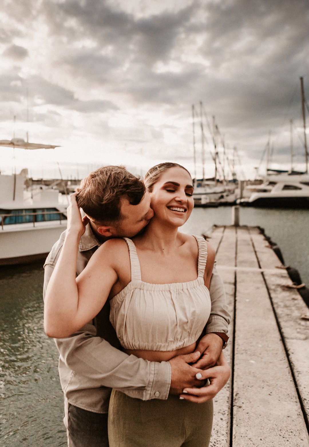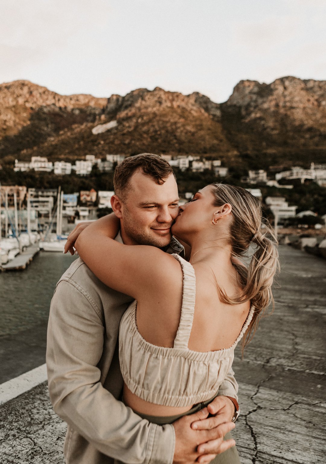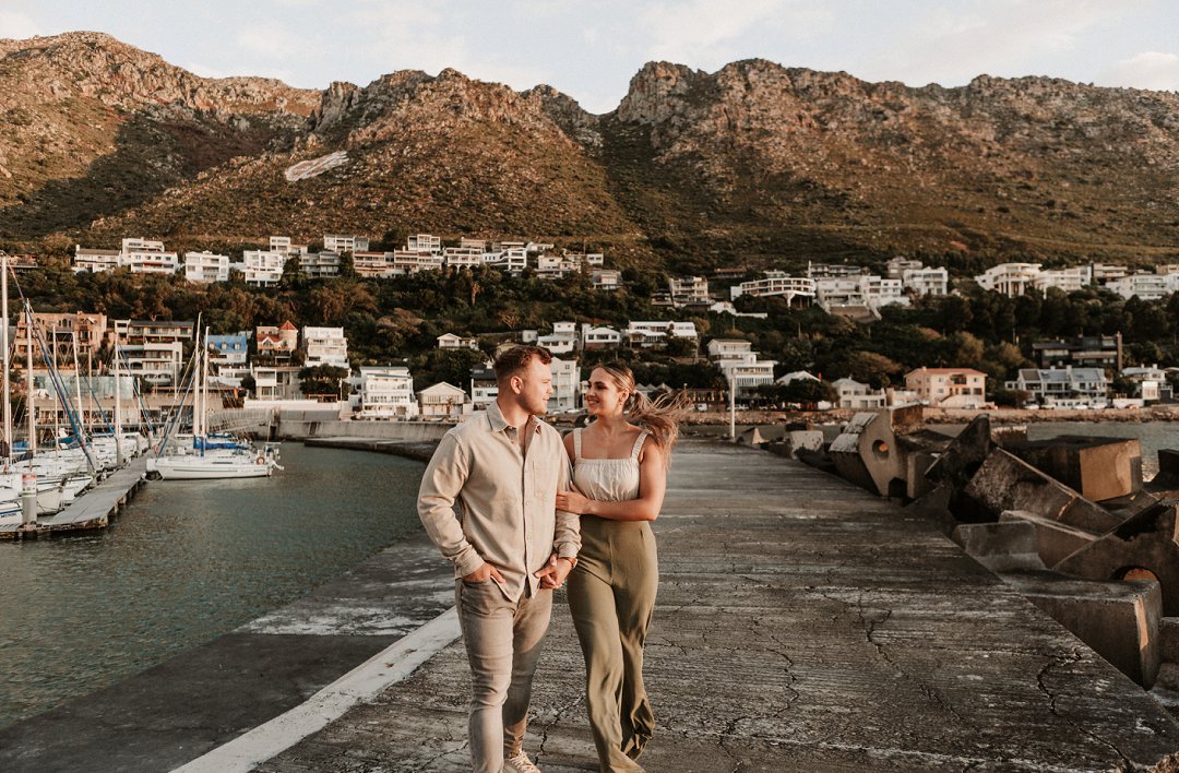 Jul fotosessie se ligging is die ander belangrike punt. Die berg en see uitsigte van die paartjie se fotosessie is besonders mooi. Hulle fotosessie was op die hawe se muur in Gordonsbaai wat die mooiste uitsigte en perfekte agtergrond bied. Die bootjies in die hawe is só mooi en skep ʼn perfekte strand voorkoms. Elke element van die paartjie se fotosessie is perfek en die sagte sonsak lig skep ʼn romantiese warm voorkoms aan die foto’s.