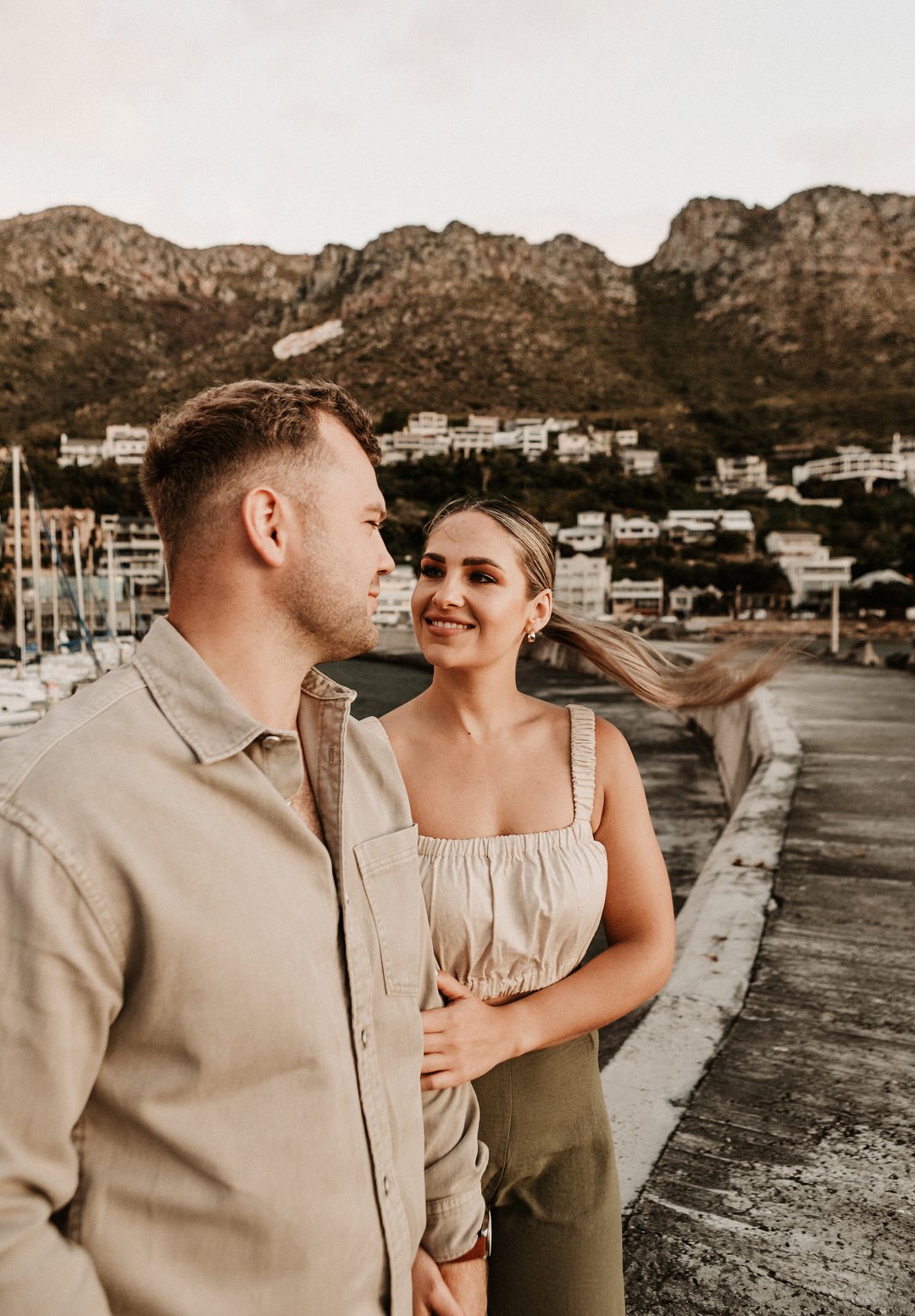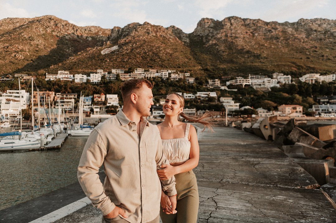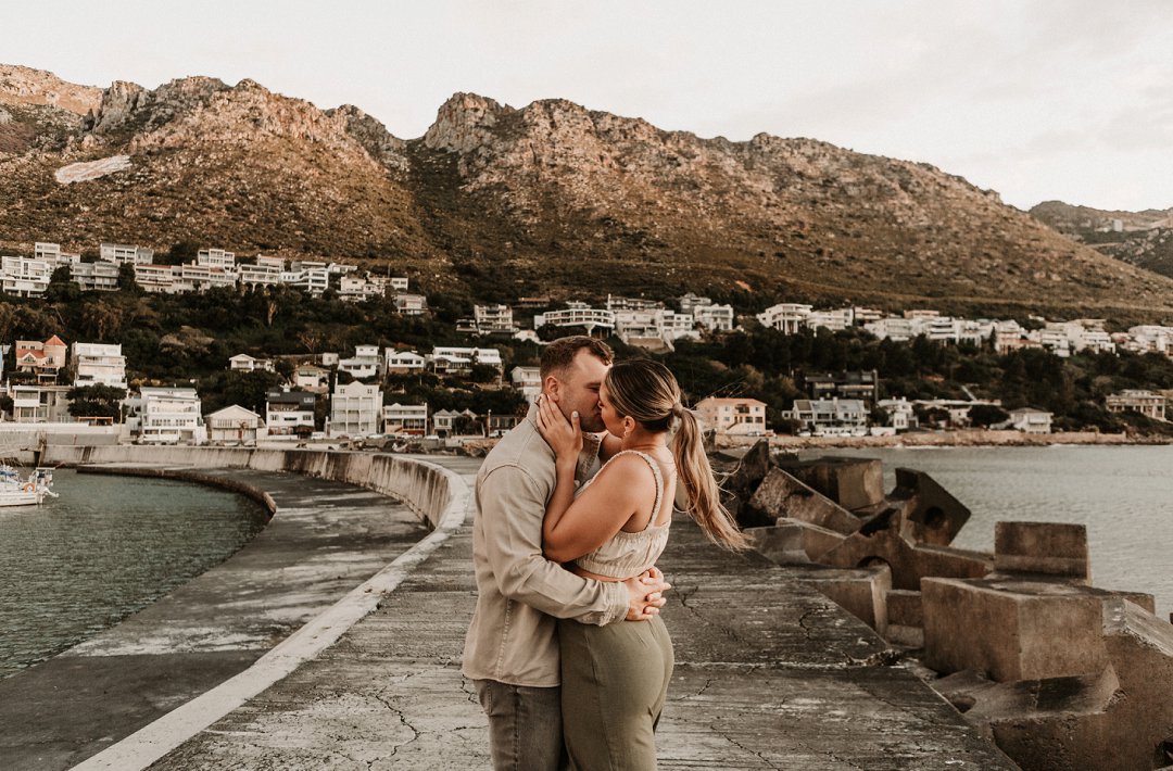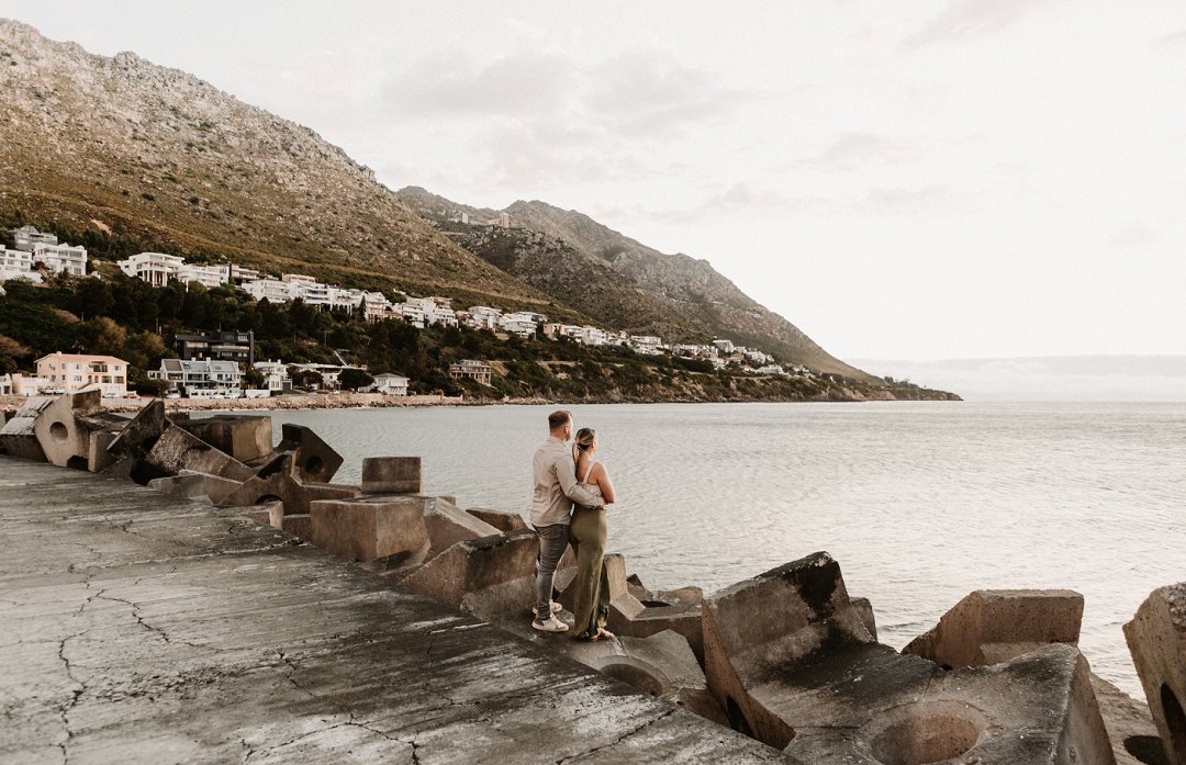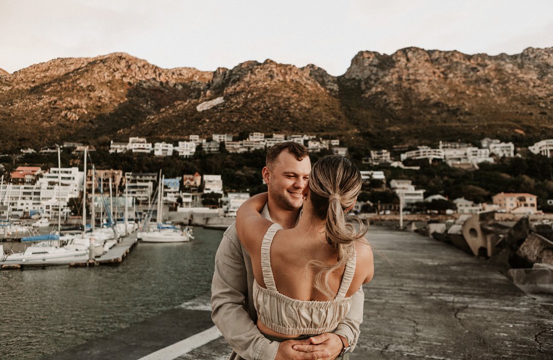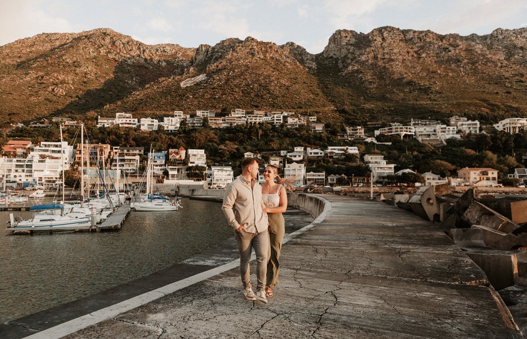 Jul fotosessie se ligging is die ander belangrike punt. Die berg en see uitsigte van die paartjie se fotosessie is besonders mooi. Hulle fotosessie was op die hawe se muur in Gordonsbaai wat die mooiste uitsigte en perfekte agtergrond bied. Die bootjies in die hawe is só mooi en skep ʼn perfekte strand voorkoms. Elke element van die paartjie se fotosessie is perfek en die sagte sonsak lig skep ʼn romantiese warm voorkoms aan die foto’s.