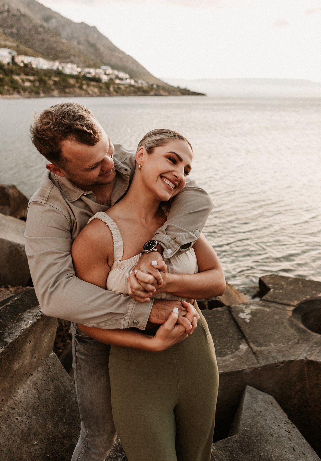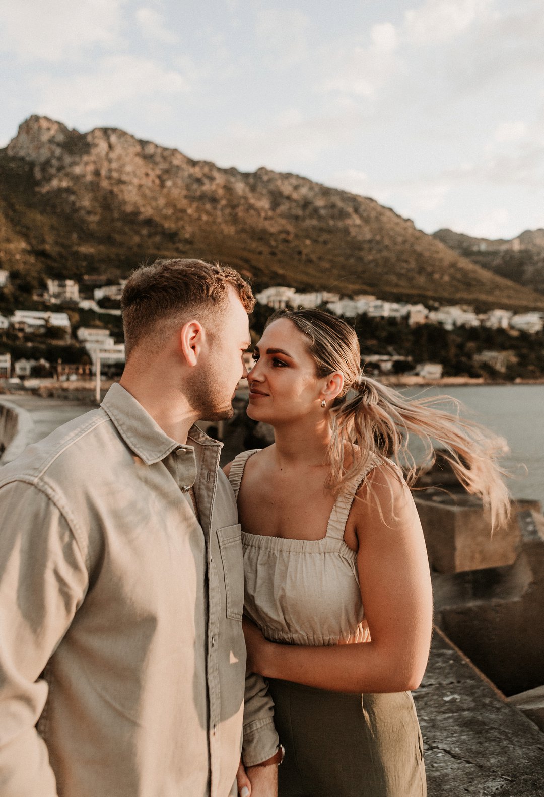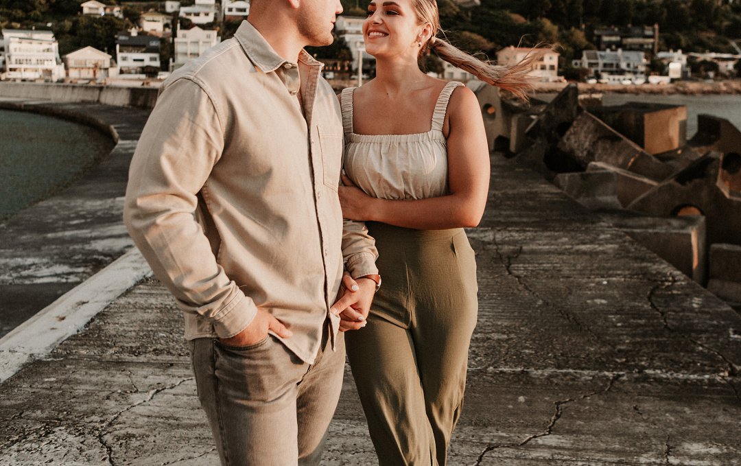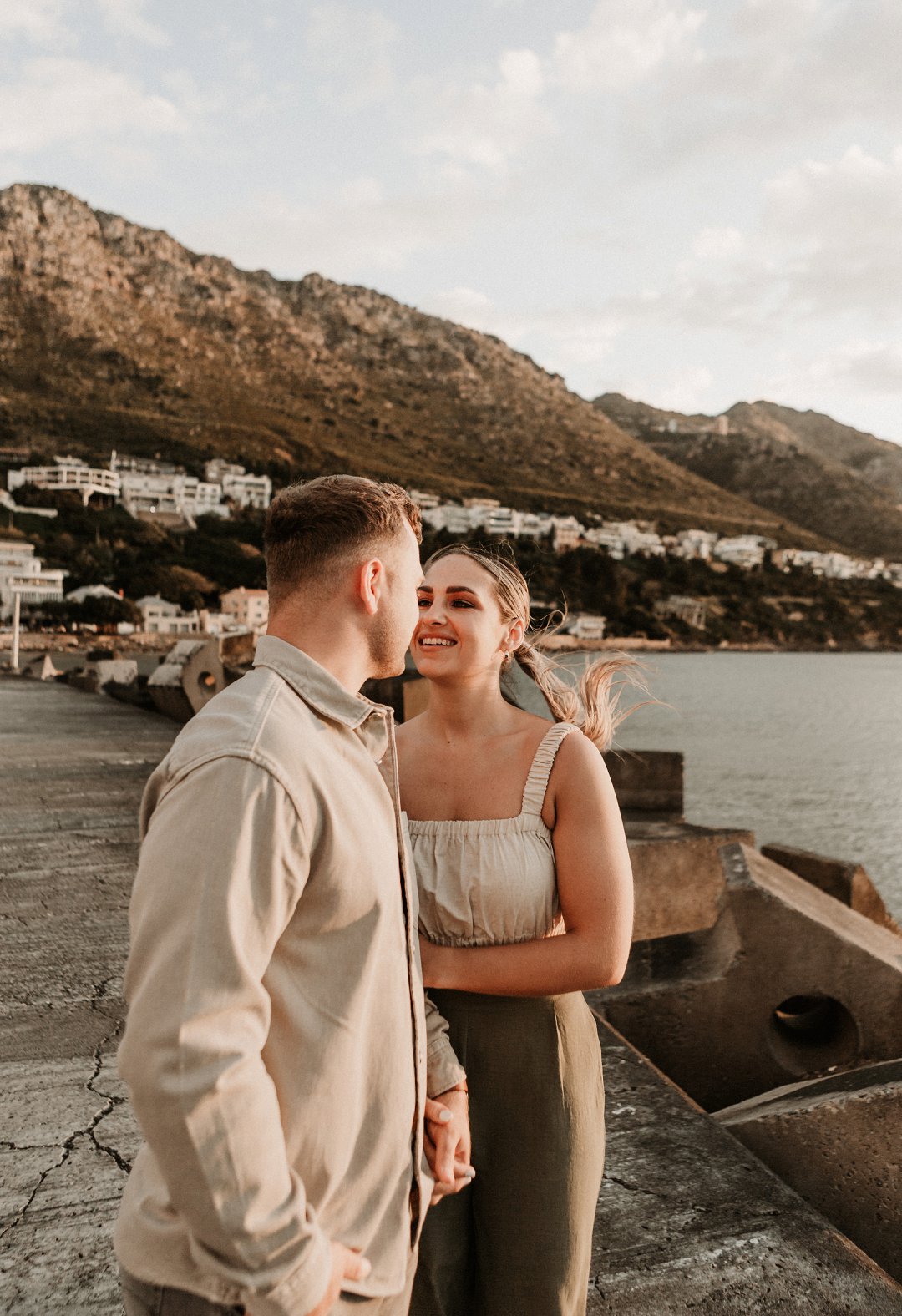 Jul fotosessie se ligging is die ander belangrike punt. Die berg en see uitsigte van die paartjie se fotosessie is besonders mooi. Hulle fotosessie was op die hawe se muur in Gordonsbaai wat die mooiste uitsigte en perfekte agtergrond bied. Die bootjies in die hawe is só mooi en skep ʼn perfekte strand voorkoms. Elke element van die paartjie se fotosessie is perfek en die sagte sonsak lig skep ʼn romantiese warm voorkoms aan die foto’s.