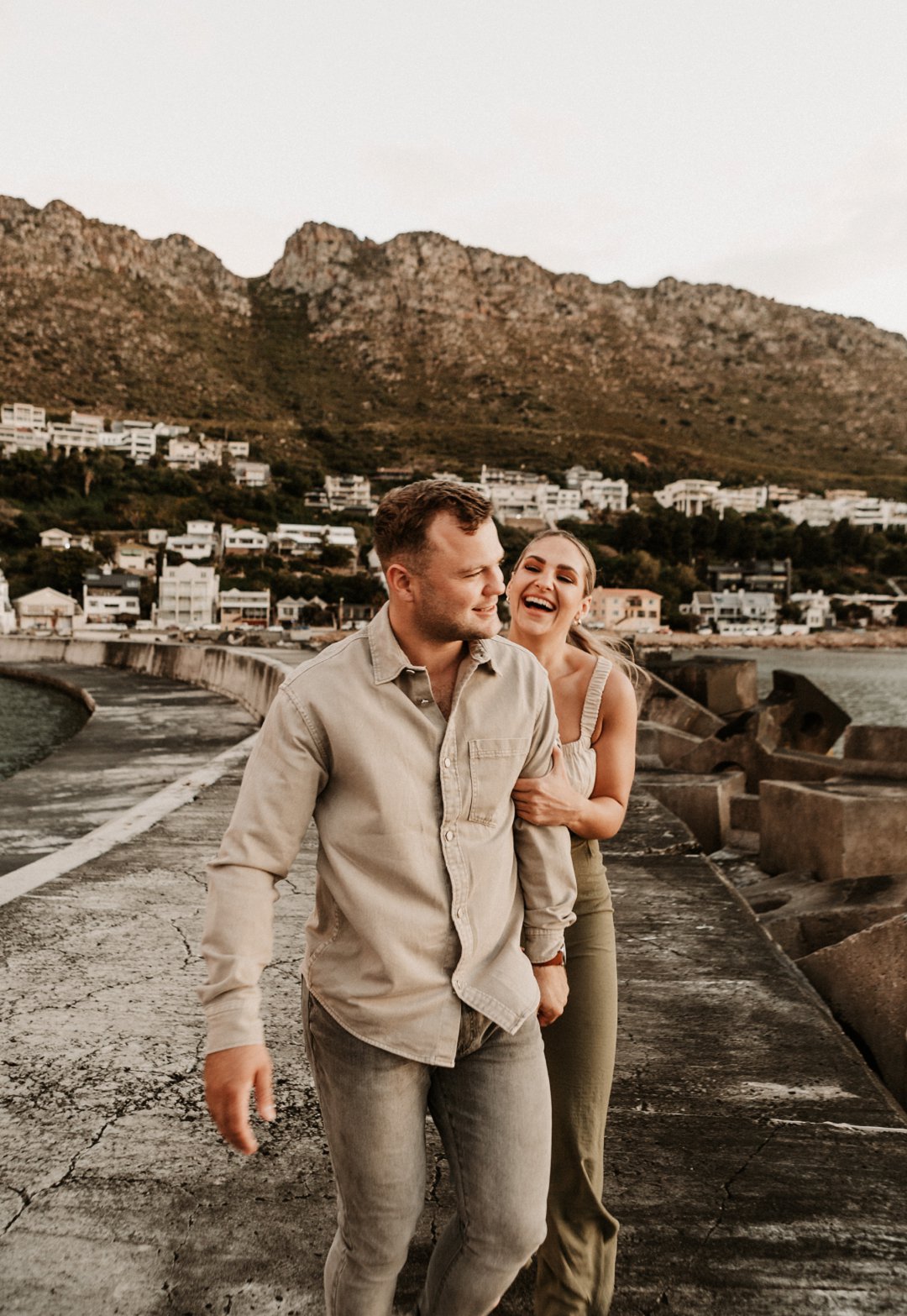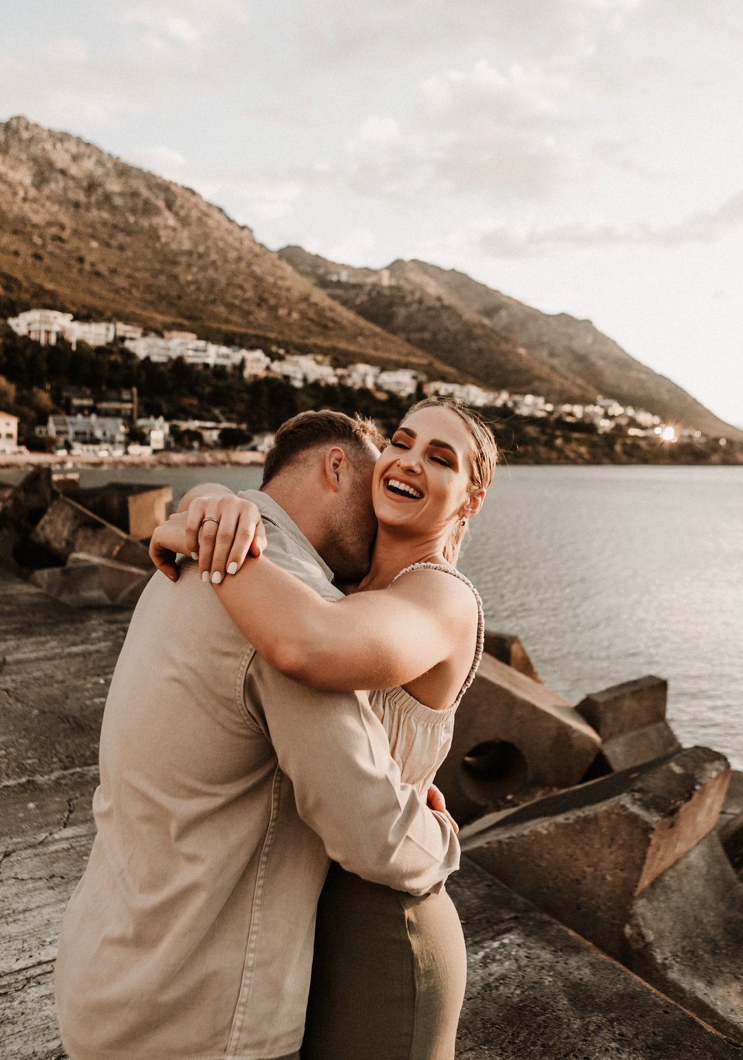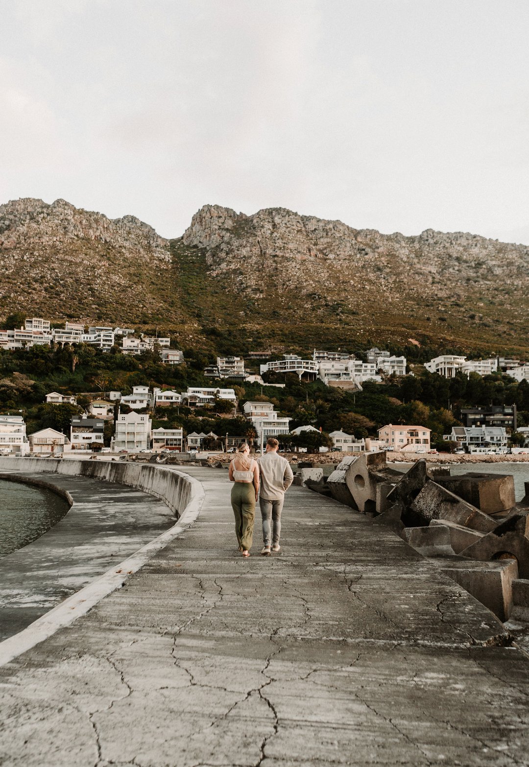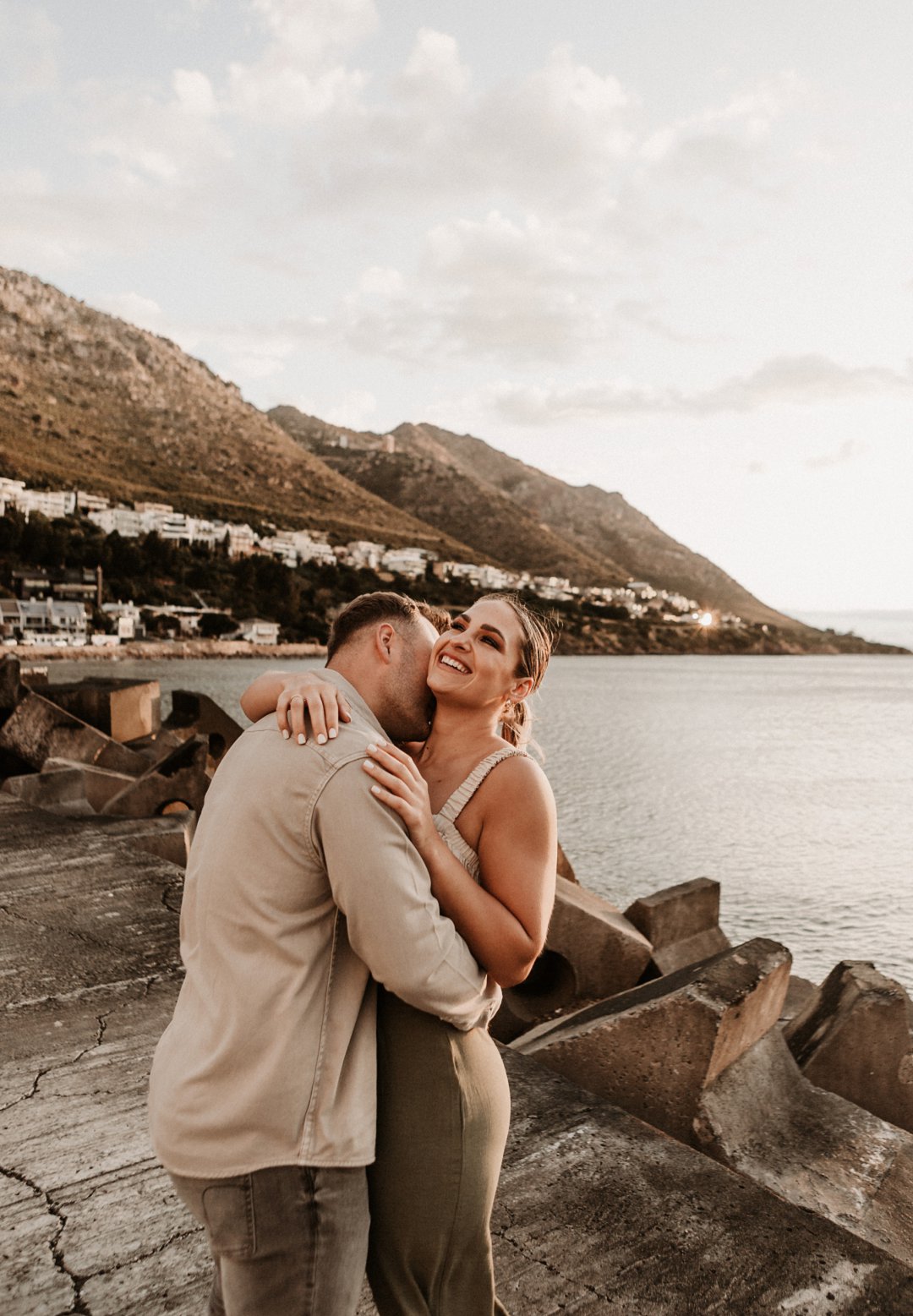 Jul fotosessie se ligging is die ander belangrike punt. Die berg en see uitsigte van die paartjie se fotosessie is besonders mooi. Hulle fotosessie was op die hawe se muur in Gordonsbaai wat die mooiste uitsigte en perfekte agtergrond bied. Die bootjies in die hawe is só mooi en skep ʼn perfekte strand voorkoms. Elke element van die paartjie se fotosessie is perfek en die sagte sonsak lig skep ʼn romantiese warm voorkoms aan die foto’s.
