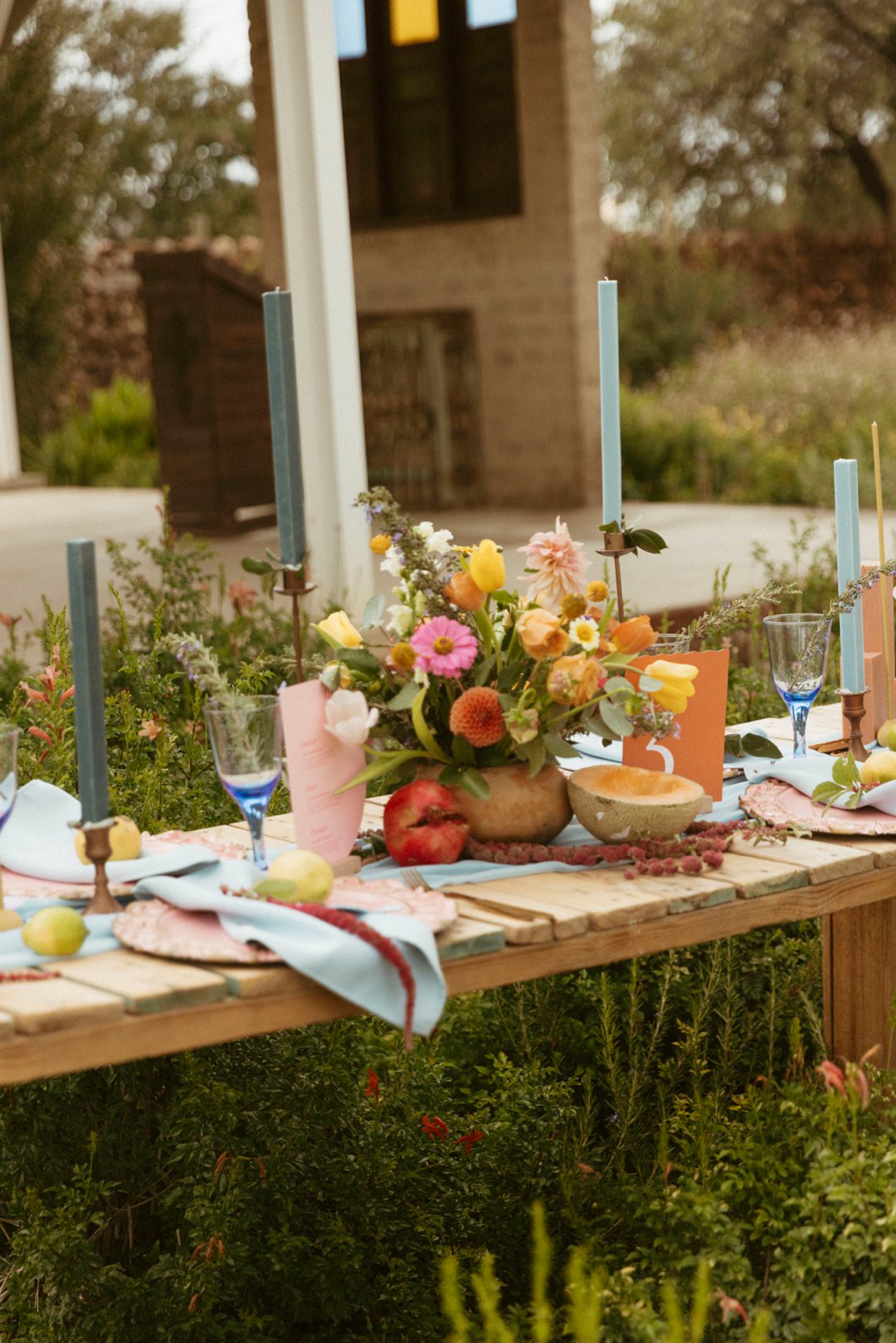 Hout tafels is bedek met kleurvolle dekor elemente. Kombinasie van kleurvolle helder blom ontwerpe en vars vrugte soos spanspek, suurlemoen en granaat. Handgemaakte klei potte vanuit Namibië was gebruik vir die blom ontwerpe. Dié potte pas perfek by die dekor elemente en ʼn pragtige balans geskep het vir die helder kleure. Skakerings van pienke en bloue kan ook op die tafel gesien word in die loper en materiaal servette.