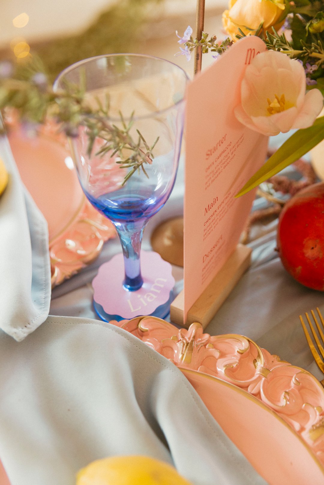 “Fruity & Floral” – Dit is ’n wilde viering van lewendige kleur om te bewys dat kleur ʼn terugkeer maak in troues. Ons het almal uitgegaan om prettige en onverwagte maniere te kry om jou groot dag met ʼn kaleidoskoop van kleure te laat spat. Enige kleur wat vrolik is het ons gebruik en dit weer sag te maak deur ligte pienk en blou op die tafels te gebruik.