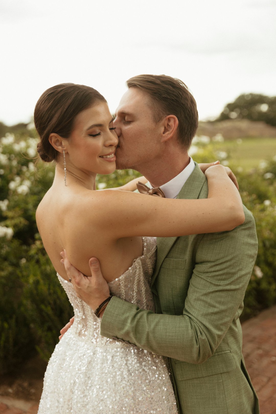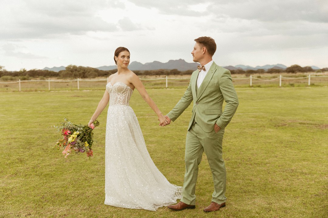 Die ryk toon van olyfgroen is die perfekte kleur vir die bruidegom se pak. ʼn Duidelike afwyking van tradisionele pak keuses, wat die tema van “Fruity & Floral” weerspieël. In ʼn doelbewuste afwyking van tradisionele drag, dien hierdie onkonvensionele keuse as ʼn gewaagde uitdrukking van persoonlikheid en styl. Aardse skakering straal ʼn gevoel van natuurlike sofistikasie uit, wat die elegansie van die trourok perfek komplementeer terwyl dit ʼn verfrissende kinkel byvoeg.
