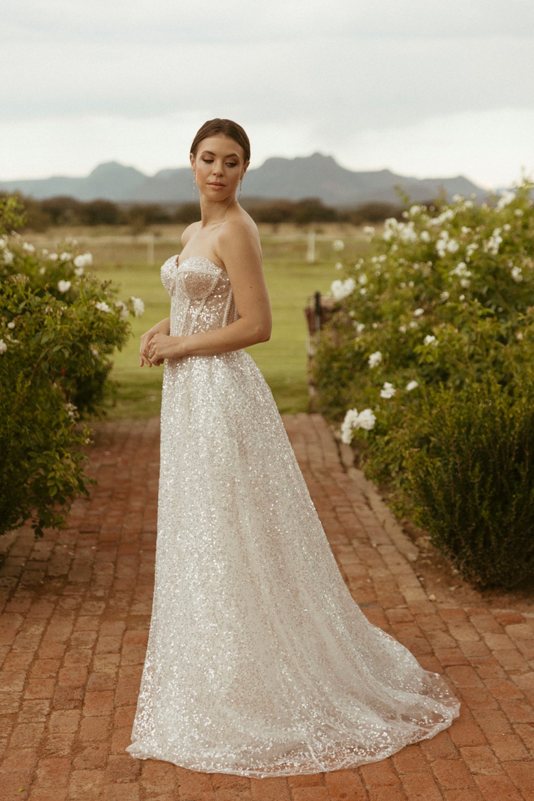 Omrede die dekor baie helder is het ons besluit dat ons ʼn klassieke styl trourok wil hê, maar wat nogsteeds ʼn indruk maak. Hierdie pragtige trourok beklemtoon ʼn klassieke styl met ʼn moderne kinkel. Die skoon lyne en minimalistiese silhoeët laat die bruid toe om selfvertroue uit te straal. Hierdie trourok se “sequins” detail afwerking gee die rok lewe. Blink wat in die lig dans as die bruid rond beweeg. Hierdie trourok was perfek vir ons fotosessie en is nie net ʼn kledingstuk nie; dit is ʼn viering van vroulikheid, elegansie en die tydlose aanloklikheid in die wêreld van trourokke.