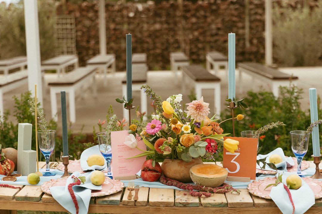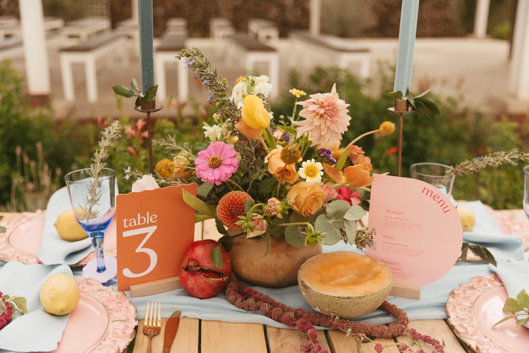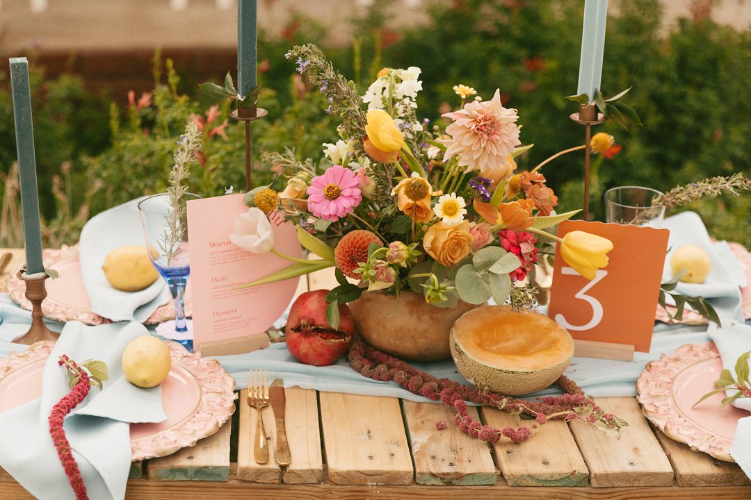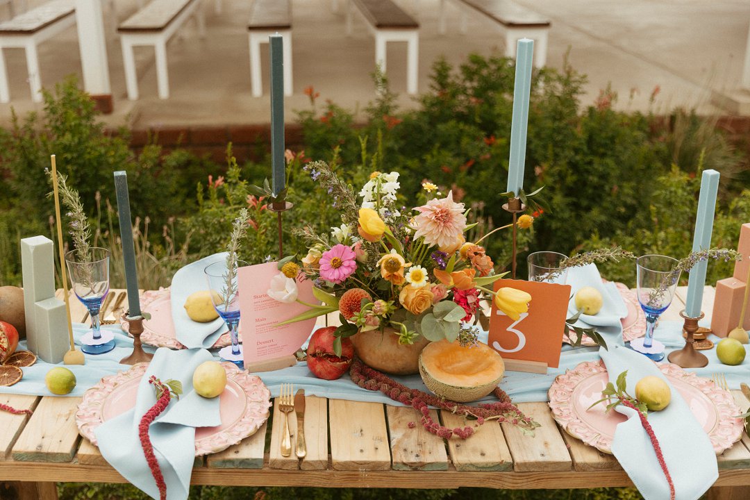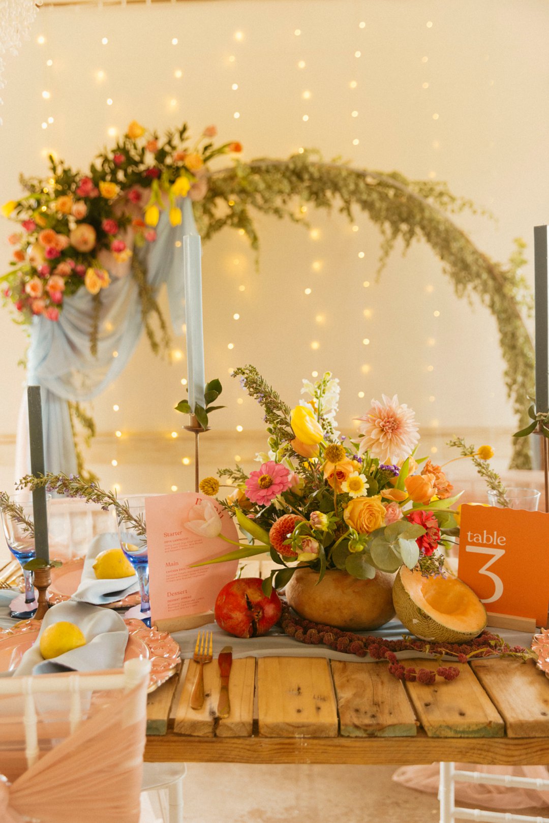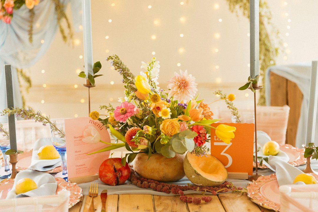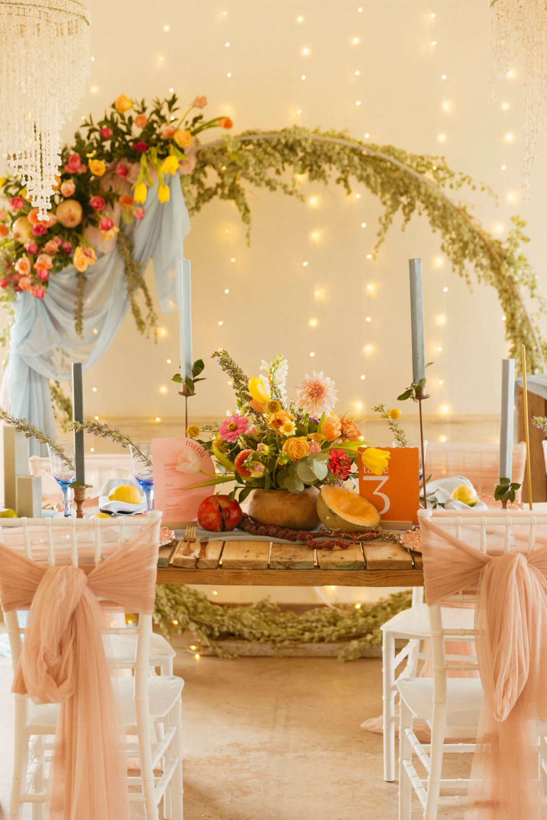 “Fruity & Floral” – Dit is ’n wilde viering van lewendige kleur om te bewys dat kleur ʼn terugkeer maak in troues. Ons het almal uitgegaan om prettige en onverwagte maniere te kry om jou groot dag met ʼn kaleidoskoop van kleure te laat spat. Enige kleur wat vrolik is het ons gebruik en dit weer sag te maak deur ligte pienk en blou op die tafels te gebruik.