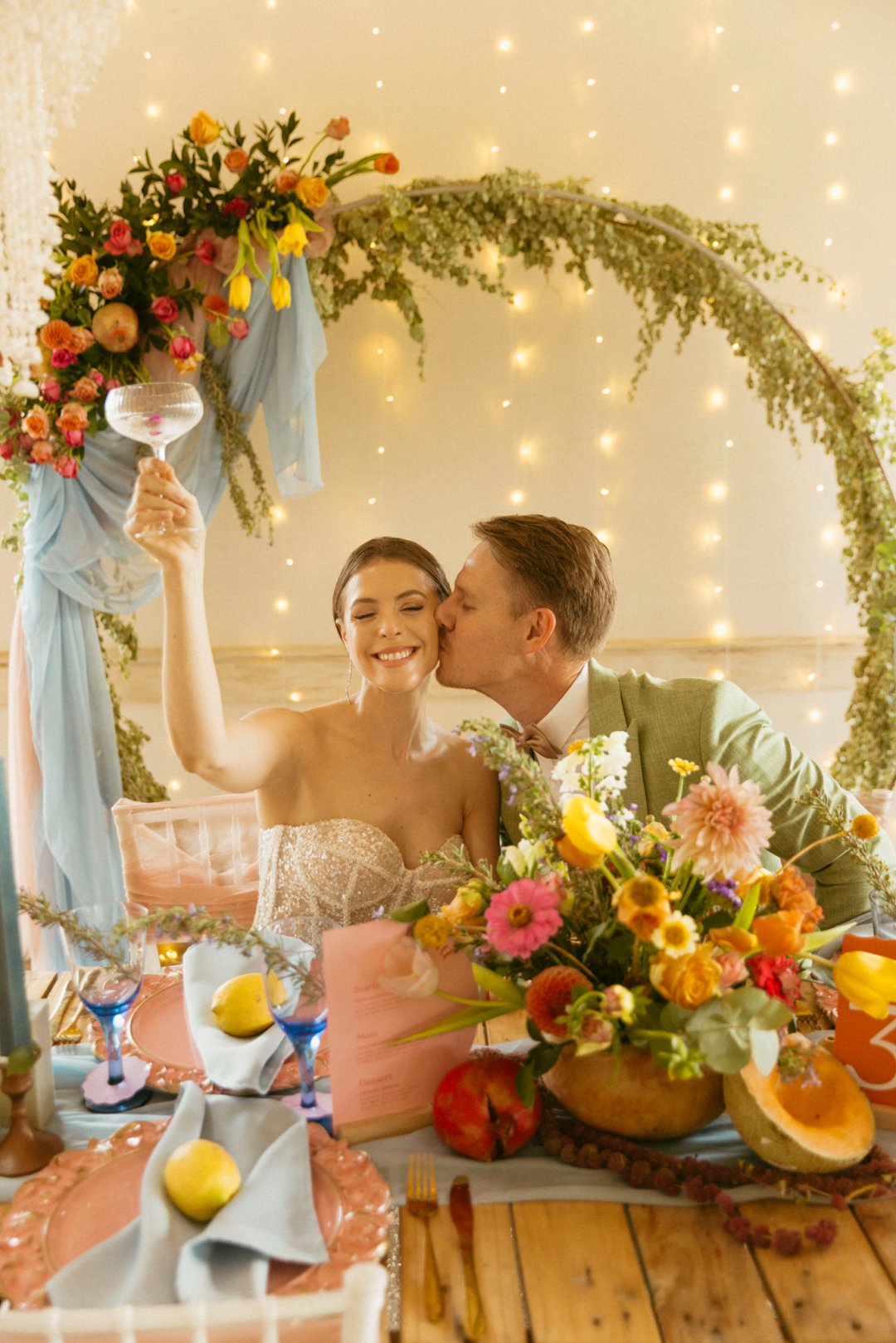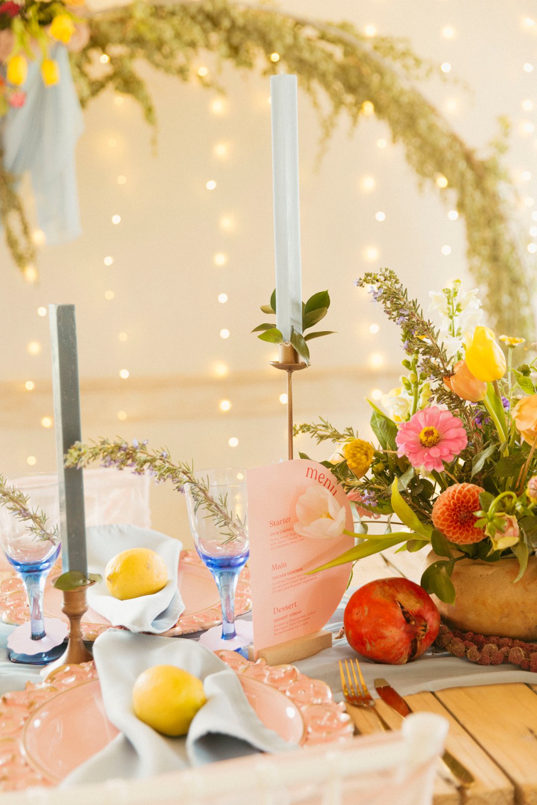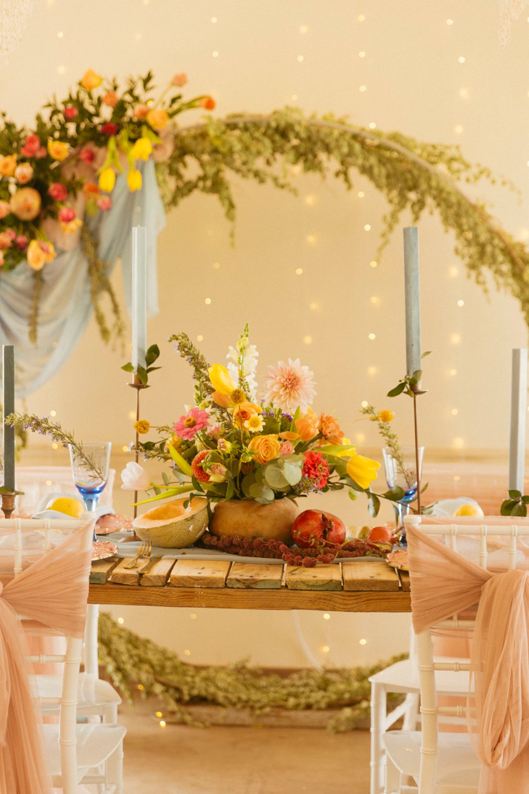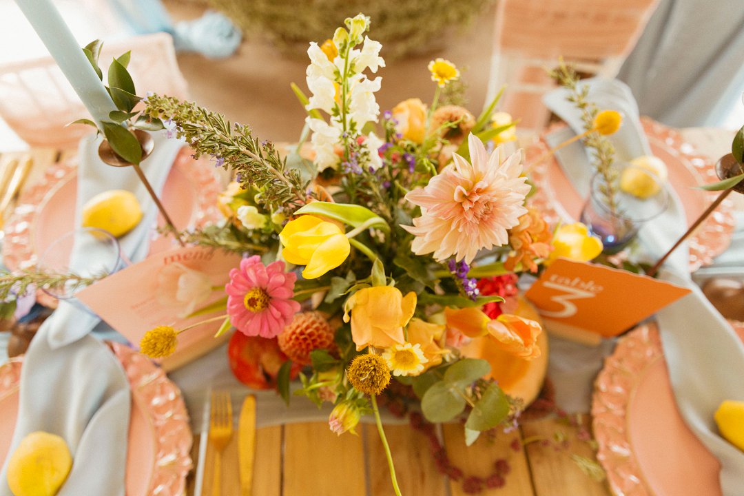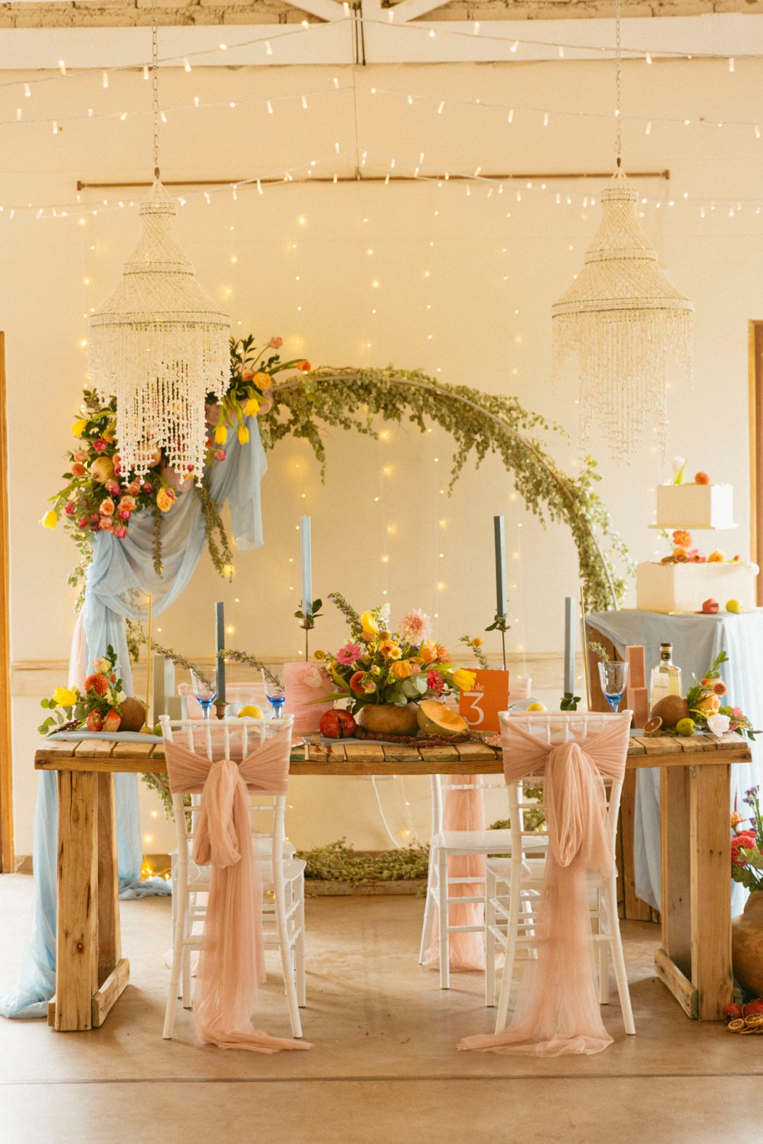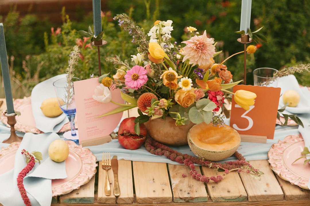 “Fruity & Floral” – Dit is ’n wilde viering van lewendige kleur om te bewys dat kleur ʼn terugkeer maak in troues. Ons het almal uitgegaan om prettige en onverwagte maniere te kry om jou groot dag met ʼn kaleidoskoop van kleure te laat spat. Enige kleur wat vrolik is het ons gebruik en dit weer sag te maak deur ligte pienk en blou op die tafels te gebruik.