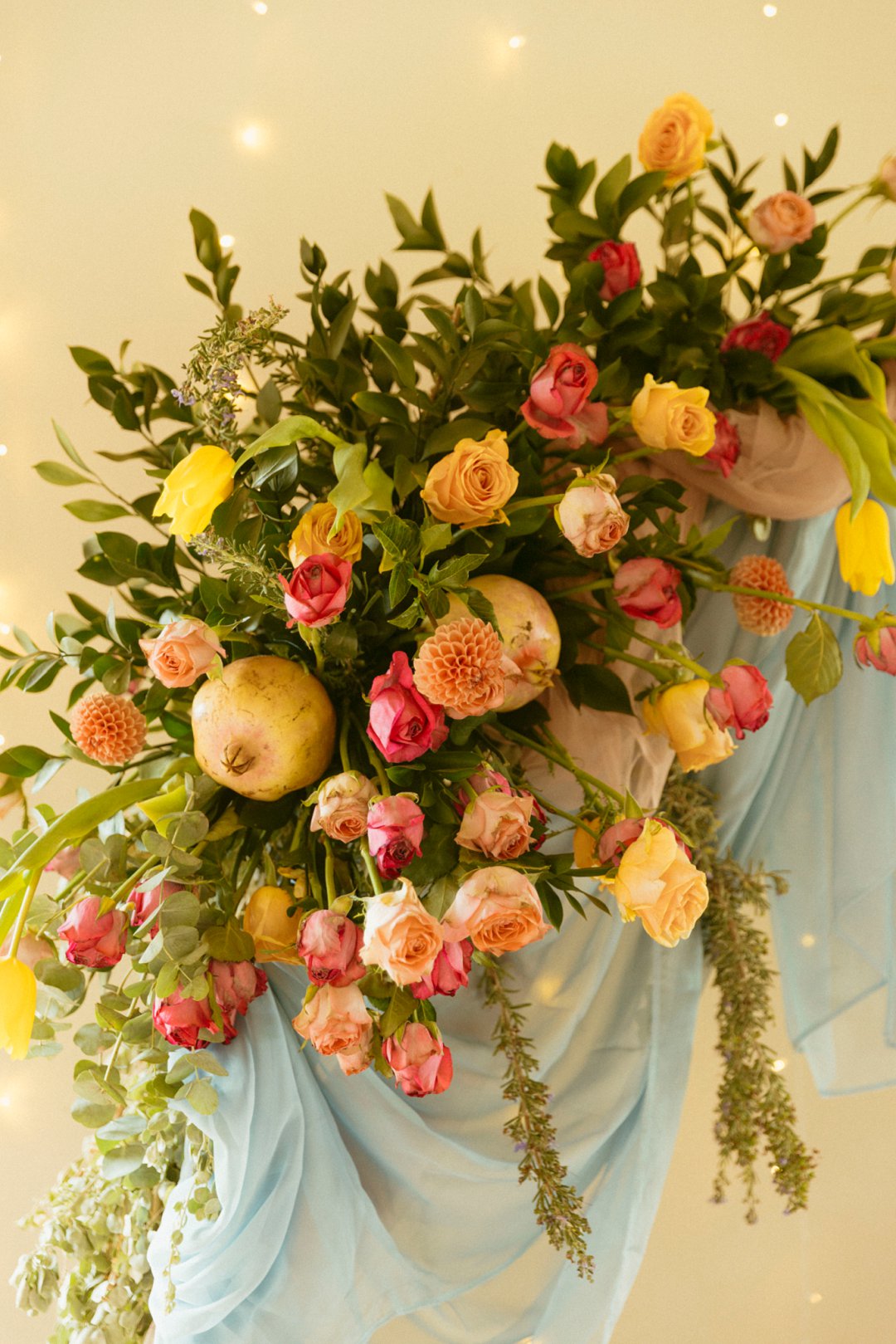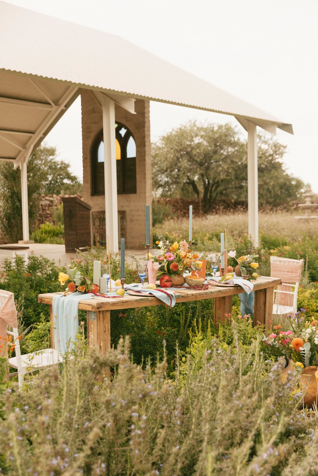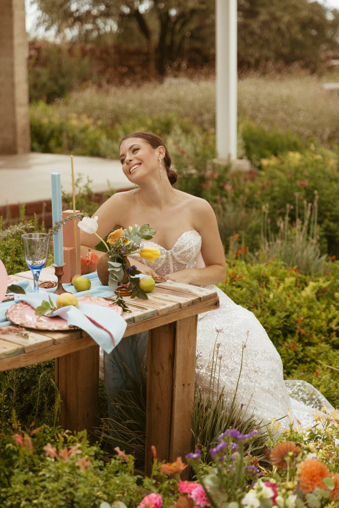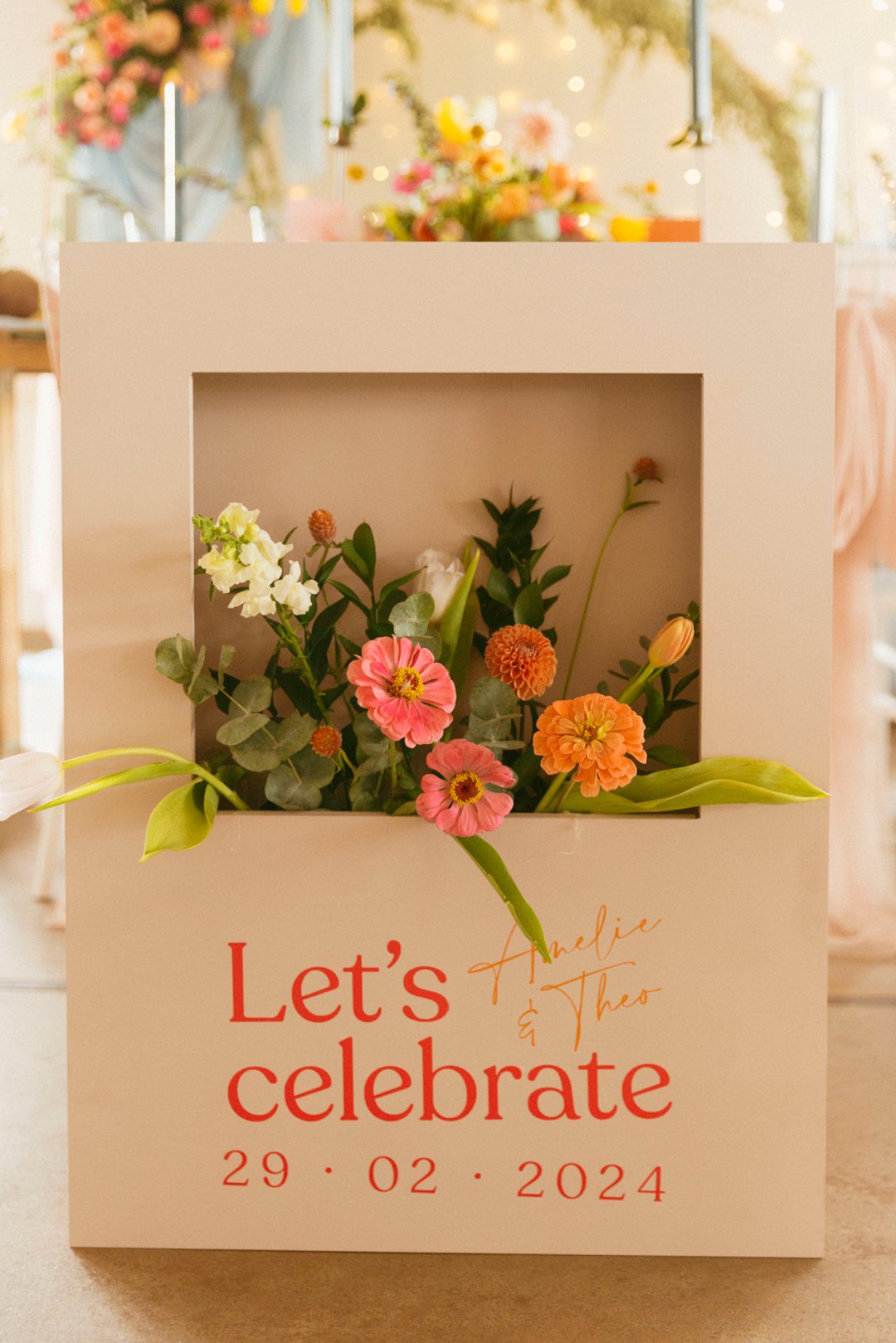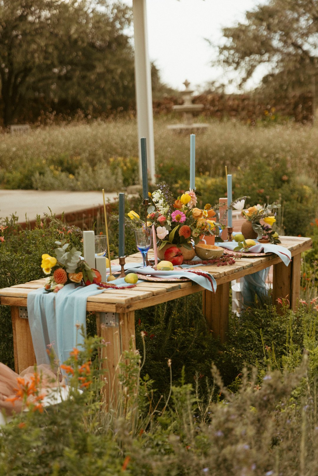 “Fruity & Floral” – Dit is ’n wilde viering van lewendige kleur om te bewys dat kleur ʼn terugkeer maak in troues. Ons het almal uitgegaan om prettige en onverwagte maniere te kry om jou groot dag met ʼn kaleidoskoop van kleure te laat spat. Enige kleur wat vrolik is het ons gebruik en dit weer sag te maak deur ligte pienk en blou op die tafels te gebruik.