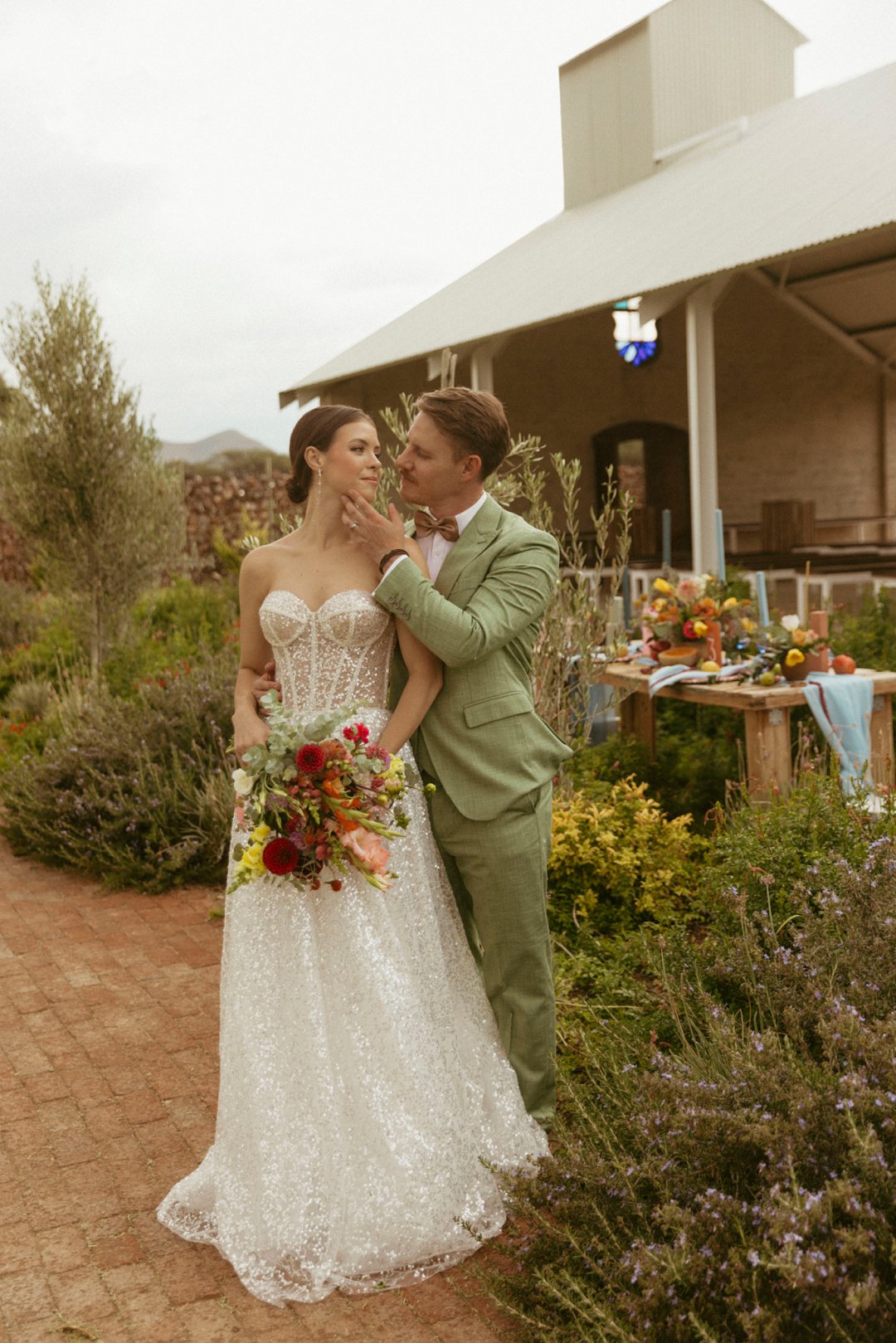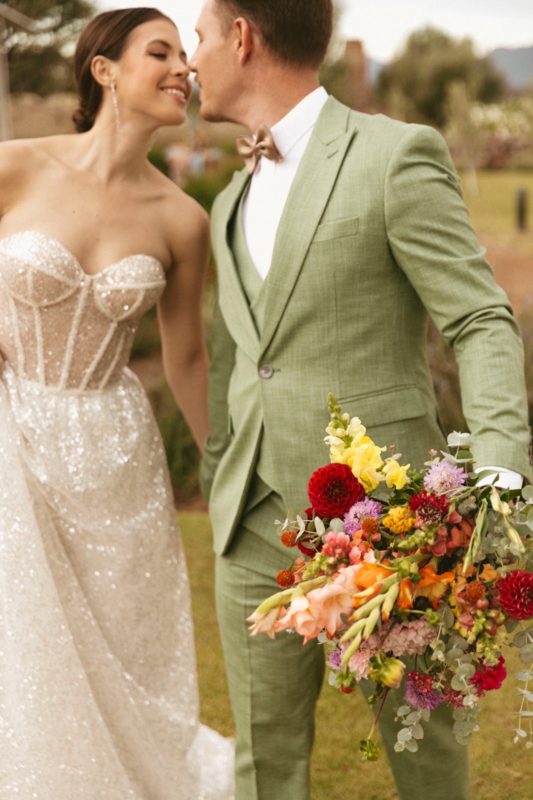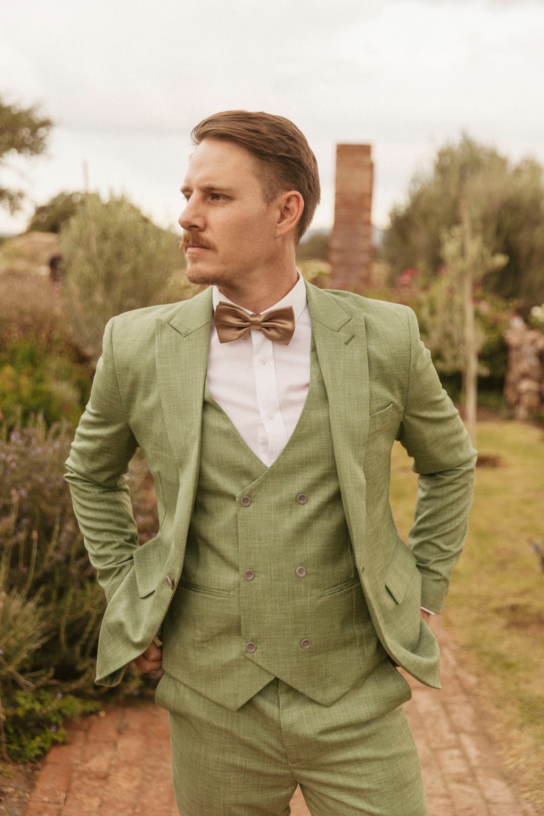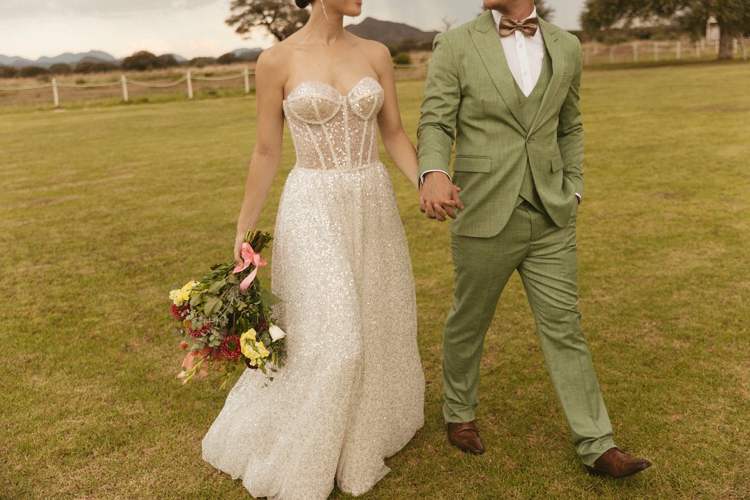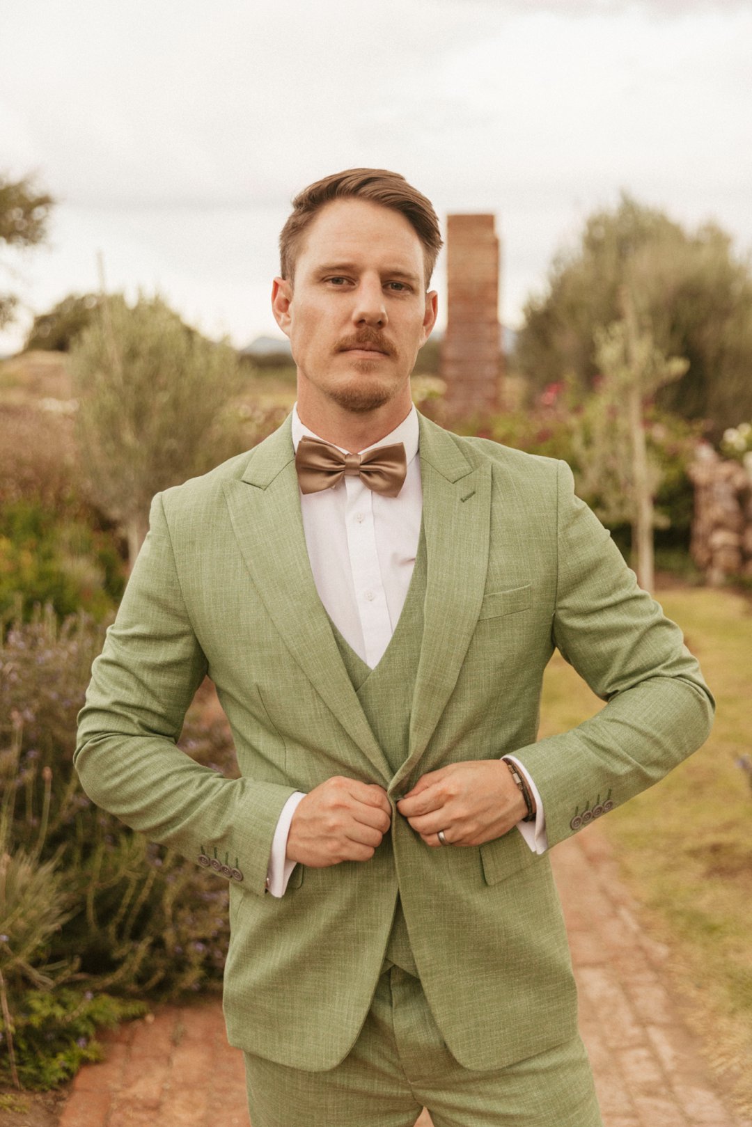 Die ryk toon van olyfgroen is die perfekte kleur vir die bruidegom se pak. ʼn Duidelike afwyking van tradisionele pak keuses, wat die tema van “Fruity & Floral” weerspieël. In ʼn doelbewuste afwyking van tradisionele drag, dien hierdie onkonvensionele keuse as ʼn gewaagde uitdrukking van persoonlikheid en styl. Aardse skakering straal ʼn gevoel van natuurlike sofistikasie uit, wat die elegansie van die trourok perfek komplementeer terwyl dit ʼn verfrissende kinkel byvoeg.