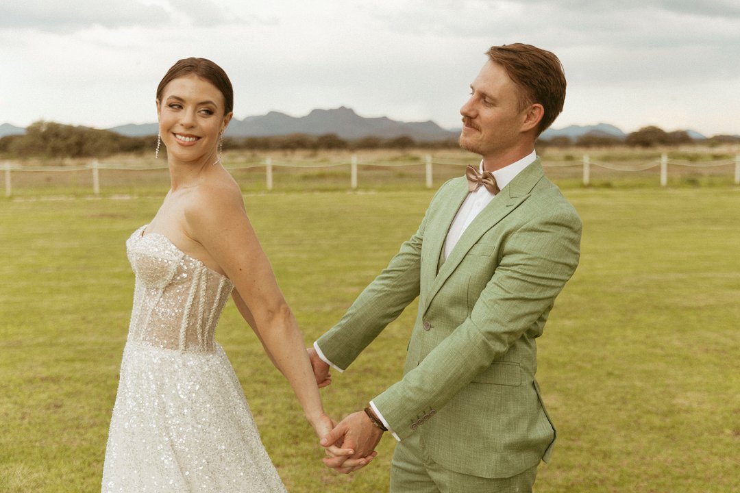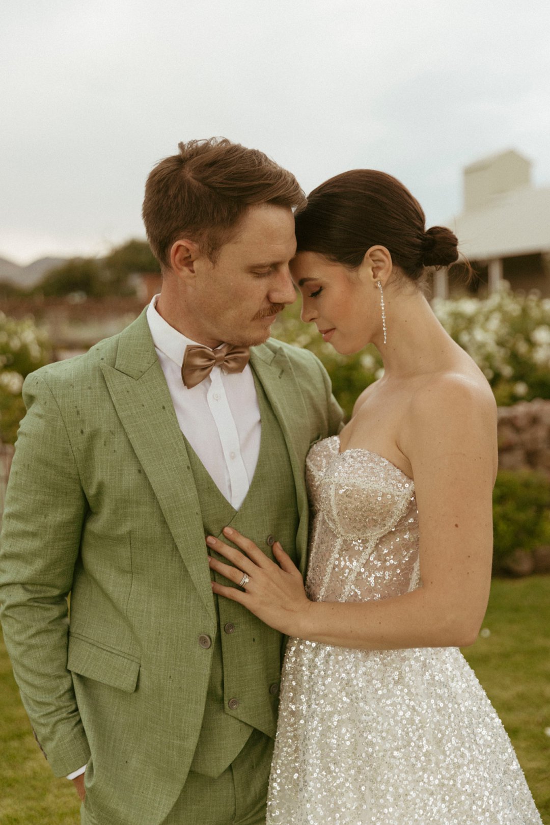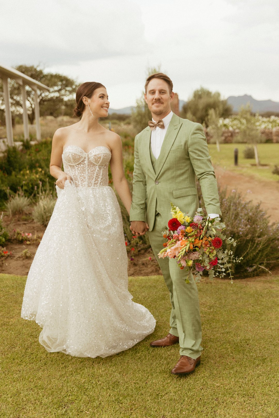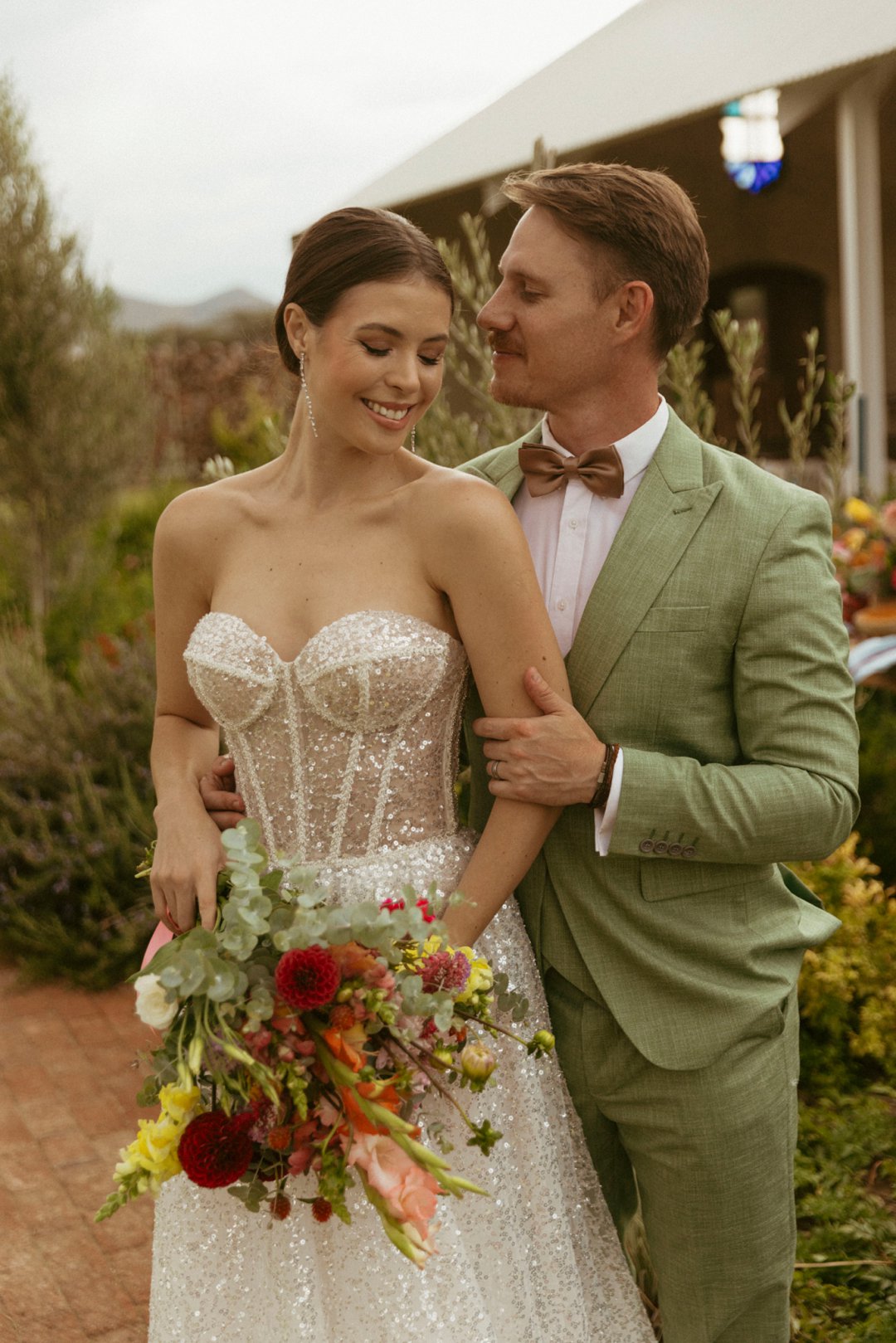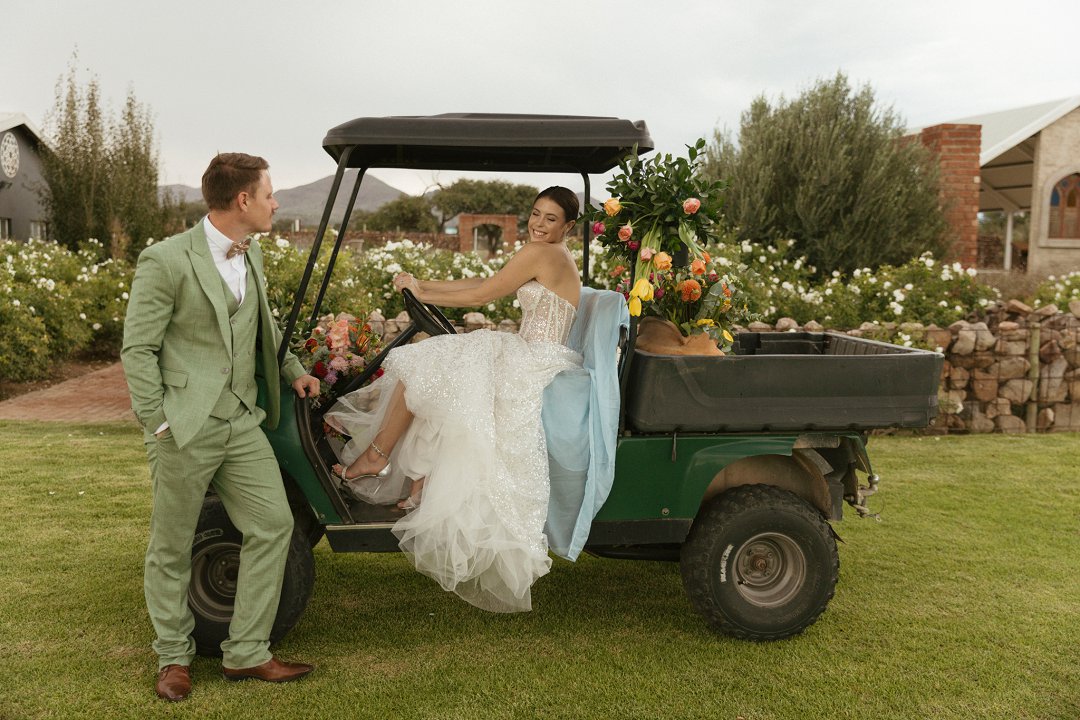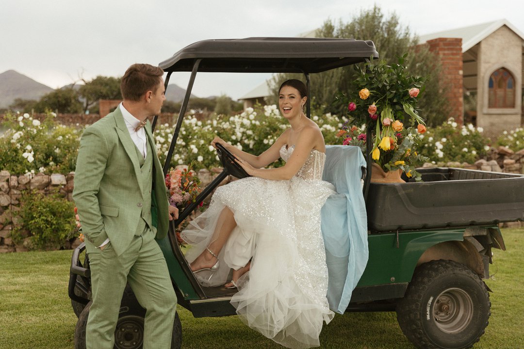 Die ryk toon van olyfgroen is die perfekte kleur vir die bruidegom se pak. ʼn Duidelike afwyking van tradisionele pak keuses, wat die tema van “Fruity & Floral” weerspieël. In ʼn doelbewuste afwyking van tradisionele drag, dien hierdie onkonvensionele keuse as ʼn gewaagde uitdrukking van persoonlikheid en styl. Aardse skakering straal ʼn gevoel van natuurlike sofistikasie uit, wat die elegansie van die trourok perfek komplementeer terwyl dit ʼn verfrissende kinkel byvoeg.