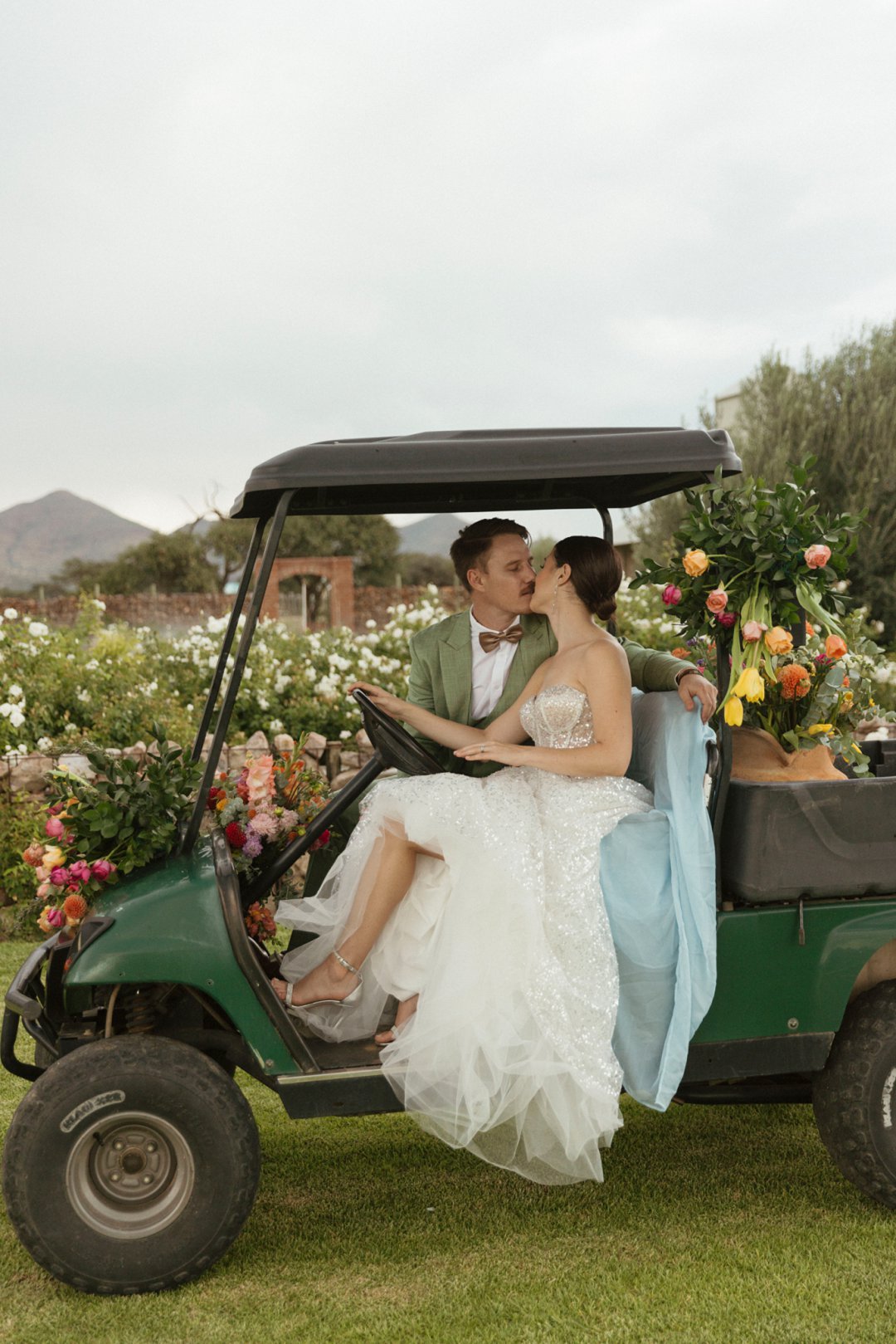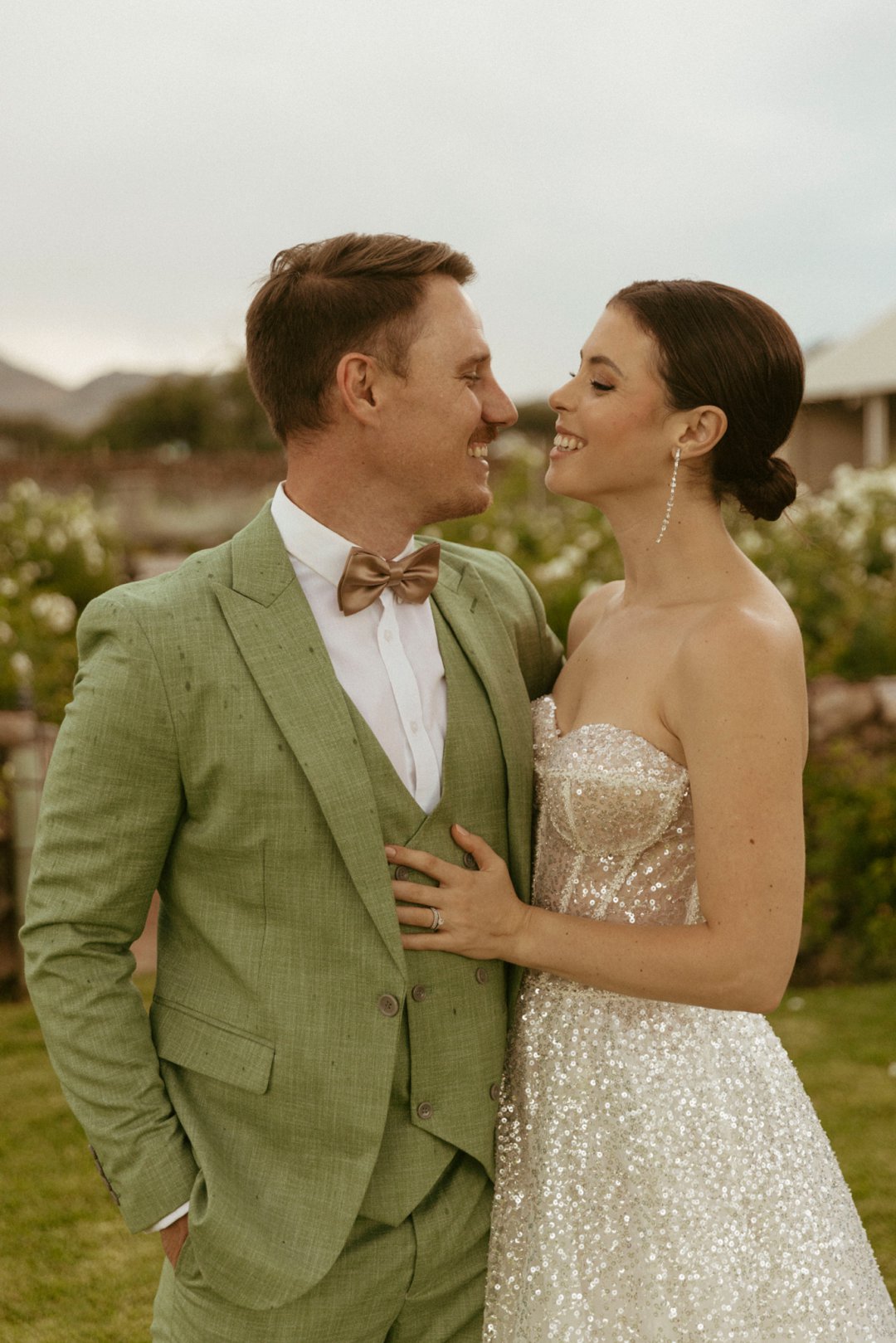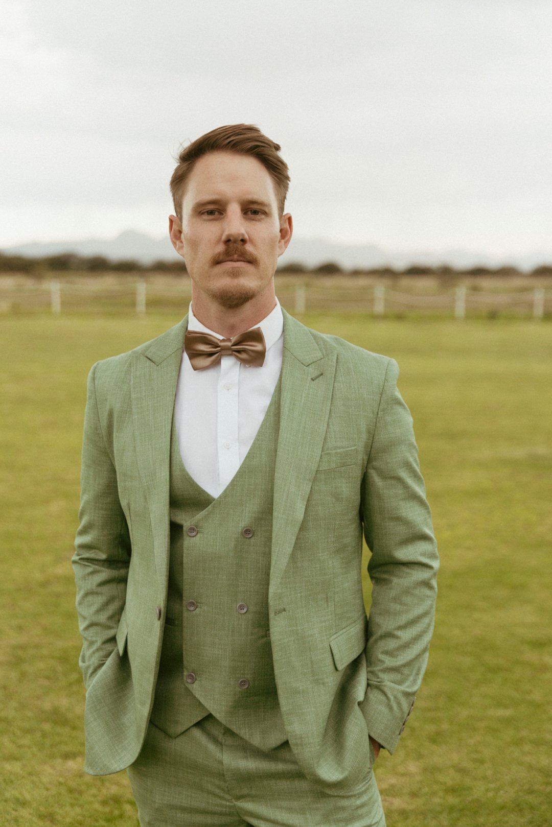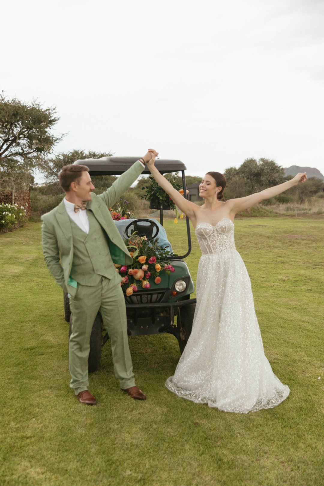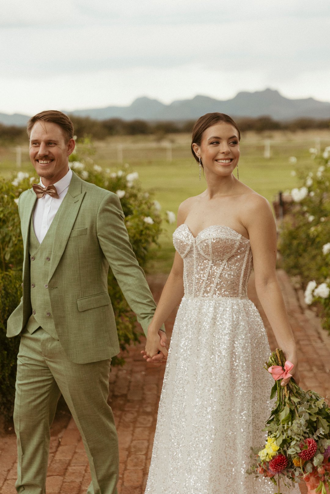 Die ryk toon van olyfgroen is die perfekte kleur vir die bruidegom se pak. ʼn Duidelike afwyking van tradisionele pak keuses, wat die tema van “Fruity & Floral” weerspieël. In ʼn doelbewuste afwyking van tradisionele drag, dien hierdie onkonvensionele keuse as ʼn gewaagde uitdrukking van persoonlikheid en styl. Aardse skakering straal ʼn gevoel van natuurlike sofistikasie uit, wat die elegansie van die trourok perfek komplementeer terwyl dit ʼn verfrissende kinkel byvoeg.