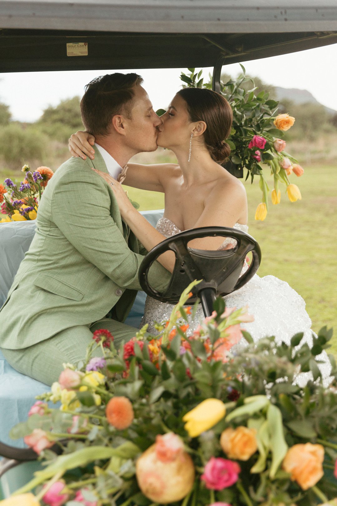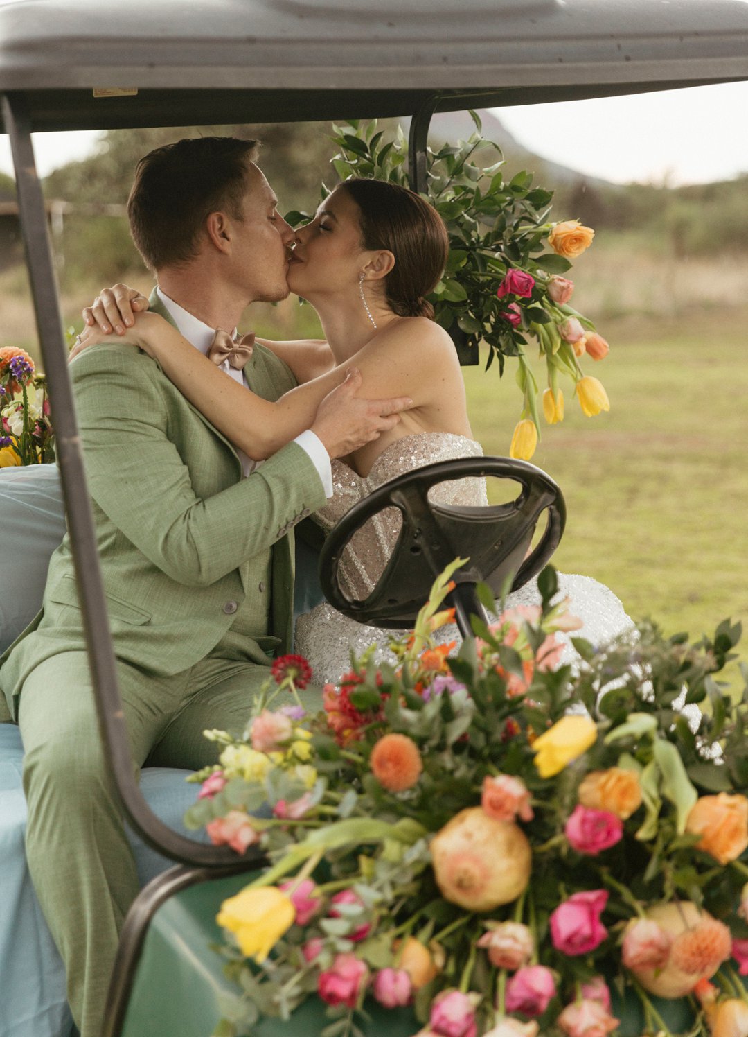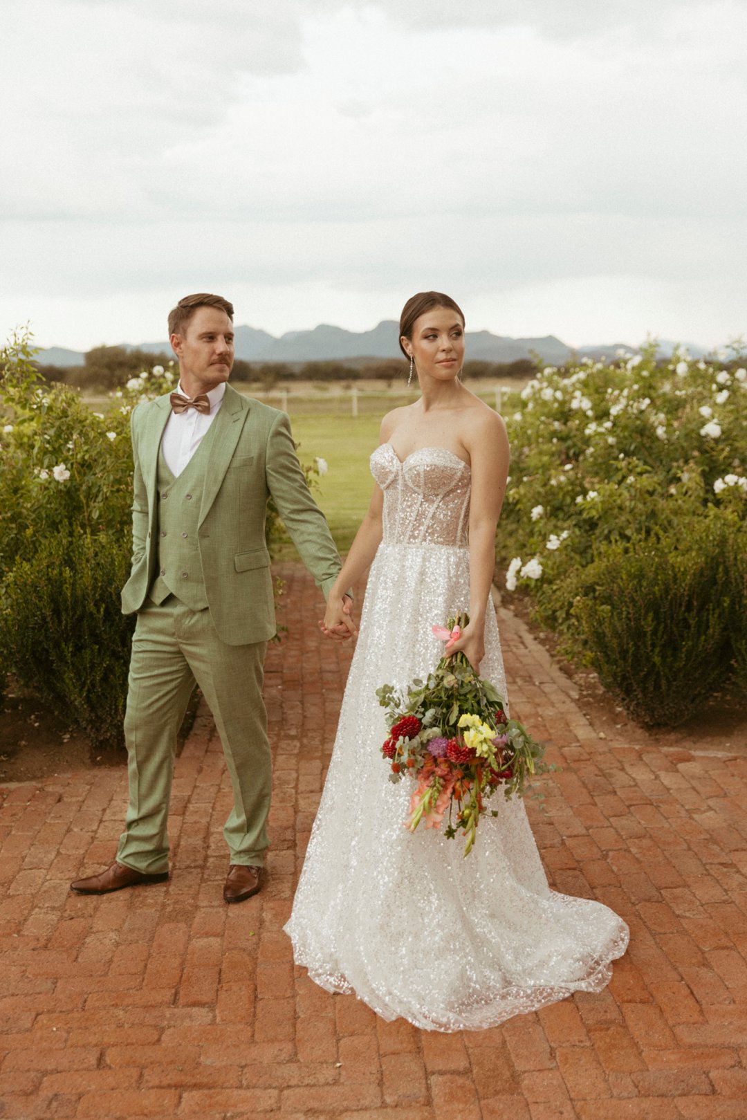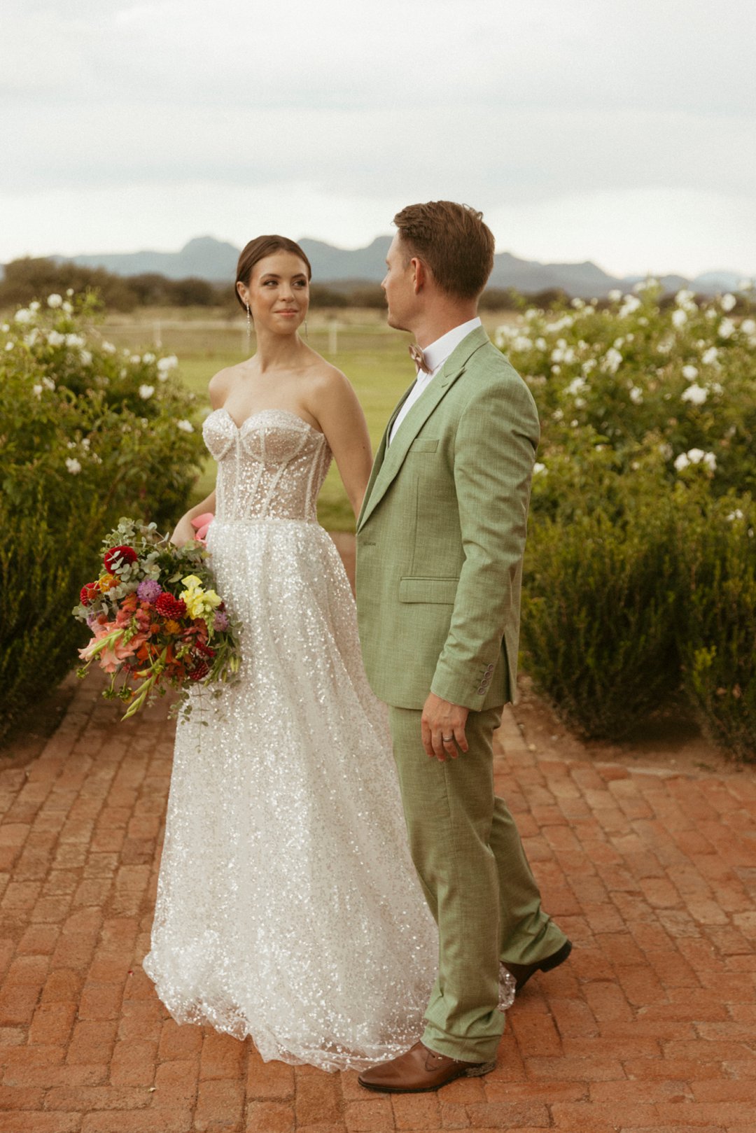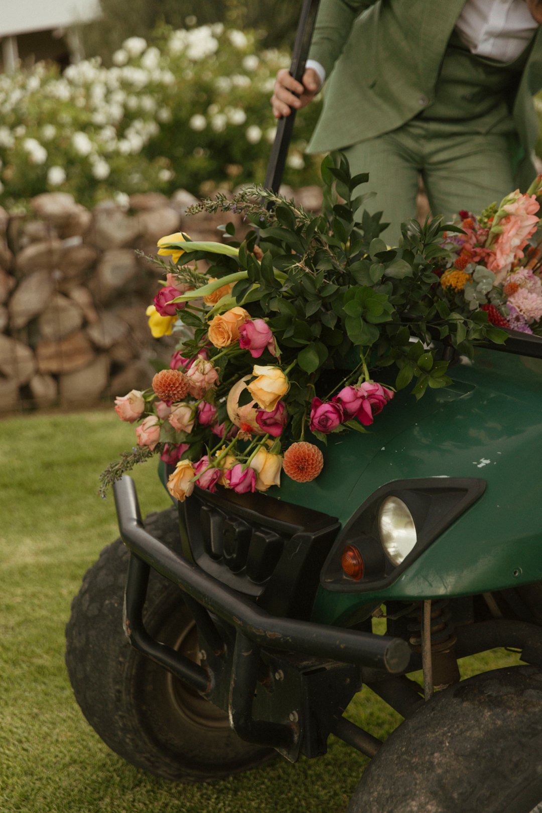 Die ryk toon van olyfgroen is die perfekte kleur vir die bruidegom se pak. ʼn Duidelike afwyking van tradisionele pak keuses, wat die tema van “Fruity & Floral” weerspieël. In ʼn doelbewuste afwyking van tradisionele drag, dien hierdie onkonvensionele keuse as ʼn gewaagde uitdrukking van persoonlikheid en styl. Aardse skakering straal ʼn gevoel van natuurlike sofistikasie uit, wat die elegansie van die trourok perfek komplementeer terwyl dit ʼn verfrissende kinkel byvoeg.