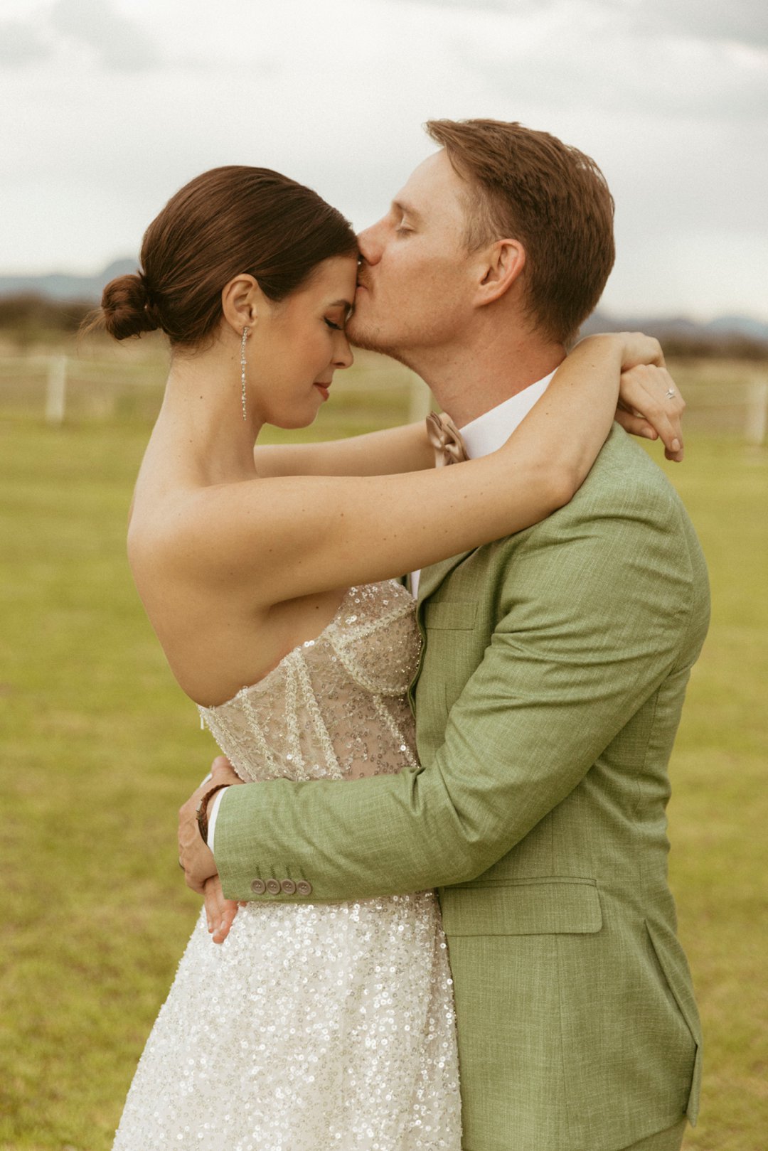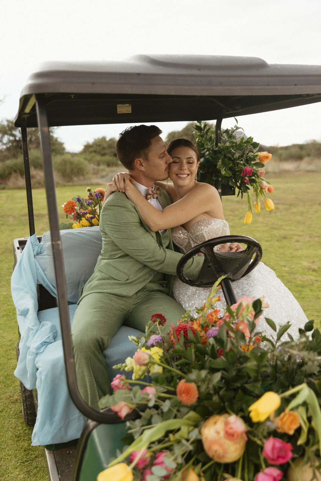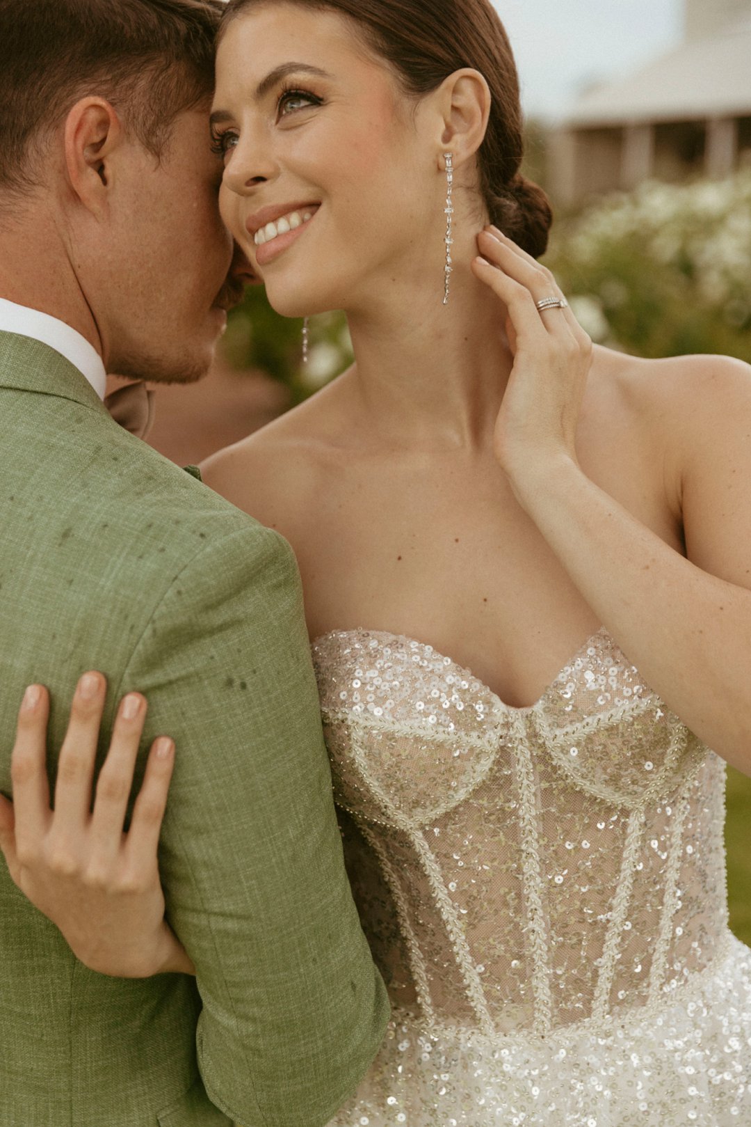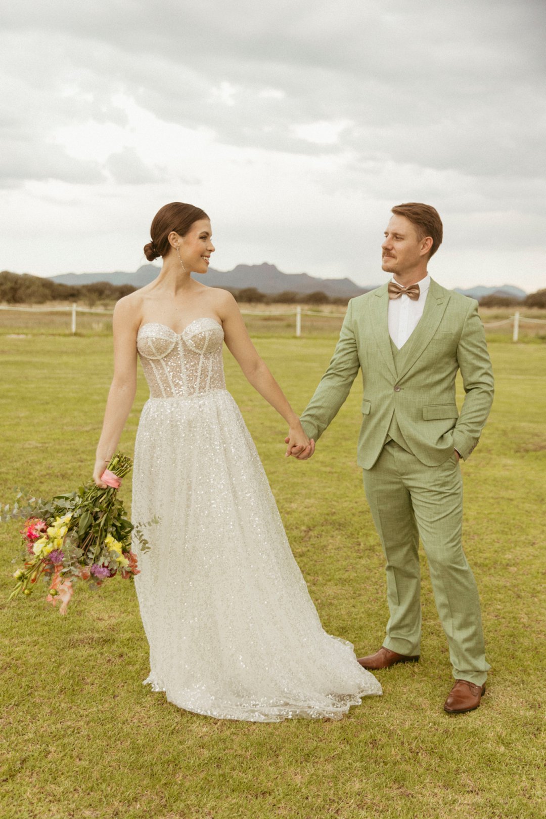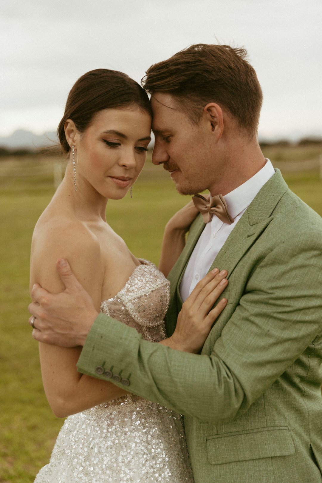 Die ryk toon van olyfgroen is die perfekte kleur vir die bruidegom se pak. ʼn Duidelike afwyking van tradisionele pak keuses, wat die tema van “Fruity & Floral” weerspieël. In ʼn doelbewuste afwyking van tradisionele drag, dien hierdie onkonvensionele keuse as ʼn gewaagde uitdrukking van persoonlikheid en styl. Aardse skakering straal ʼn gevoel van natuurlike sofistikasie uit, wat die elegansie van die trourok perfek komplementeer terwyl dit ʼn verfrissende kinkel byvoeg.