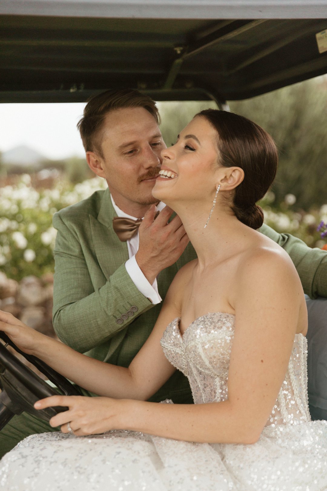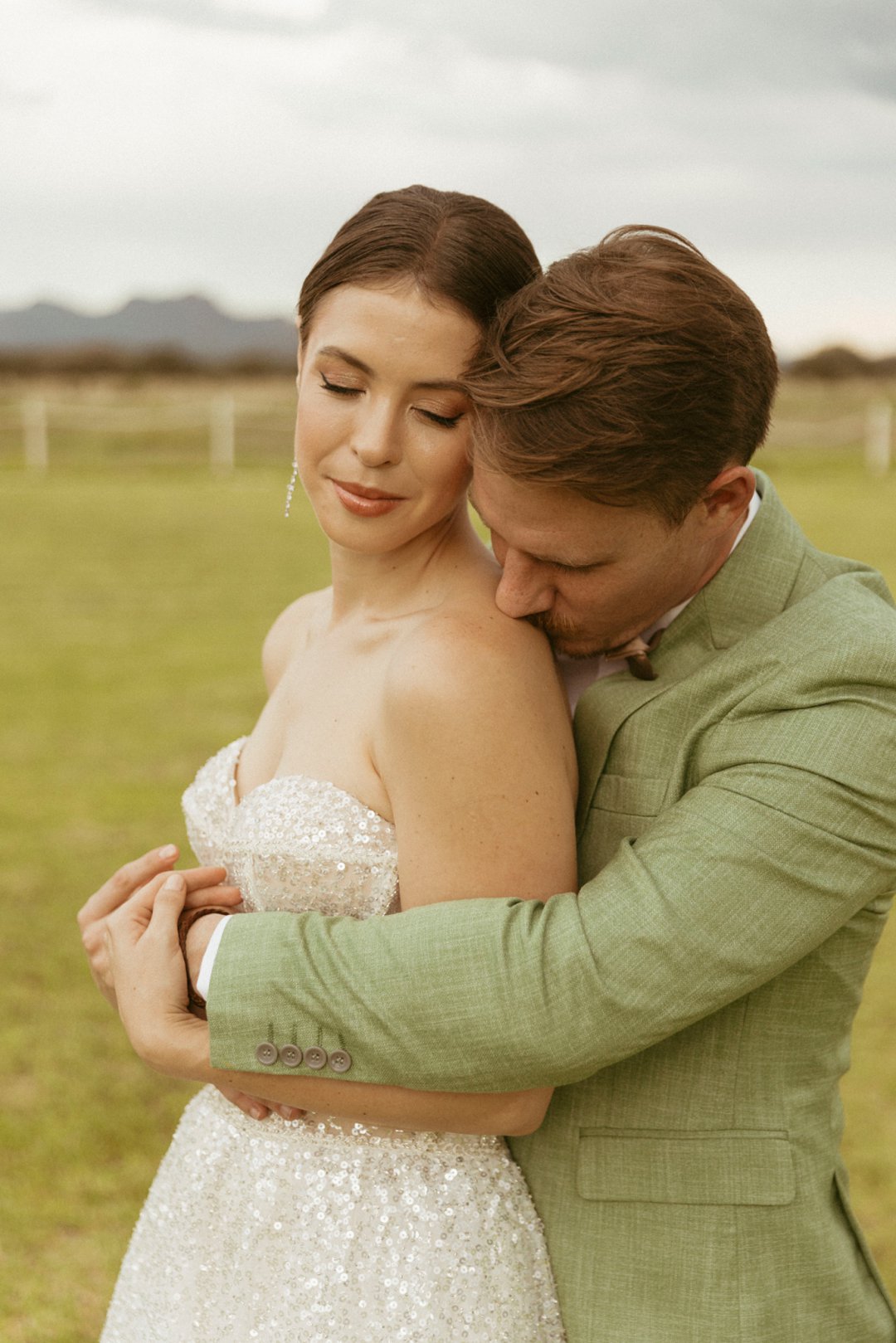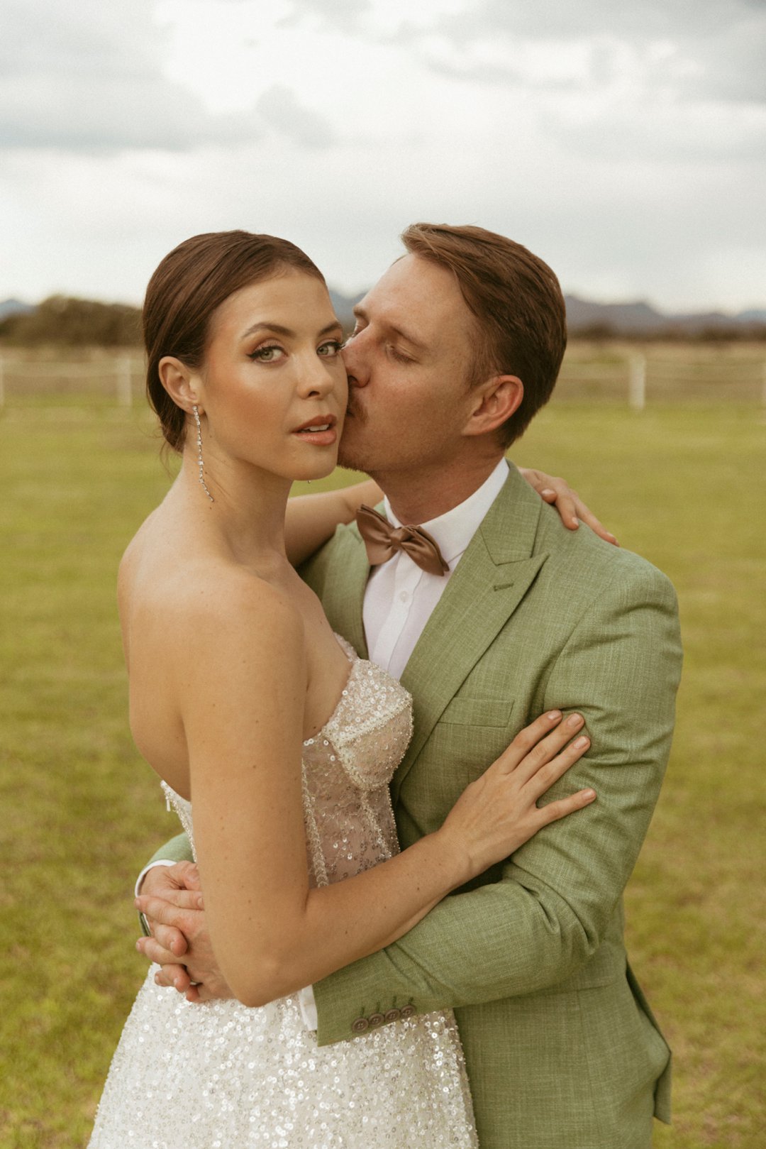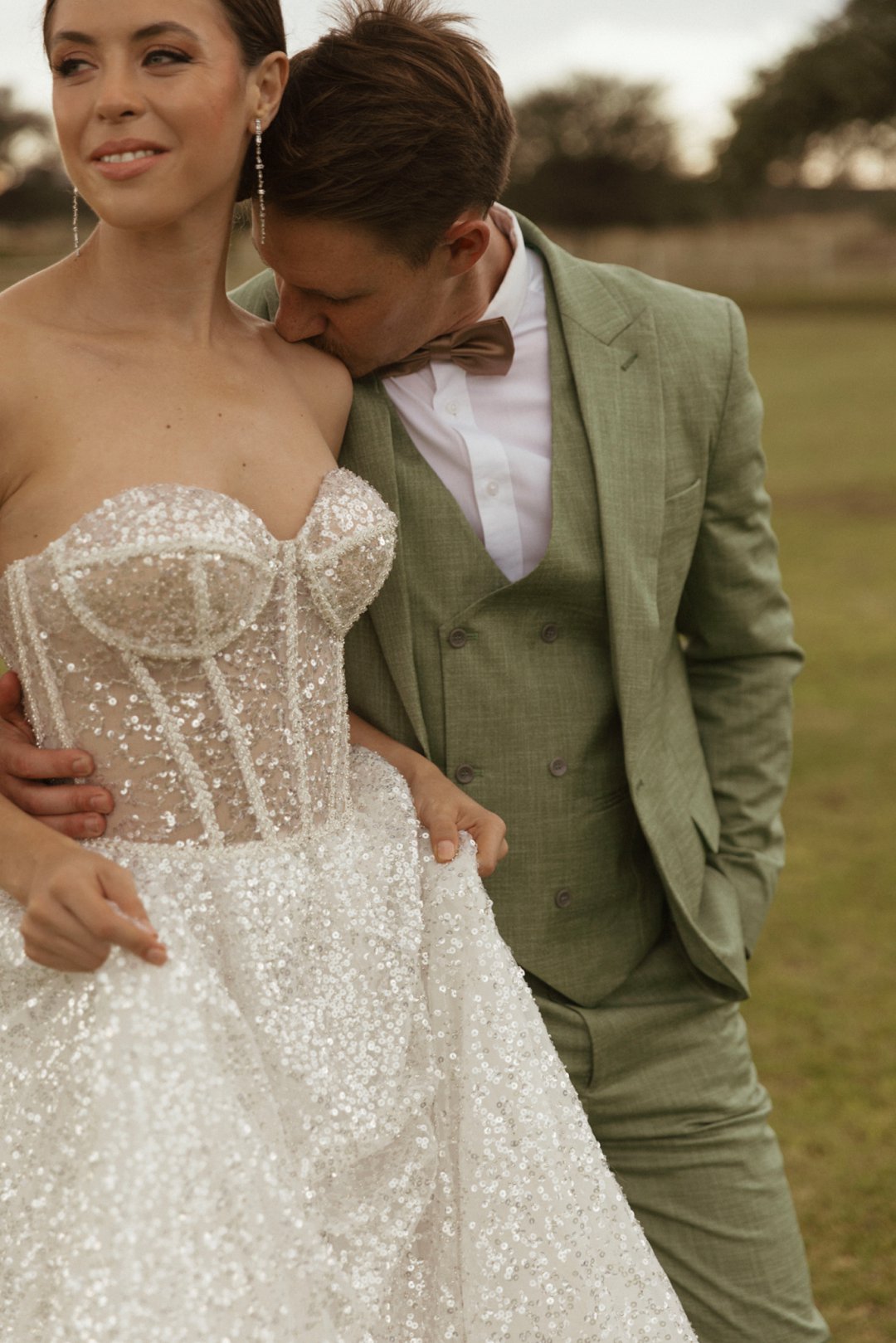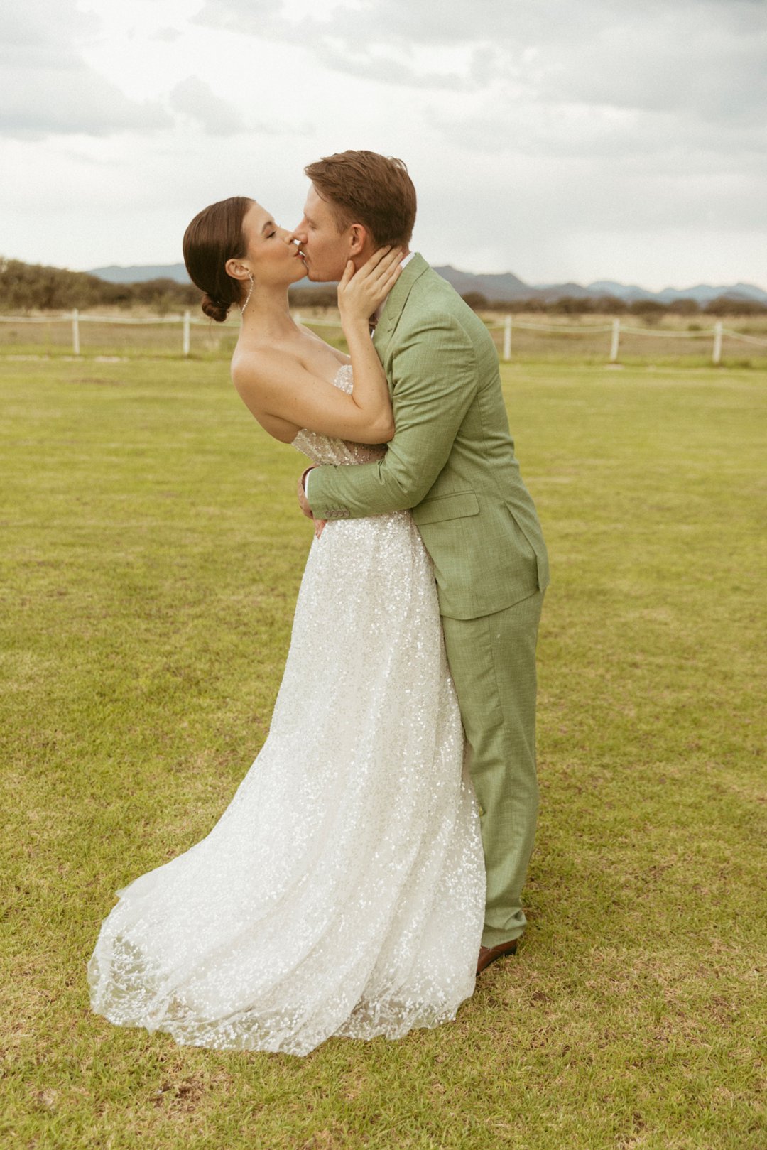 Die ryk toon van olyfgroen is die perfekte kleur vir die bruidegom se pak. ʼn Duidelike afwyking van tradisionele pak keuses, wat die tema van “Fruity & Floral” weerspieël. In ʼn doelbewuste afwyking van tradisionele drag, dien hierdie onkonvensionele keuse as ʼn gewaagde uitdrukking van persoonlikheid en styl. Aardse skakering straal ʼn gevoel van natuurlike sofistikasie uit, wat die elegansie van die trourok perfek komplementeer terwyl dit ʼn verfrissende kinkel byvoeg.