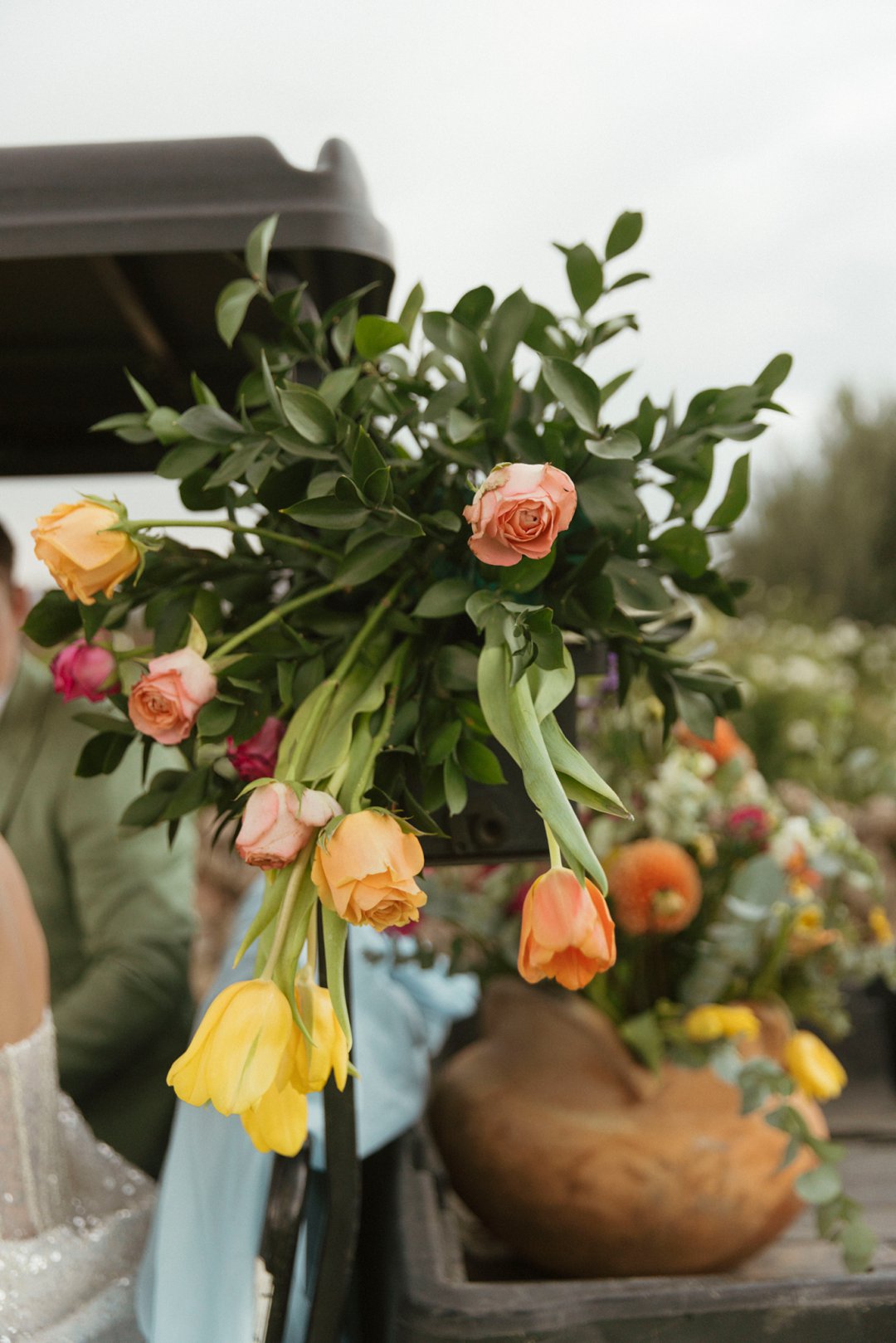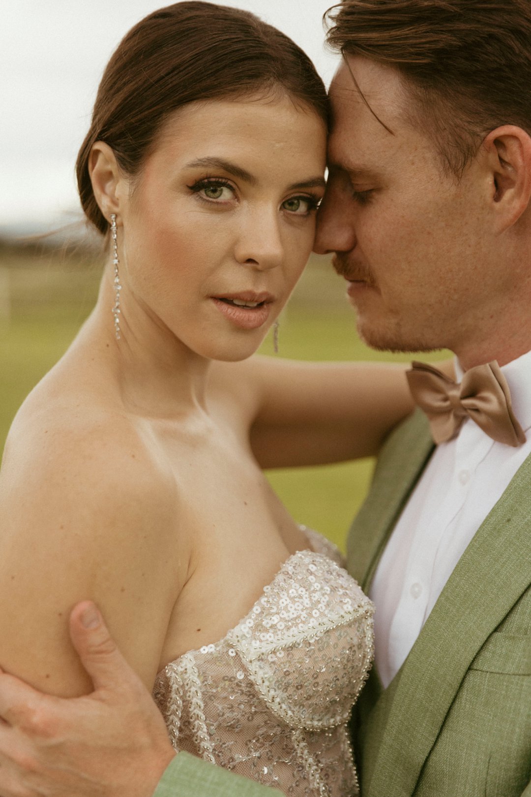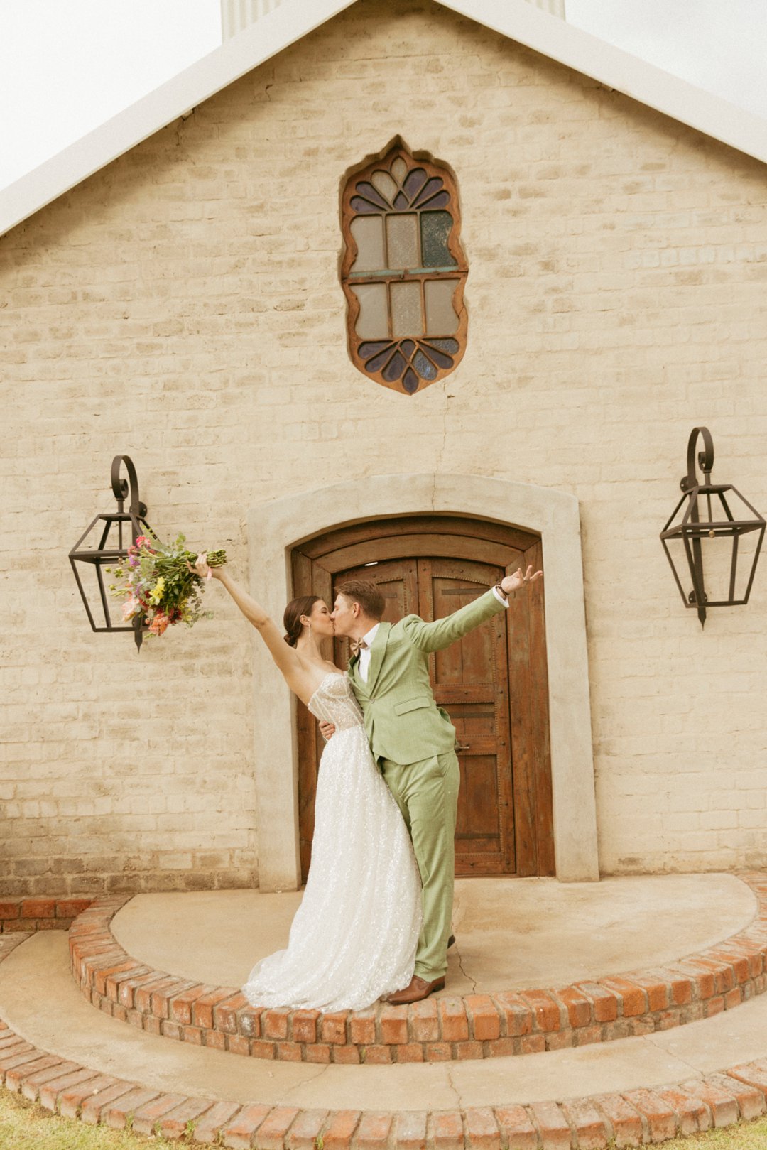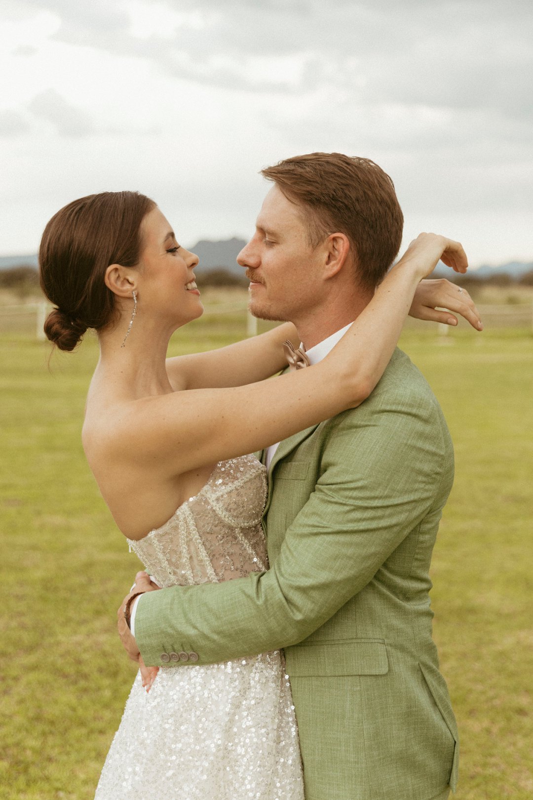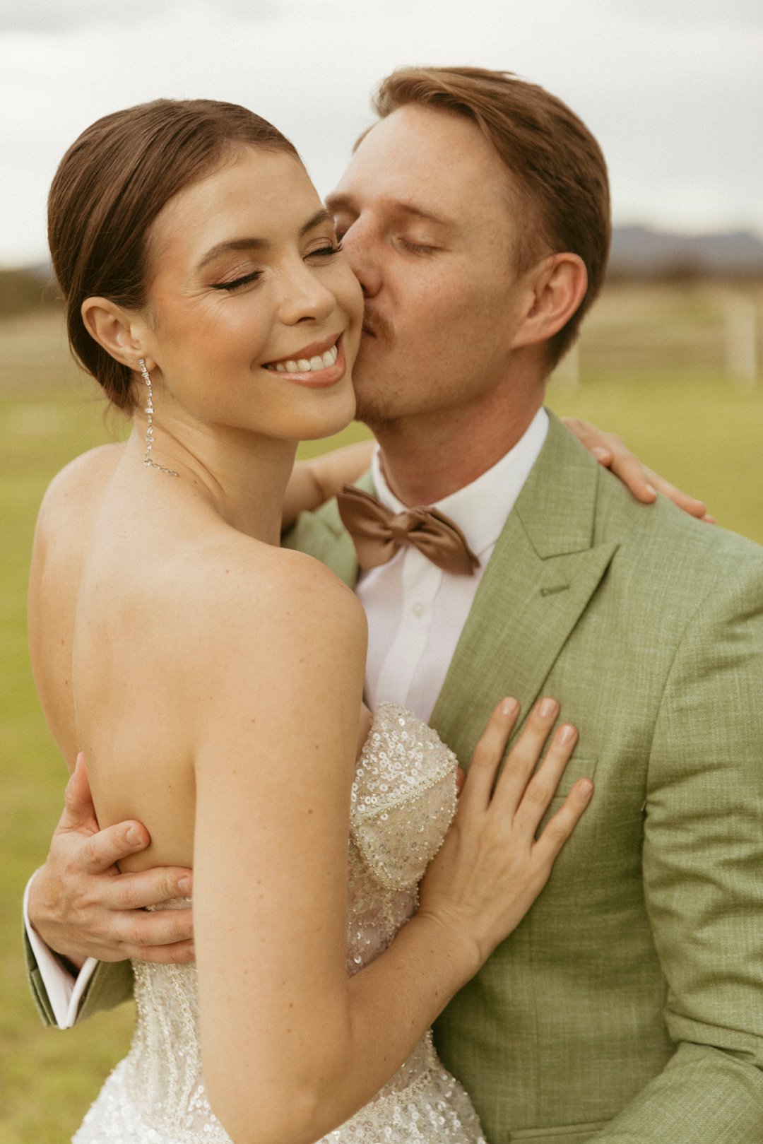 Die ryk toon van olyfgroen is die perfekte kleur vir die bruidegom se pak. ʼn Duidelike afwyking van tradisionele pak keuses, wat die tema van “Fruity & Floral” weerspieël. In ʼn doelbewuste afwyking van tradisionele drag, dien hierdie onkonvensionele keuse as ʼn gewaagde uitdrukking van persoonlikheid en styl. Aardse skakering straal ʼn gevoel van natuurlike sofistikasie uit, wat die elegansie van die trourok perfek komplementeer terwyl dit ʼn verfrissende kinkel byvoeg.