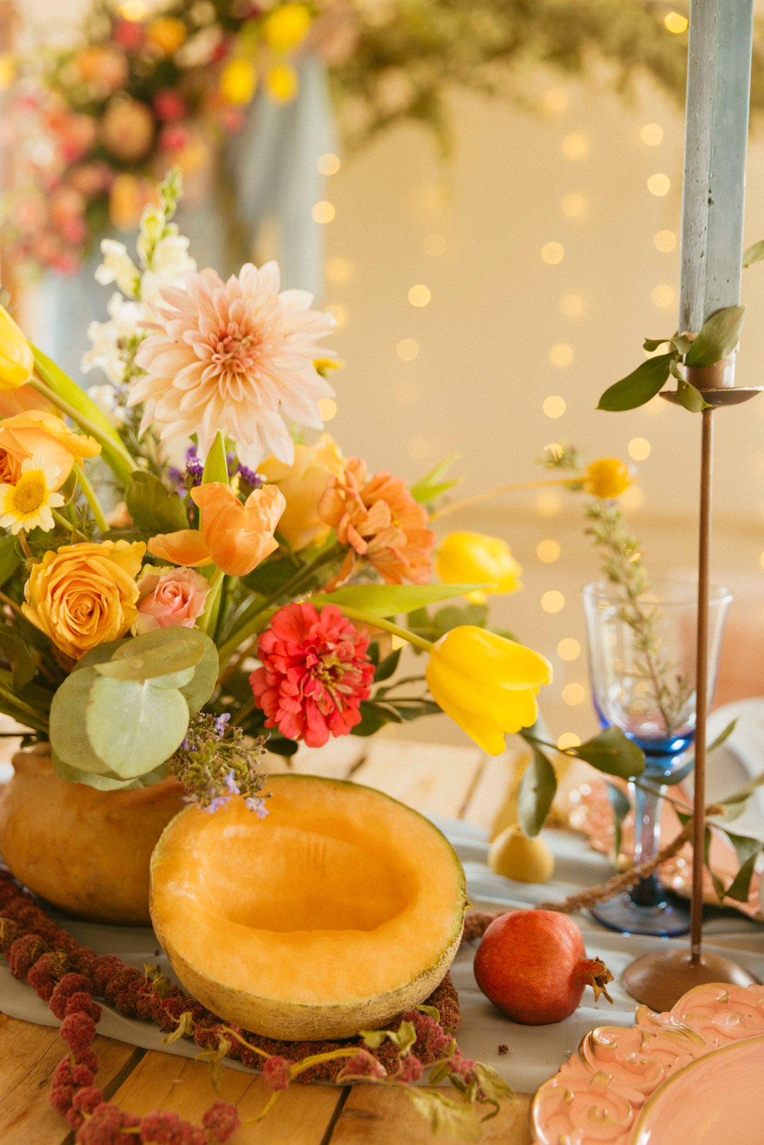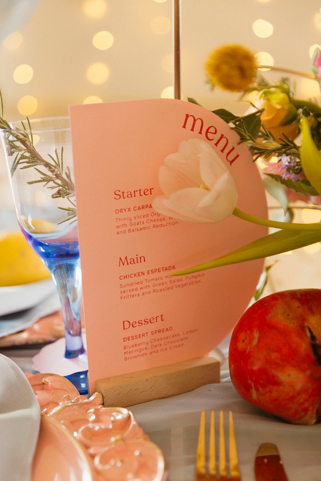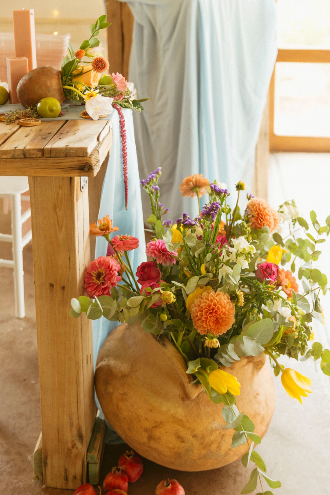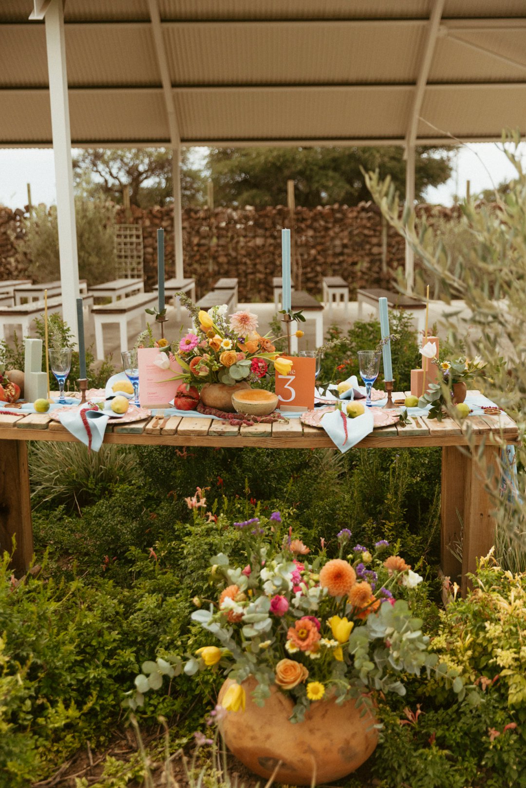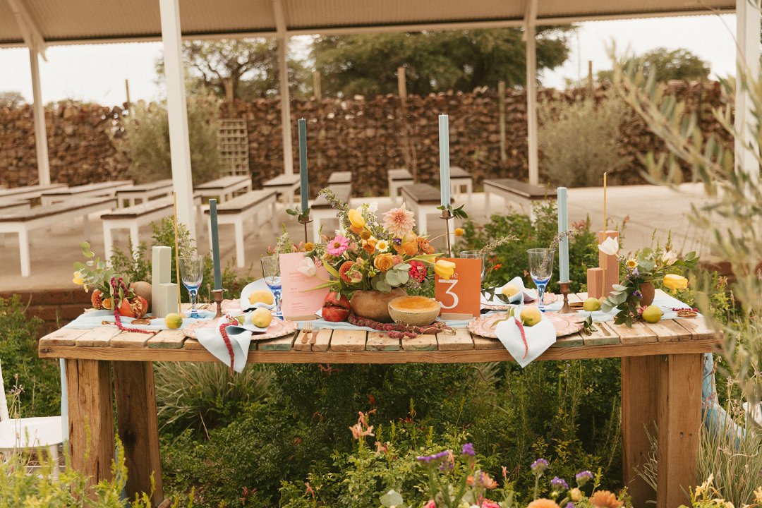 Hout tafels is bedek met kleurvolle dekor elemente. Kombinasie van kleurvolle helder blom ontwerpe en vars vrugte soos spanspek, suurlemoen en granaat. Handgemaakte klei potte vanuit Namibië was gebruik vir die blom ontwerpe. Dié potte pas perfek by die dekor elemente en ʼn pragtige balans geskep het vir die helder kleure. Skakerings van pienke en bloue kan ook op die tafel gesien word in die loper en materiaal servette.