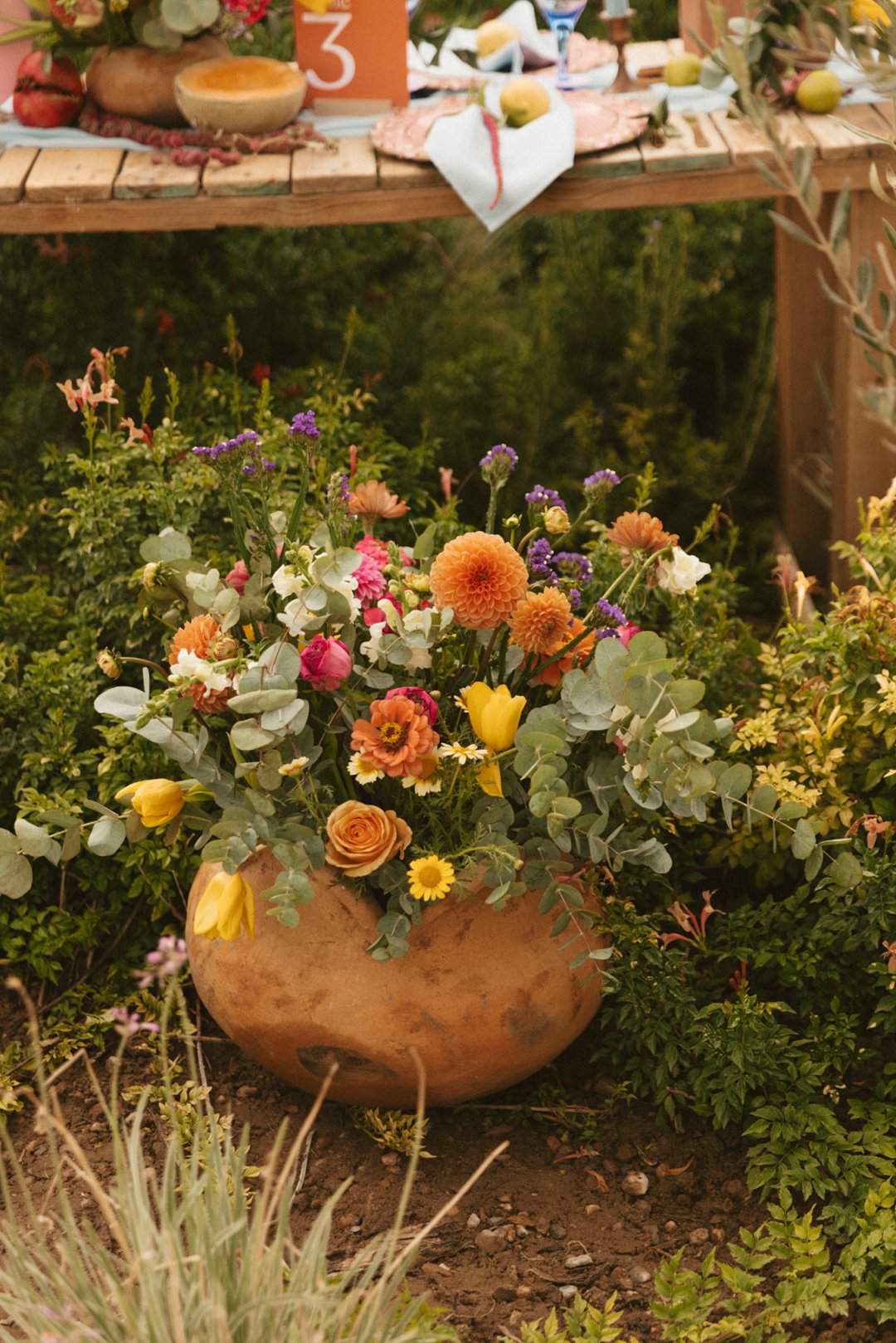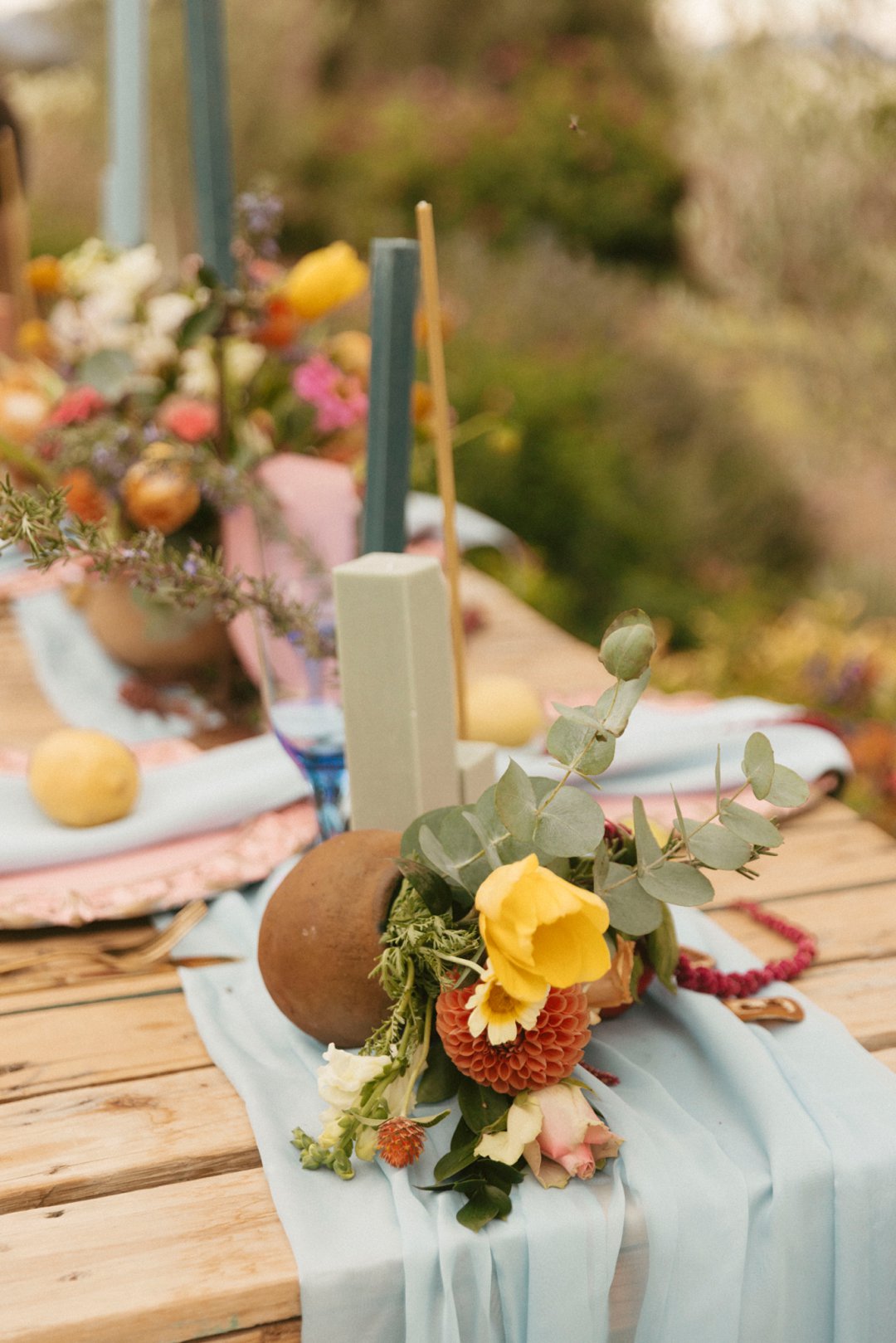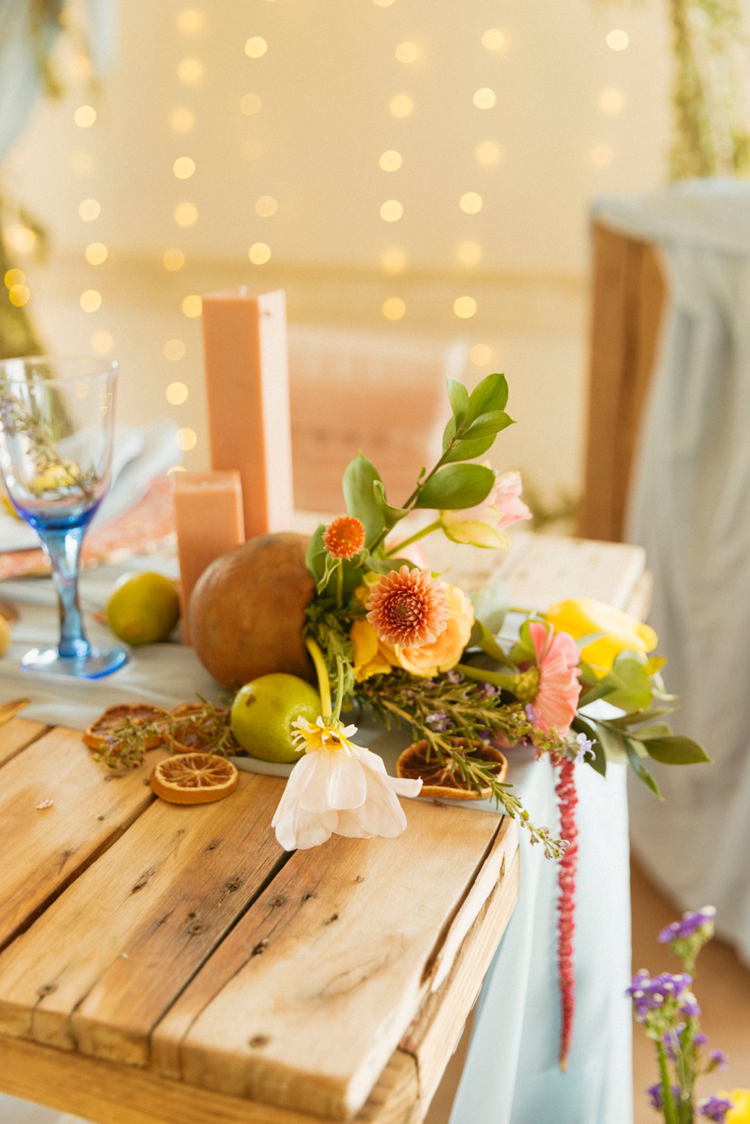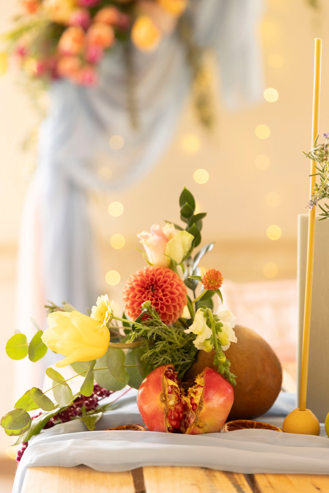 Hout tafels is bedek met kleurvolle dekor elemente. Kombinasie van kleurvolle helder blom ontwerpe en vars vrugte soos spanspek, suurlemoen en granaat. Handgemaakte klei potte vanuit Namibië was gebruik vir die blom ontwerpe. Dié potte pas perfek by die dekor elemente en ʼn pragtige balans geskep het vir die helder kleure. Skakerings van pienke en bloue kan ook op die tafel gesien word in die loper en materiaal servette.