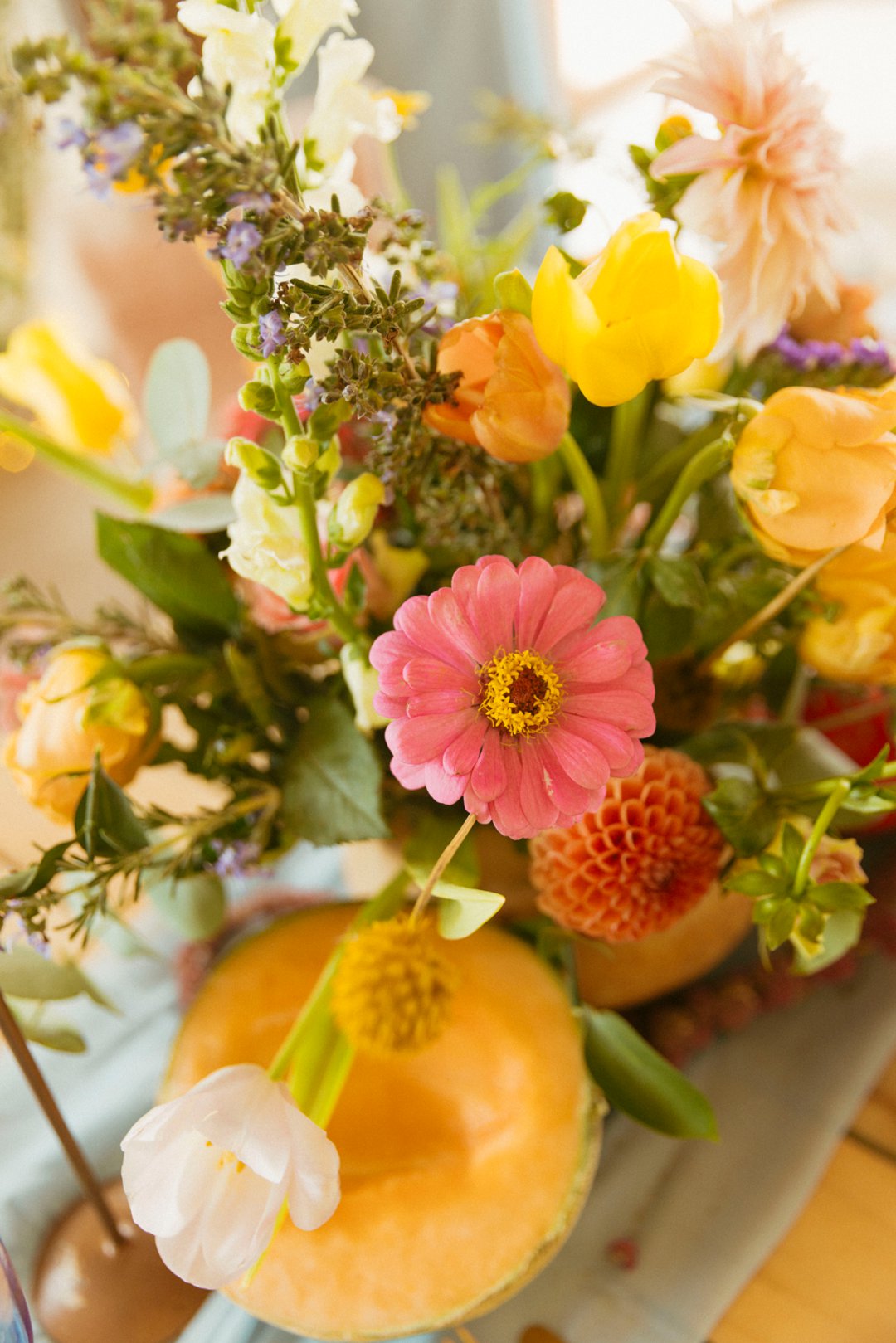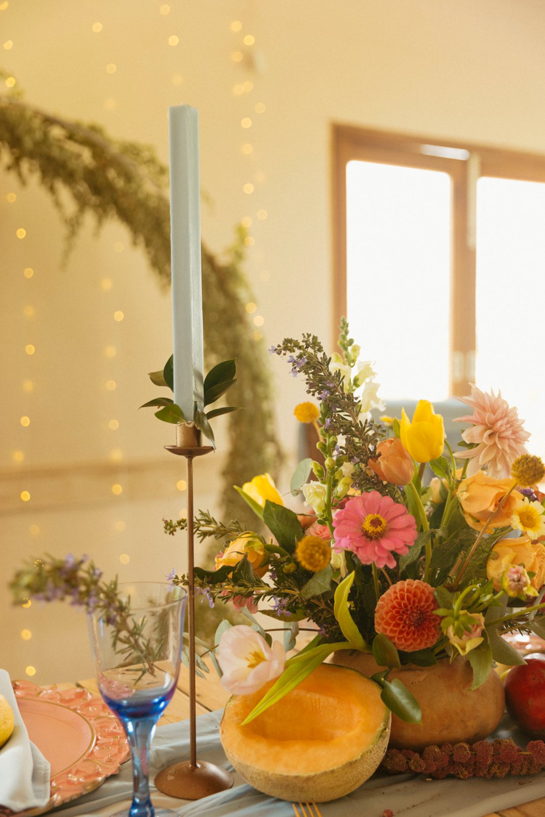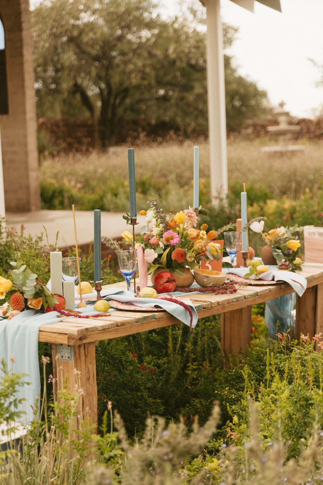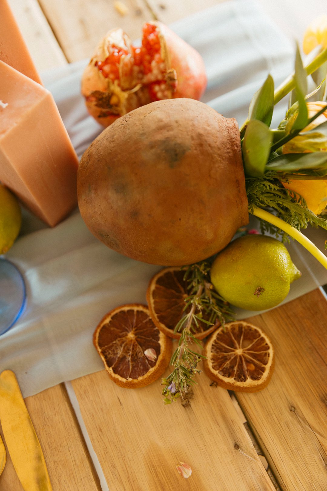 Hout tafels is bedek met kleurvolle dekor elemente. Kombinasie van kleurvolle helder blom ontwerpe en vars vrugte soos spanspek, suurlemoen en granaat. Handgemaakte klei potte vanuit Namibië was gebruik vir die blom ontwerpe. Dié potte pas perfek by die dekor elemente en ʼn pragtige balans geskep het vir die helder kleure. Skakerings van pienke en bloue kan ook op die tafel gesien word in die loper en materiaal servette.
