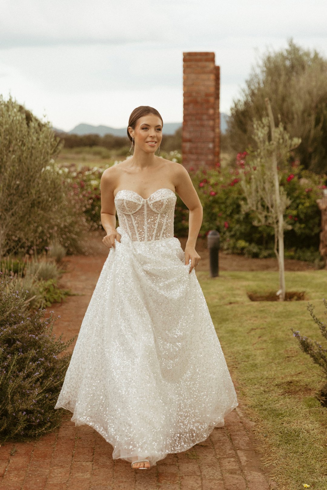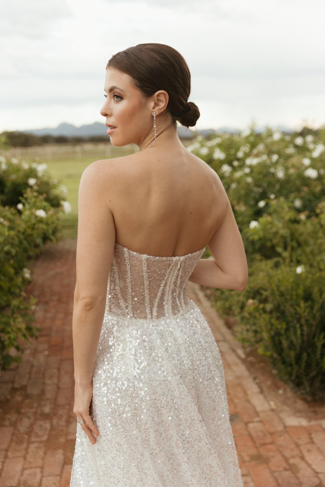 Omrede die dekor baie helder is het ons besluit dat ons ʼn klassieke styl trourok wil hê, maar wat nogsteeds ʼn indruk maak. Hierdie pragtige trourok beklemtoon ʼn klassieke styl met ʼn moderne kinkel. Die skoon lyne en minimalistiese silhoeët laat die bruid toe om selfvertroue uit te straal. Hierdie trourok se “sequins” detail afwerking gee die rok lewe. Blink wat in die lig dans as die bruid rond beweeg. Hierdie trourok was perfek vir ons fotosessie en is nie net ʼn kledingstuk nie; dit is ʼn viering van vroulikheid, elegansie en die tydlose aanloklikheid in die wêreld van trourokke.