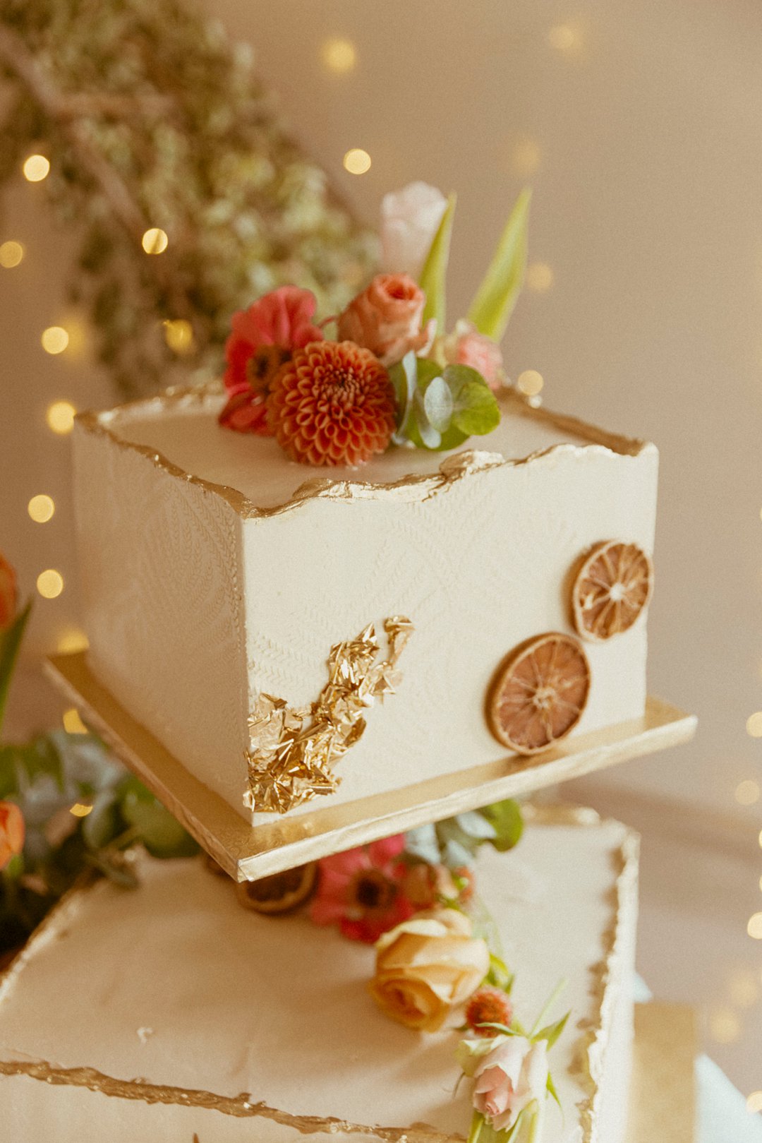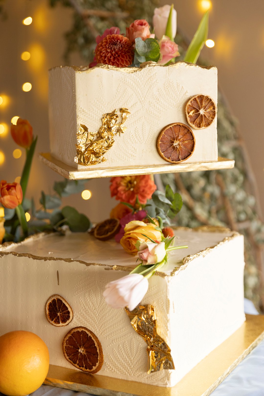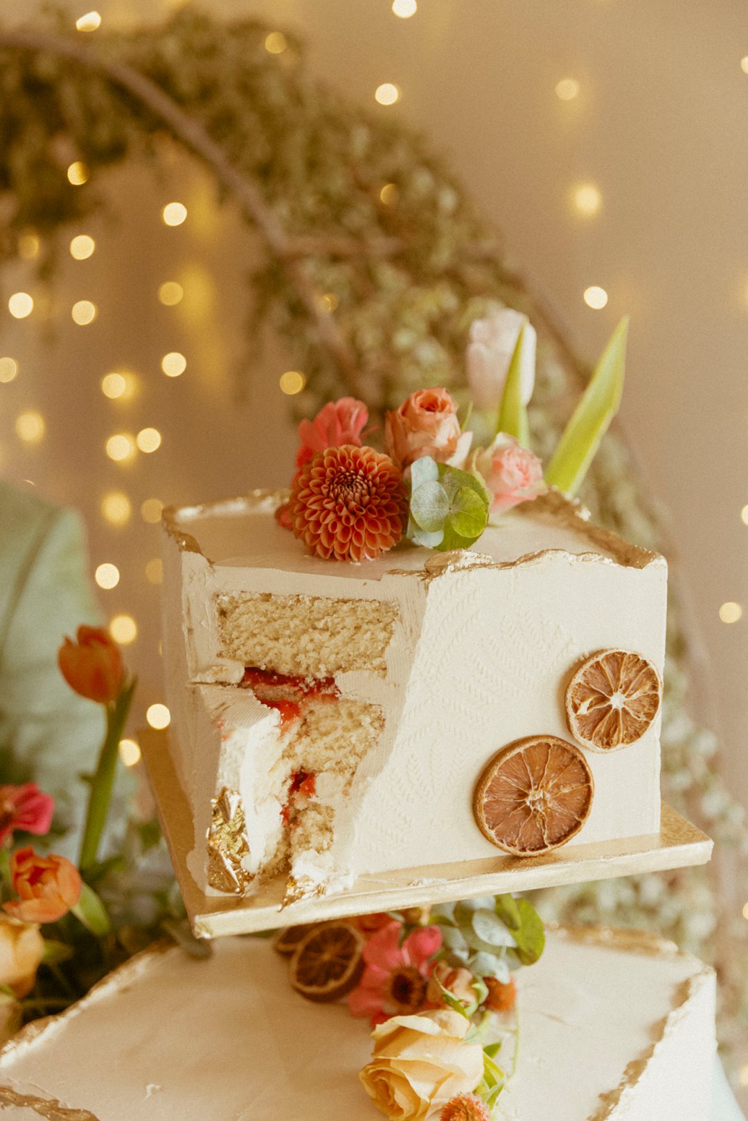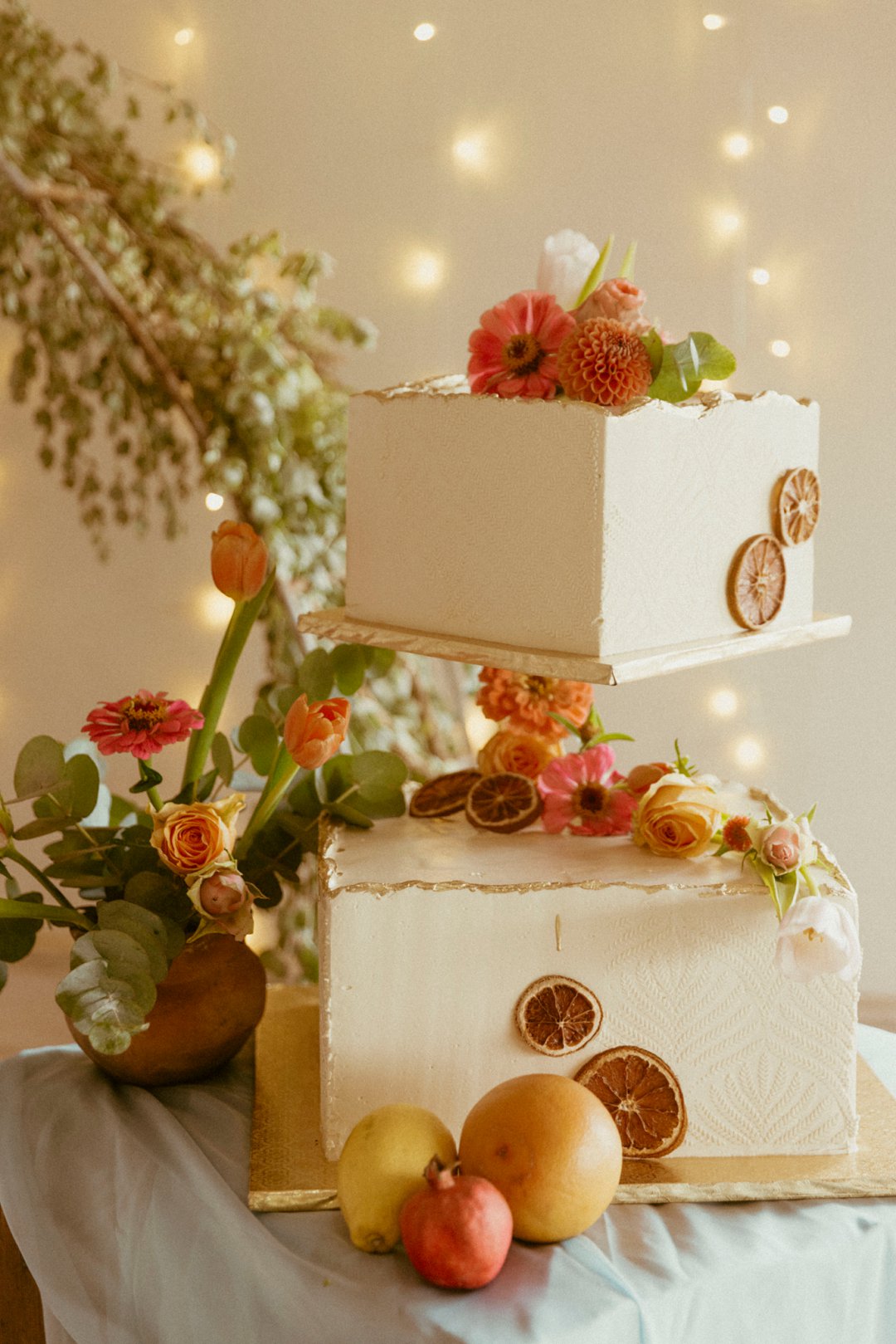 Die troukoek is van twee lae. Versier met blomme en gedroogte suurlemoen wat alles net só mooi laat invloei by die res van die dekor elemente.
