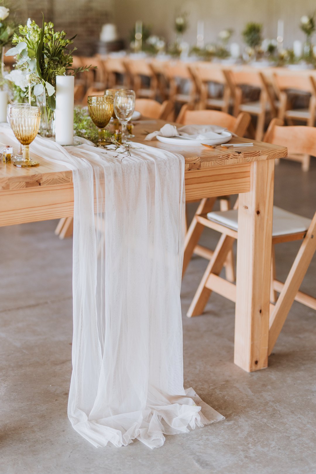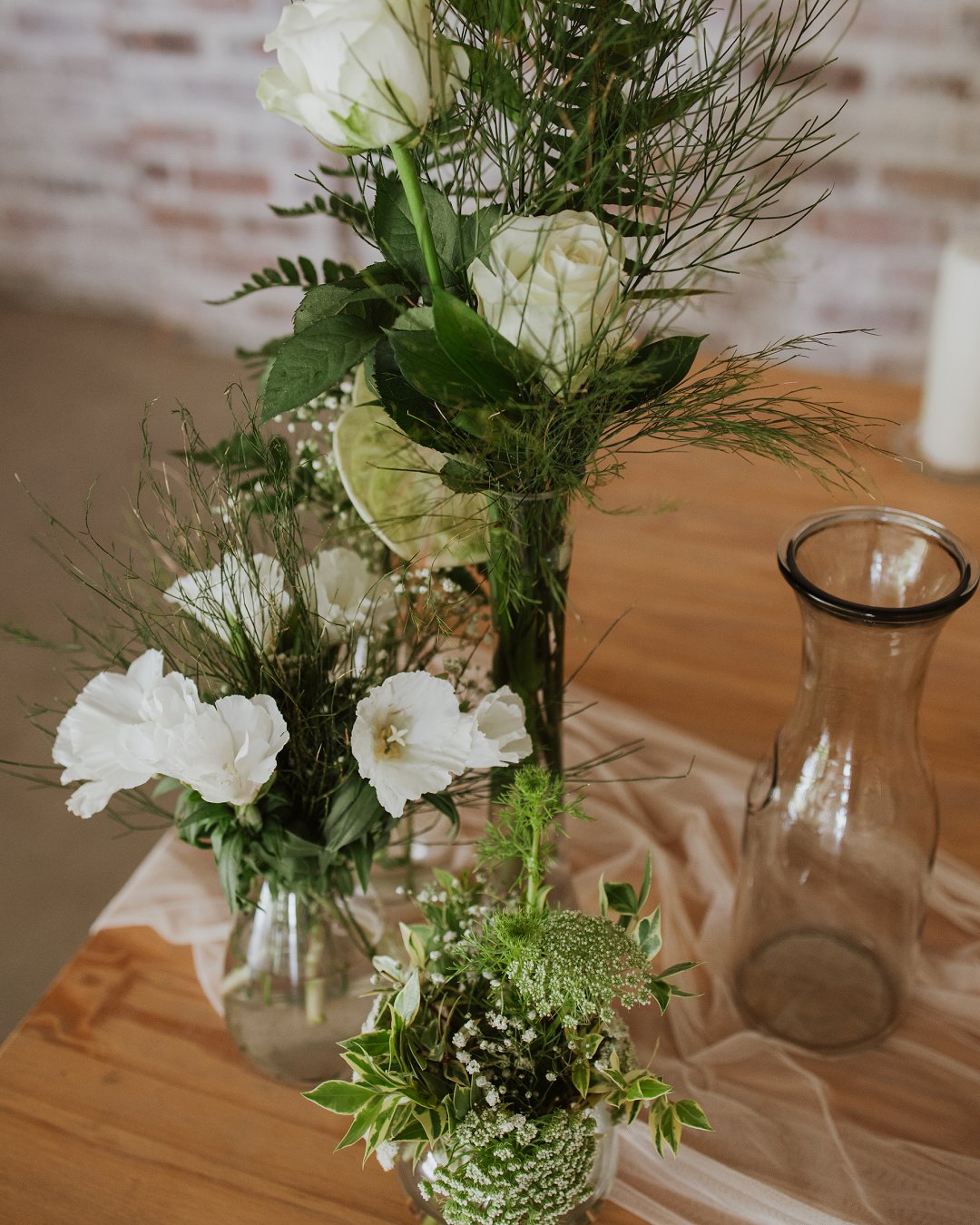 In die onthaal lokaal was gaste tafels versier met ʼn neutrale kleur palet van groen en wit, wat só mooi gepas het by die tydlose gevoel van die paartjie se troue. Ons hou baie van die skoon lyne en amper simplistiese voorkoms van die paartjie se tafel dekor.