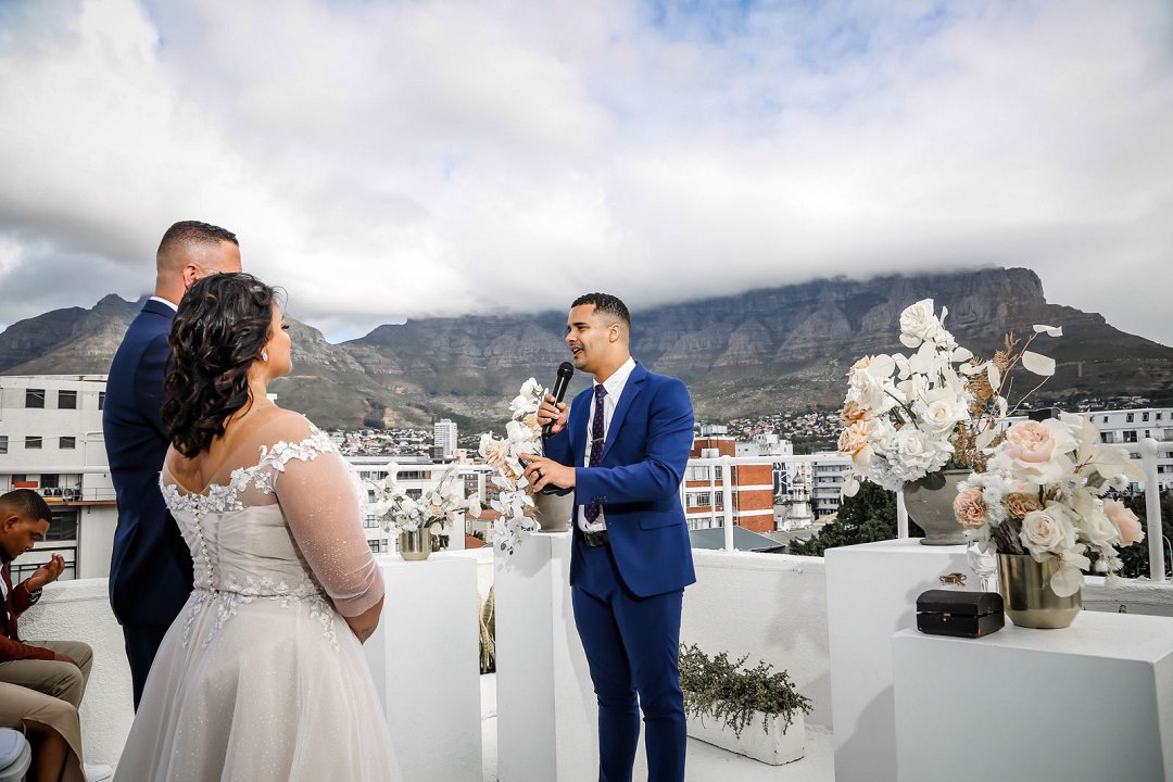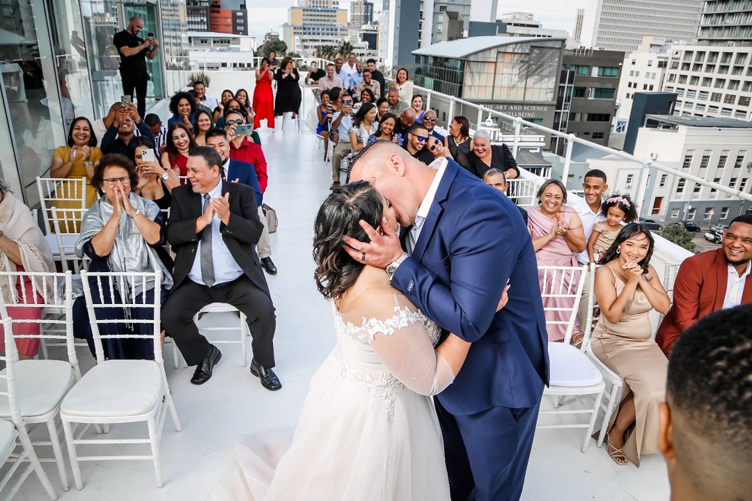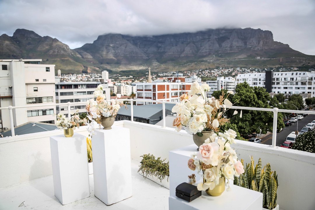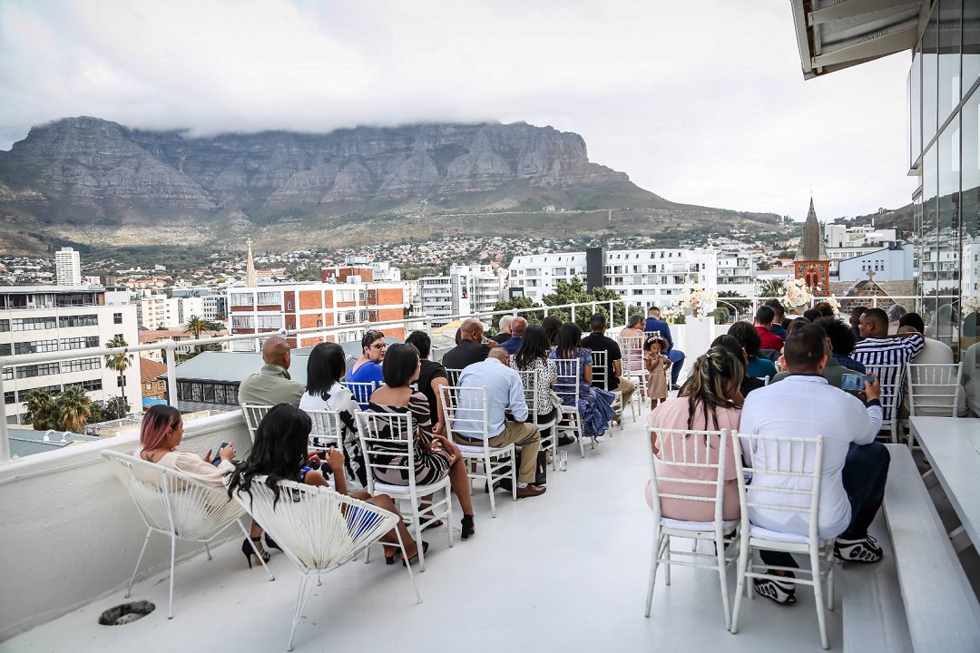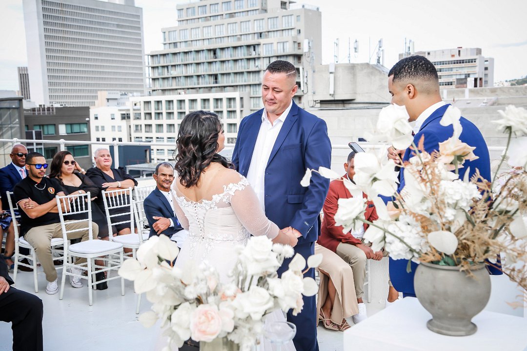 Chery en Lucian het die mooiste buitelug seremonie op die dak van die trou venue gehad. Die perfekte ligging vir prentjie mooi uitsigte oor Kaapstad se middestad met die mooiste uitsigte van Tafelberg, die stadslewe en geboue onder.