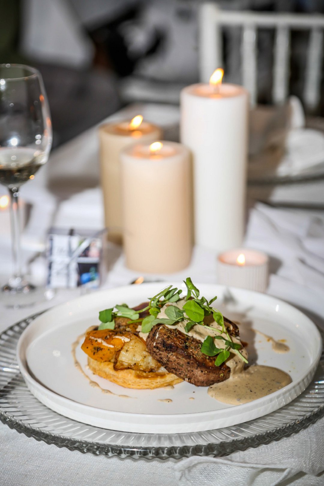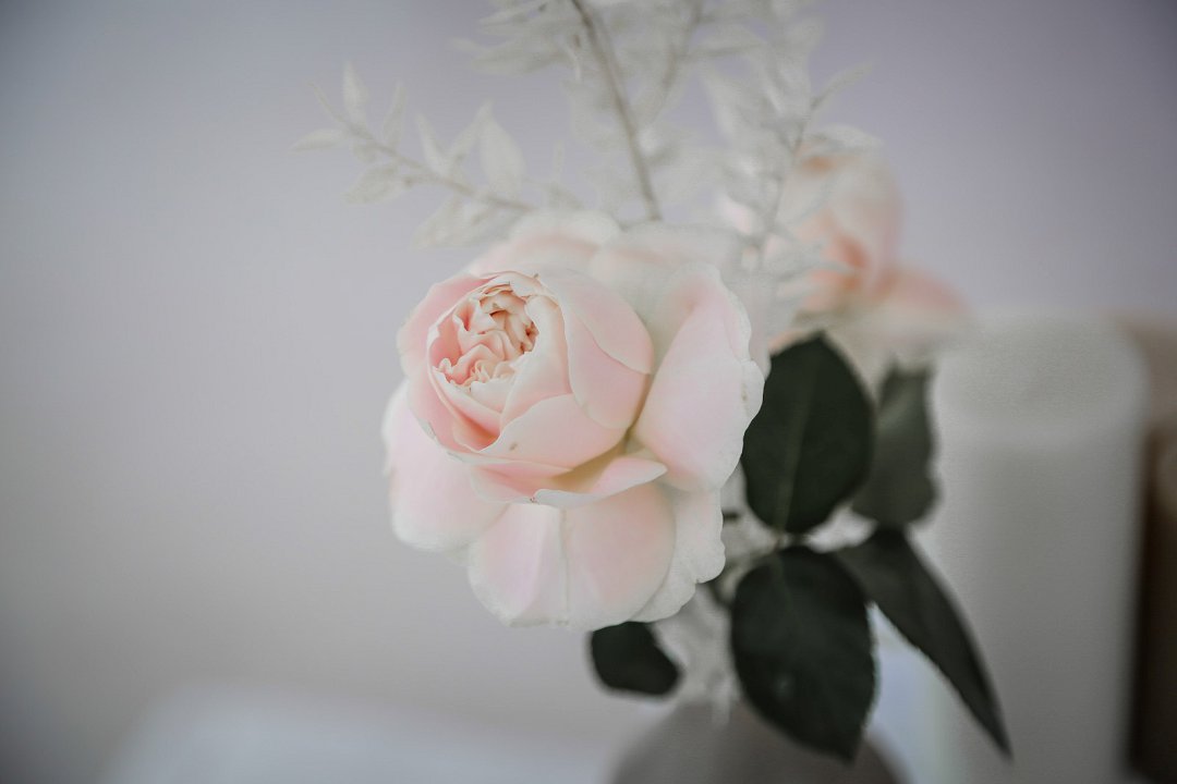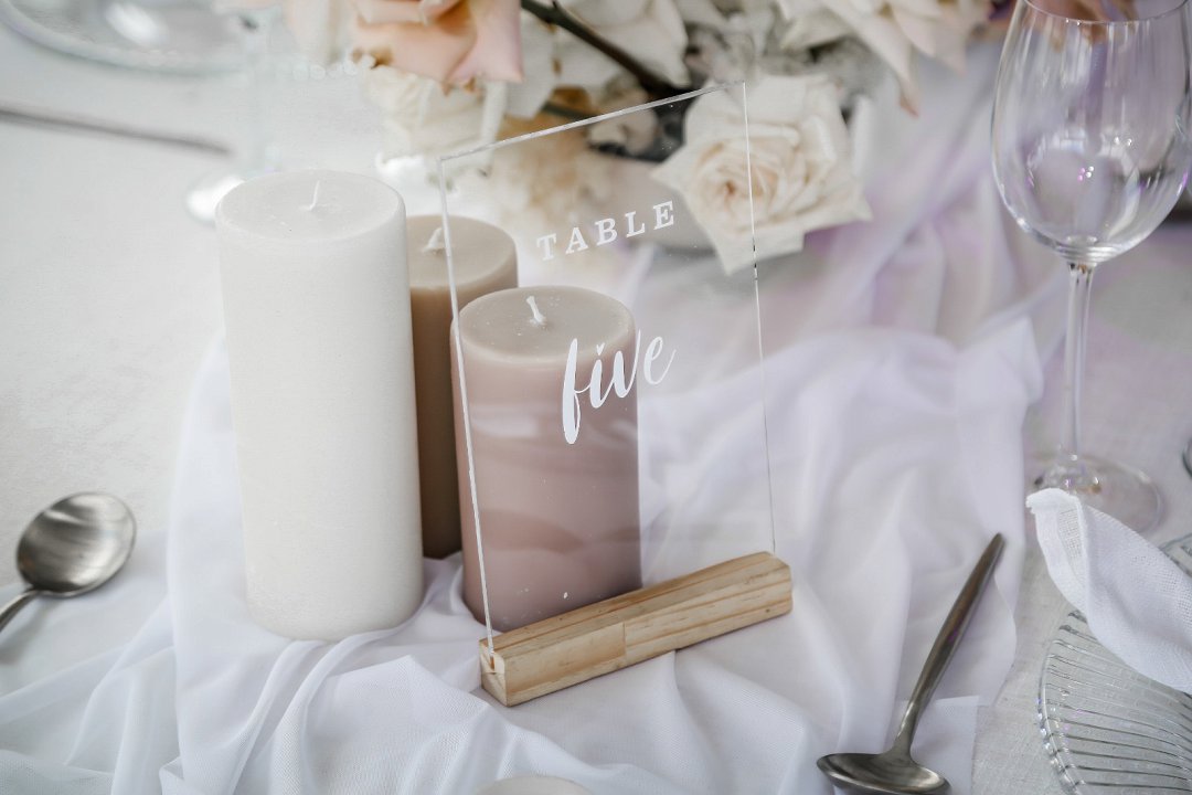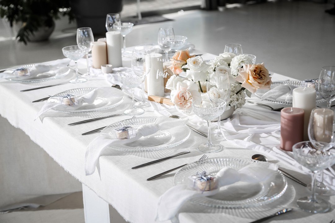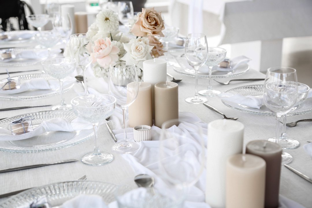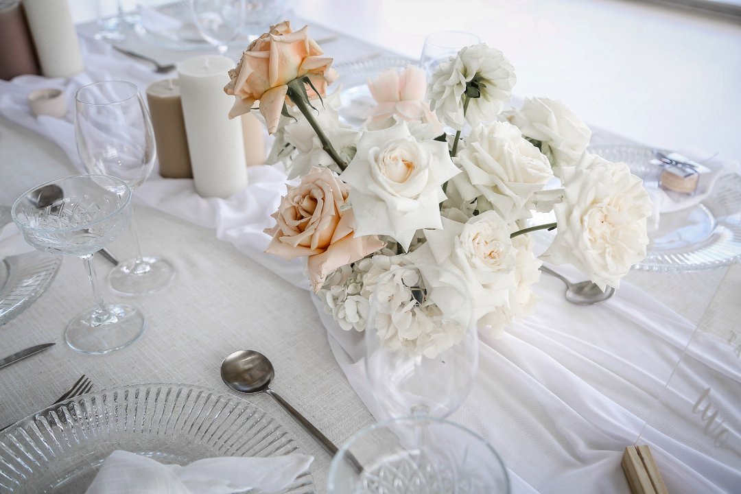 Dit was baie neutraal met wit. Wou dit sag en minimaal hou, maar nogsteeds elegant. Ek hou van min, maar ek hou van mooi. Die tafels was bedek met naaswit tafeldoeke met ʼn wit gaas tafelloper. Dan het ons wit, roomkleurige en mokka kleur kerse gehad en die mooiste blomme in die middel.